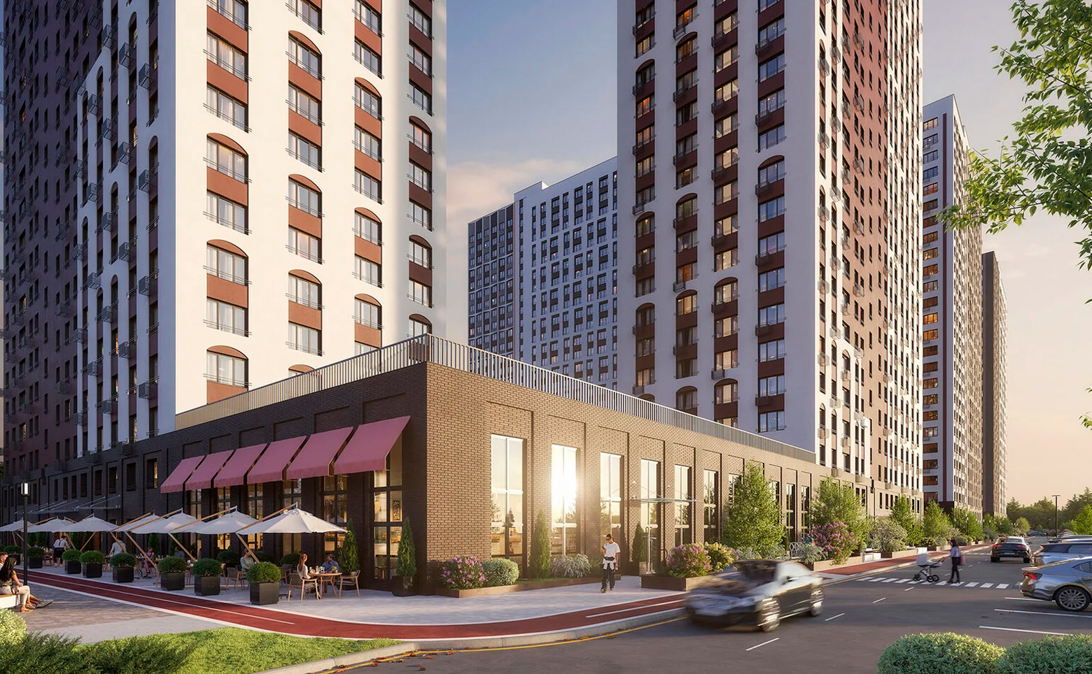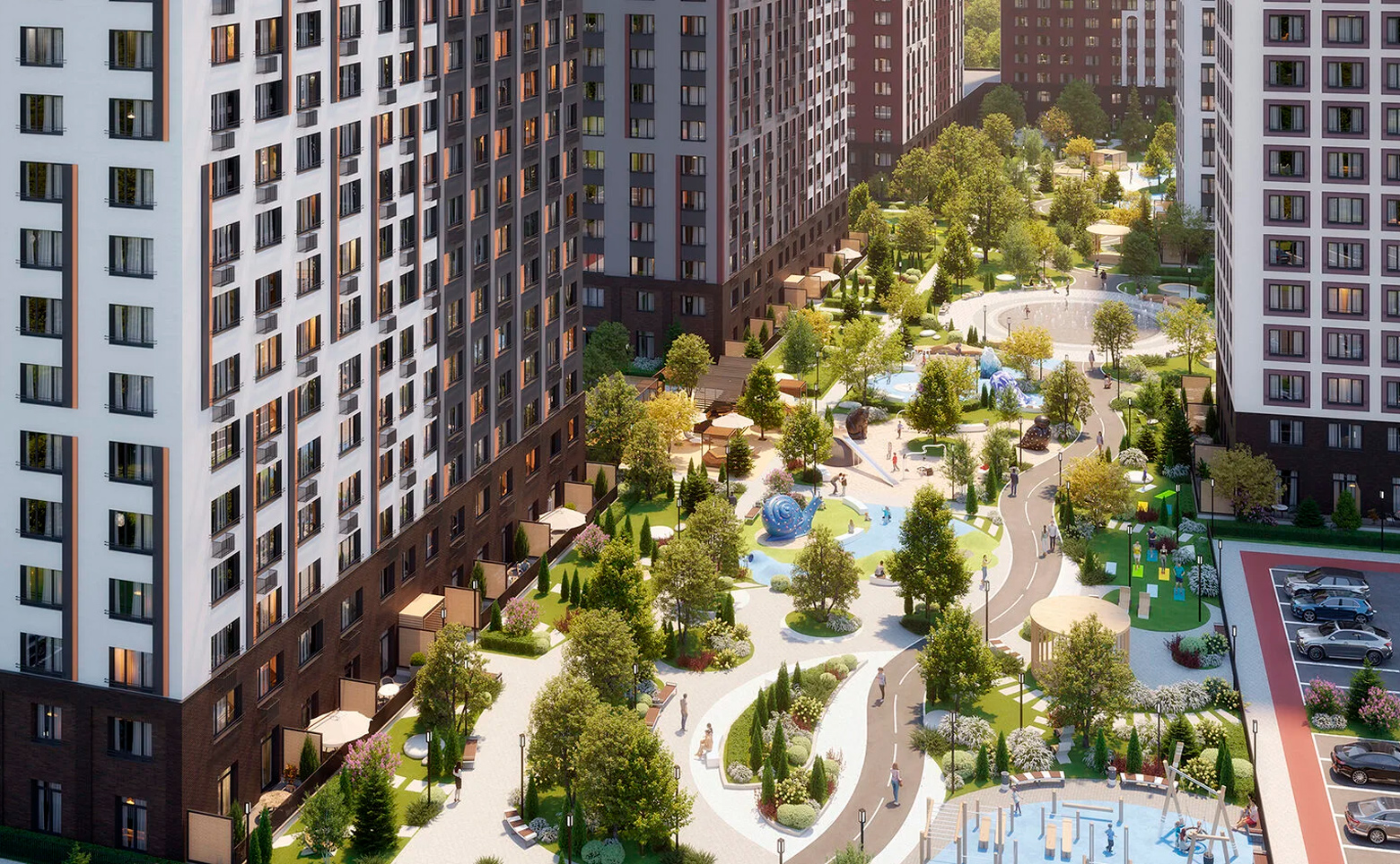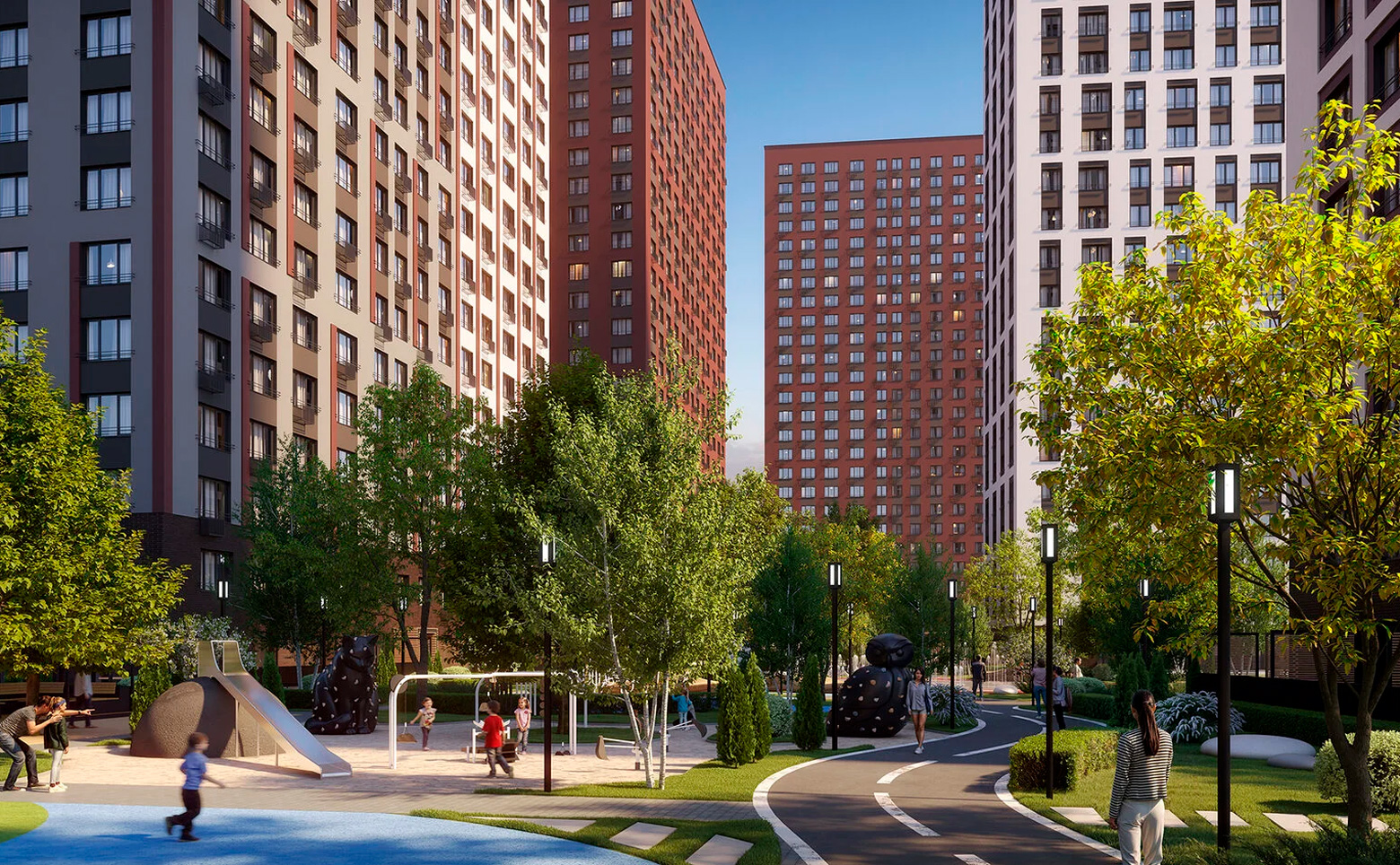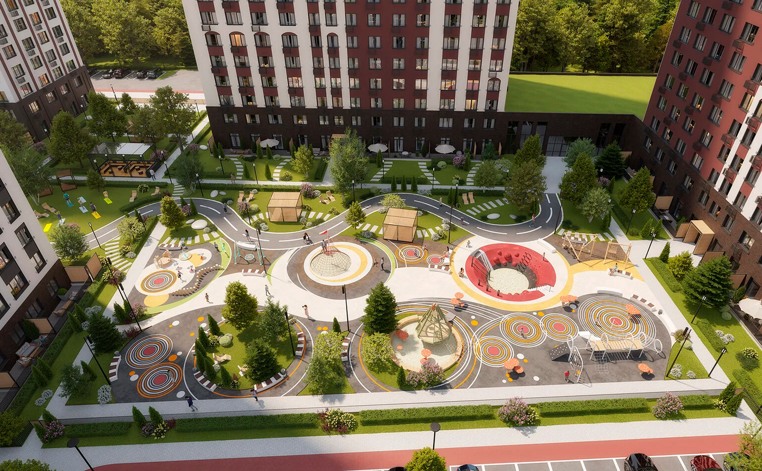 Внутренний двор закрыт от машин, на территории создано 22 тематических площадки: детские площадки, стадион, места для выгула собак, зона йоги, спортивные площадки. На территории ведется круглосуточное видеонаблюдение.