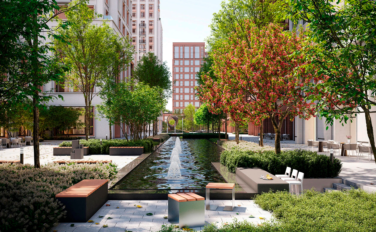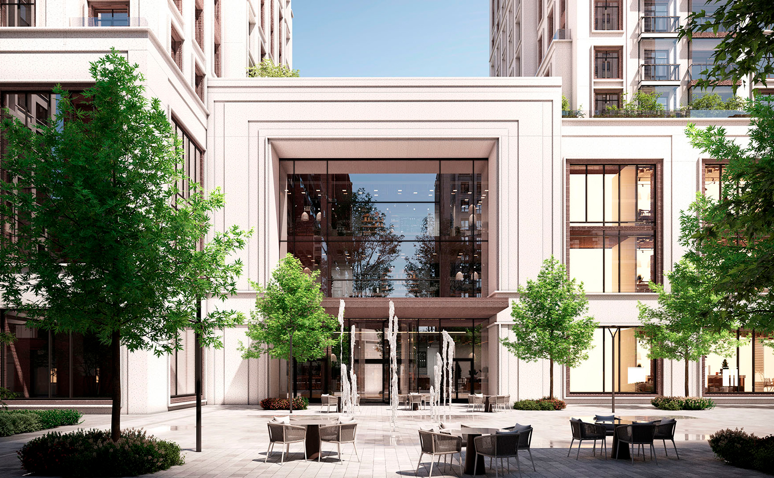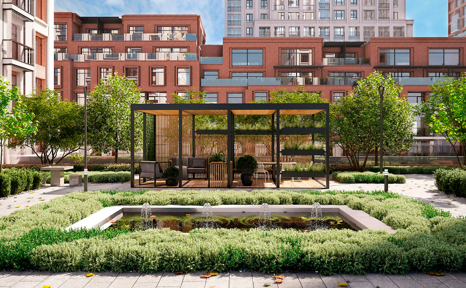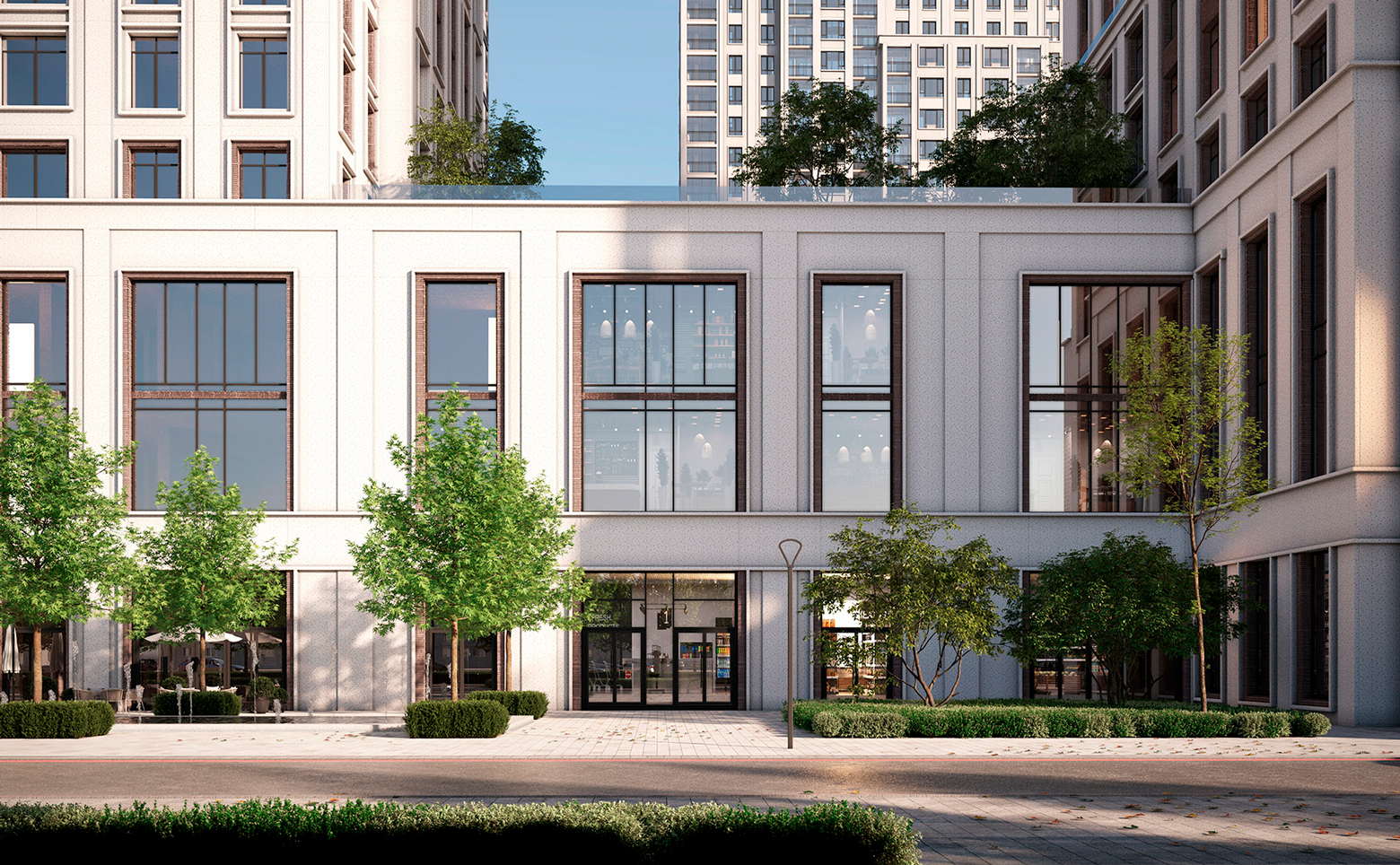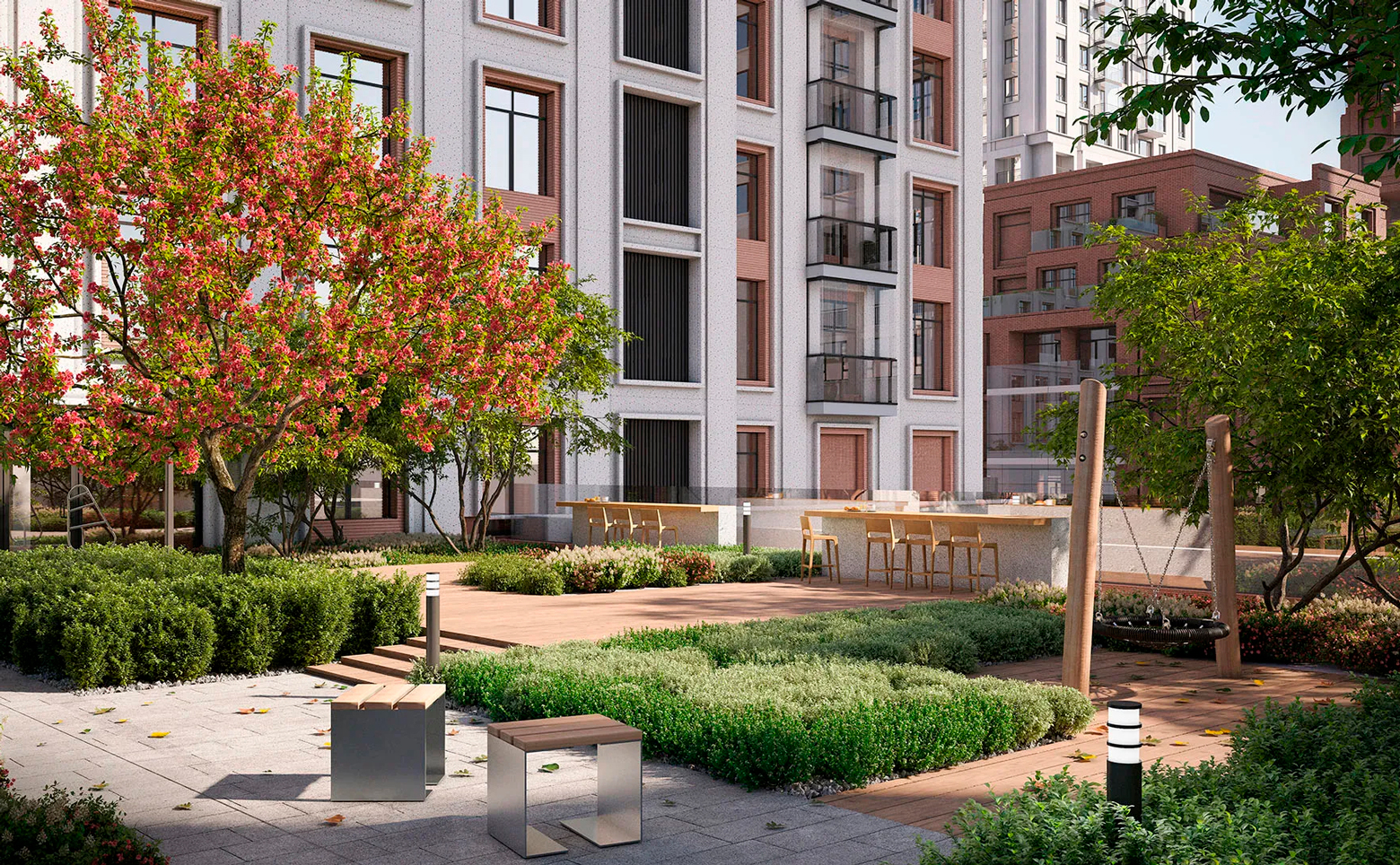 Квартал «МОНС» пронизан атмосферой локации, её энергетикой. Она воплощена в общей композиции, чистоте её форм, в графичных и динамичных силуэтных линиях. Пять домов поддерживают идею монументальности и одновременной лёгкости, но при этом у каждого из них сформировался свой характер. Пространство дворов спроектировано в стиле пэчворк, где каждая зона — яркий и самодостаточный «лоскут».