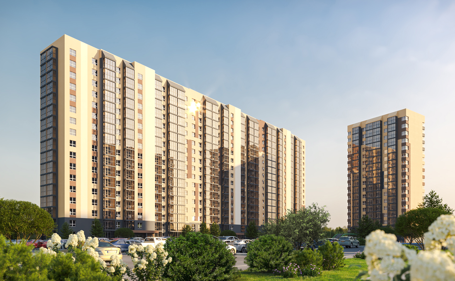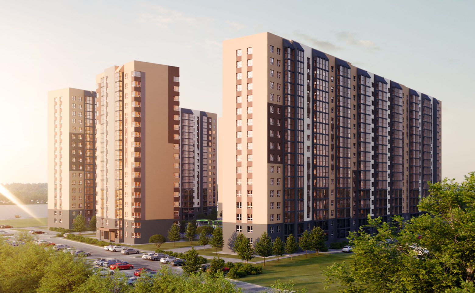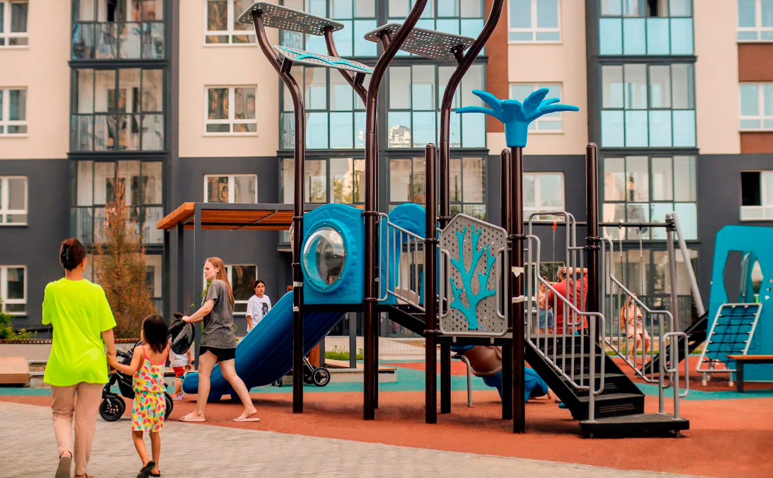В каждом дворе жилого комплекса установлены современные детские площадки для детей разного возраста, уличные тренажеры, а также спроектированы велодорожки и удобная навигация. На территории проекта обустроены футбольная и баскетбольная площадки, предусмотрено комфортное освещение, озеленение, благоустройство удобными пешеходными дорожками, скамейками и уютными беседками. Для владельцев автомобилей спроектирован наземный паркинг.