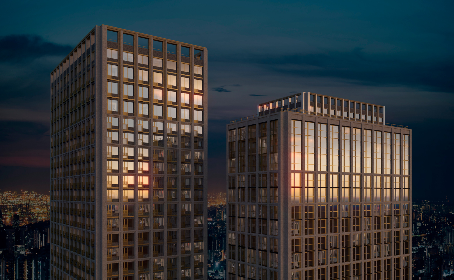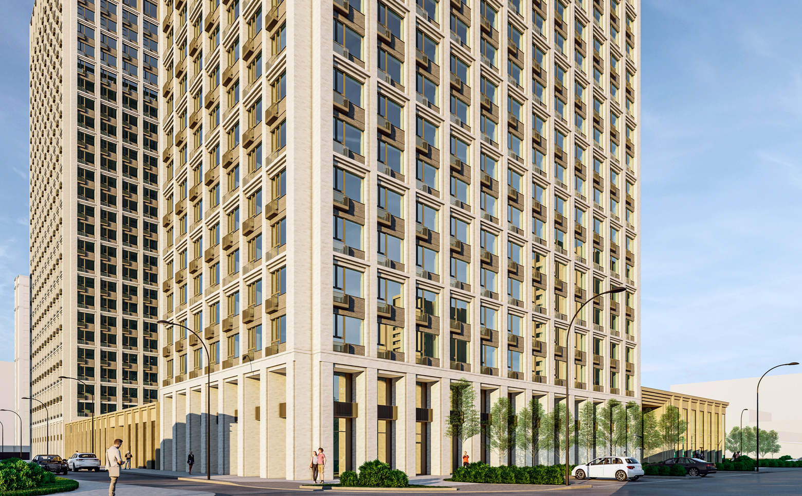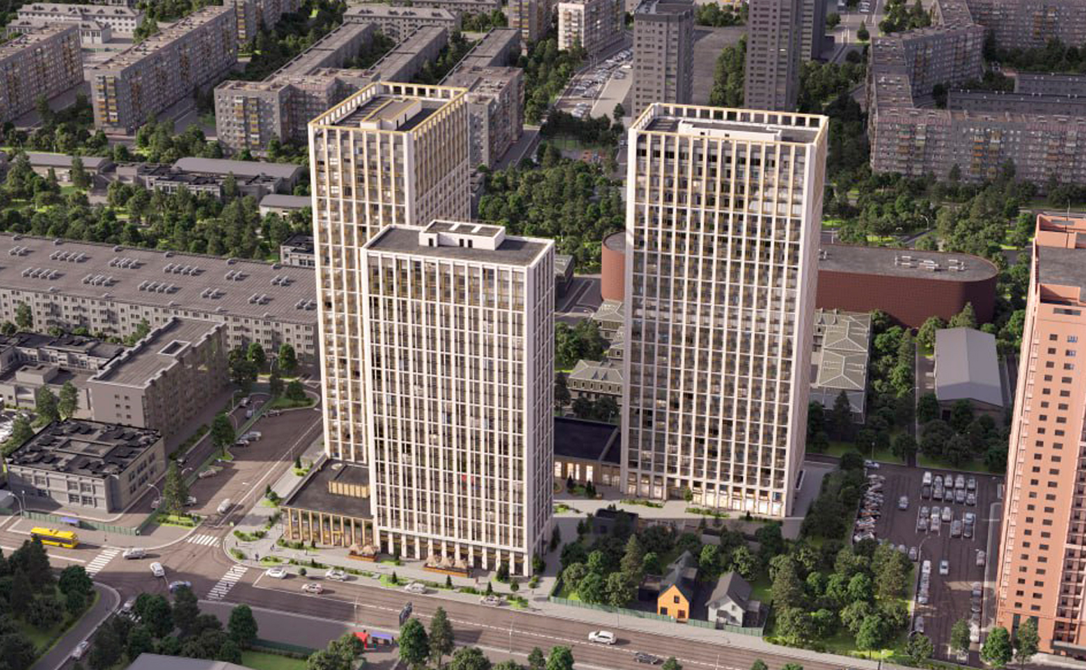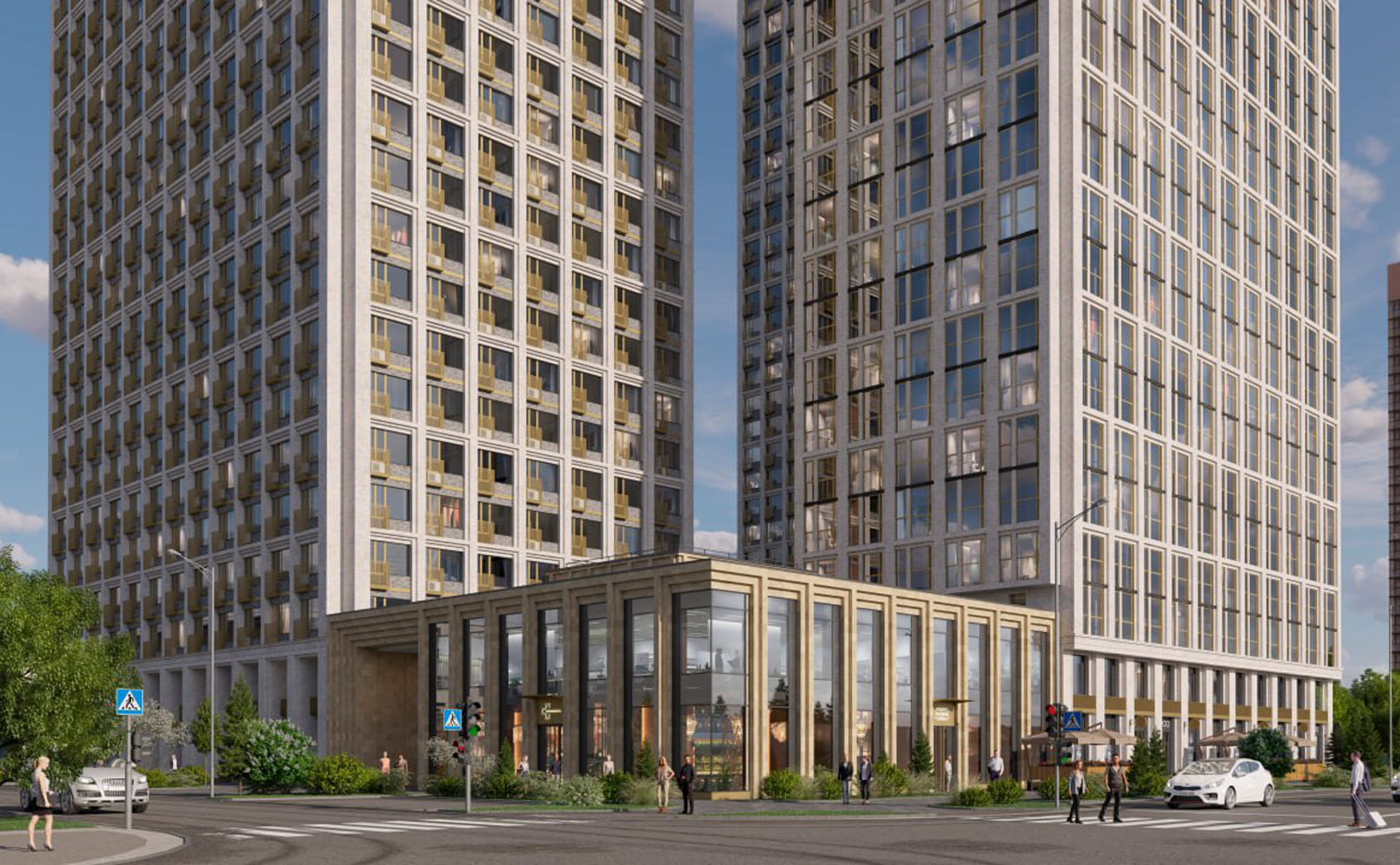 Жилой квартал представляет собой 3 многоэтажных башни, стилистика которых вдохновлена современными деловыми кварталами. Комплекс возведен по кирипчно-монолитной технологии, которая подчеркивает урбанистический стиль проекта. В корпусах предусмотрено лобби с ресепшеном, зоны для ожидания, кладовые и 4–6 скоростных лифтов.