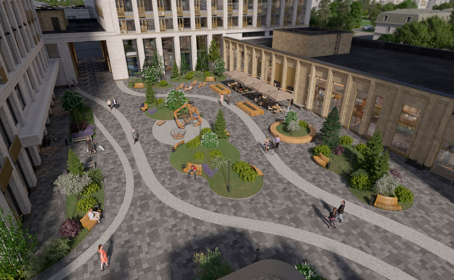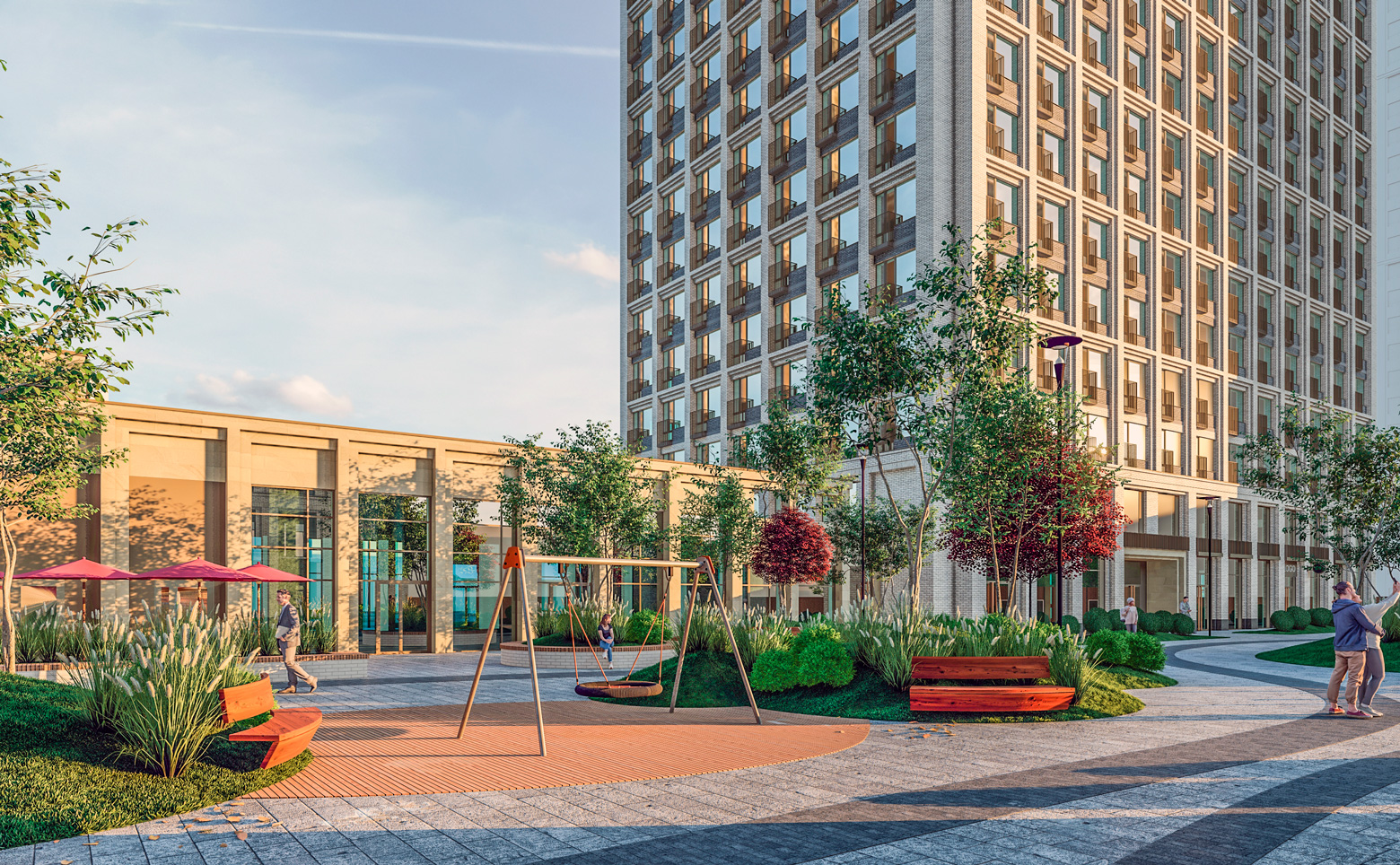 На территории комплекса расположены фитнес-центр, медицинская клиника, детский бассейн, кафе-коворкинг, магазины и зоны для отдыха. В комплексе есть собственная управляющая компания и услуги гостиничного сервиса. Для владельцев автомобилей предусмотрен двухуровневый подземный паркинг со станциями для зарядки электромобилей.