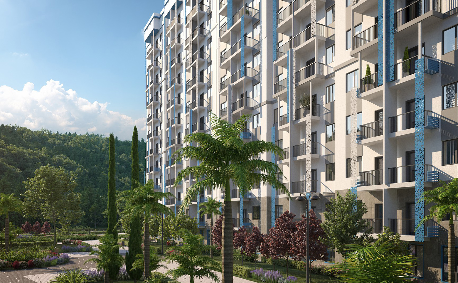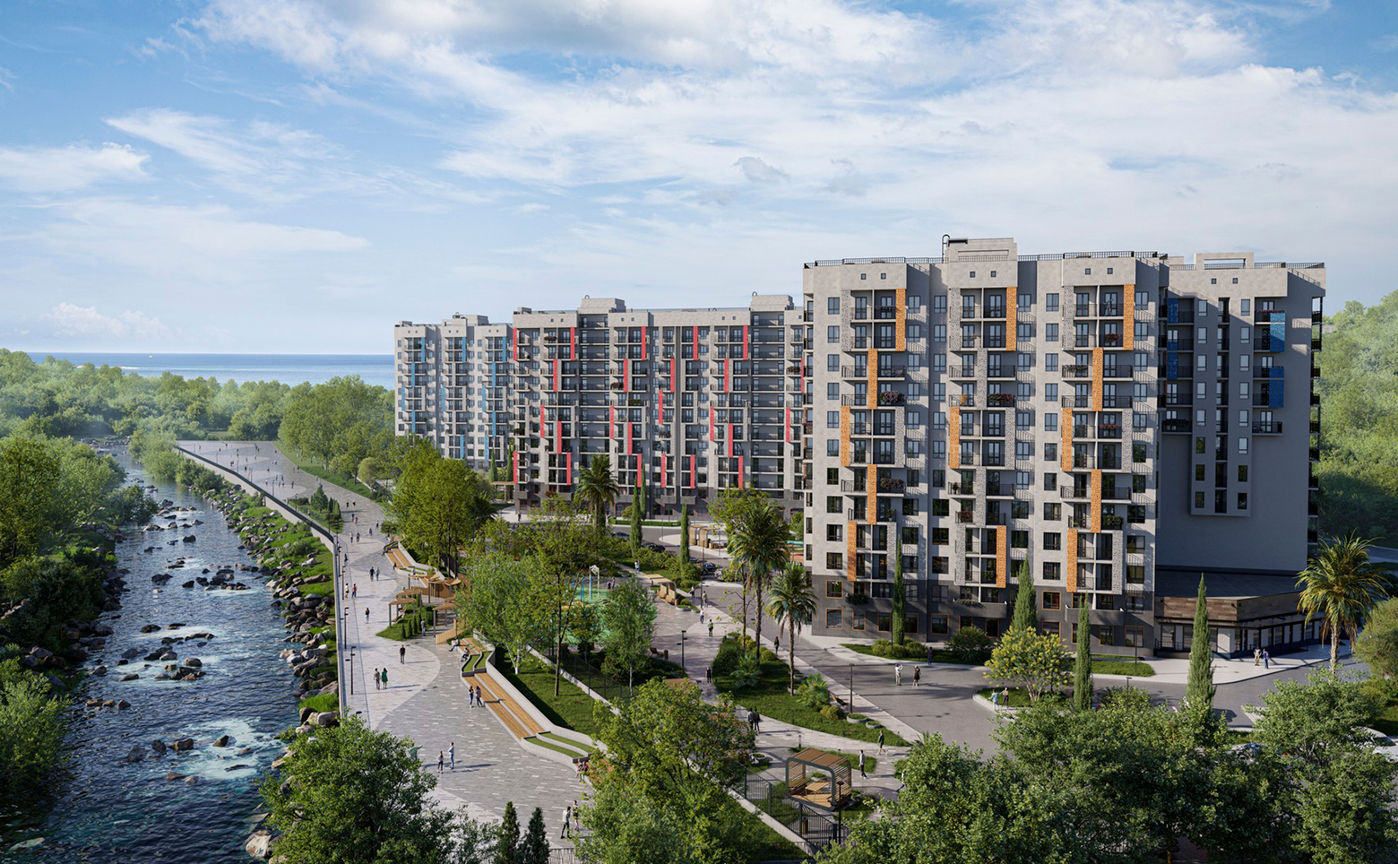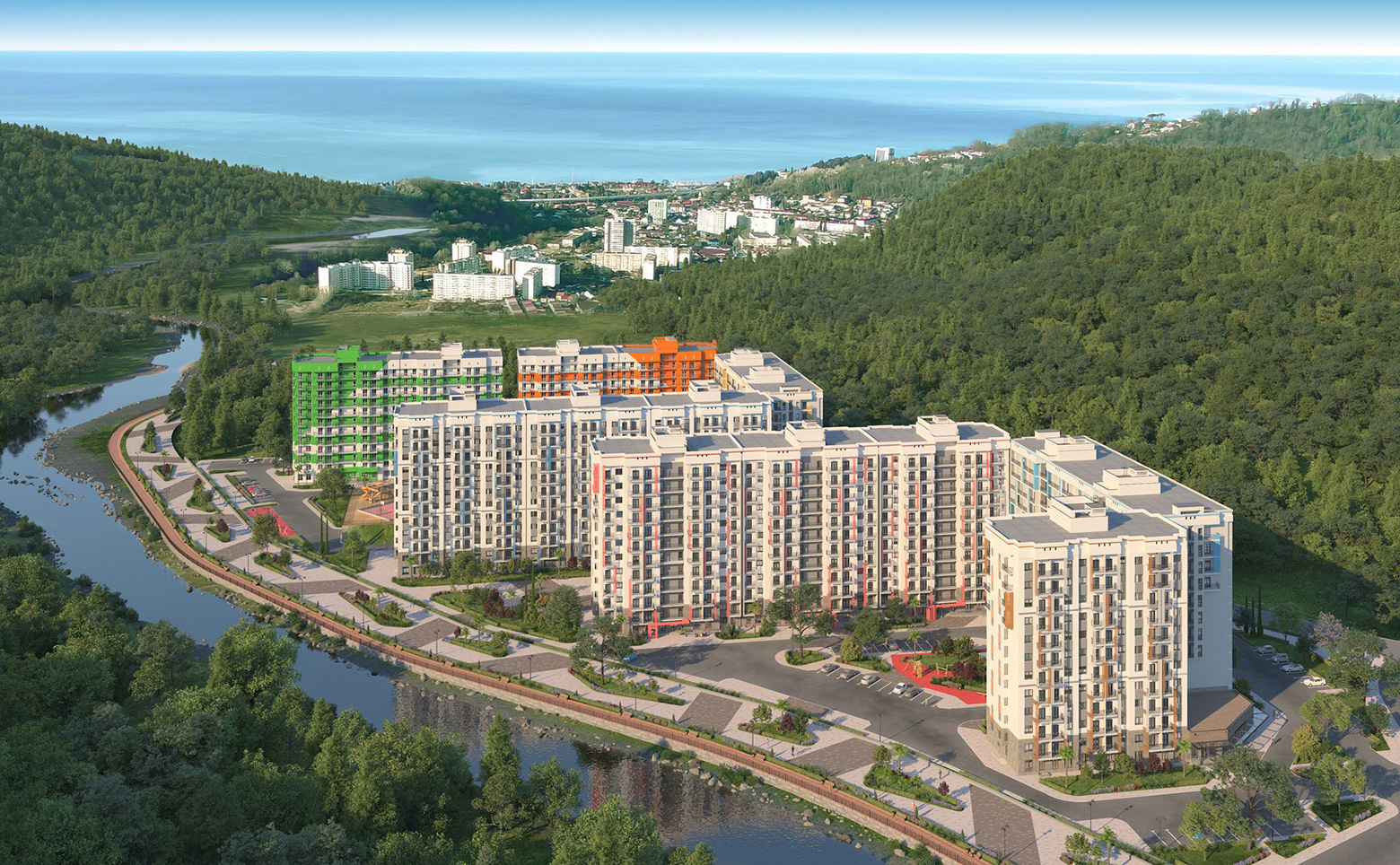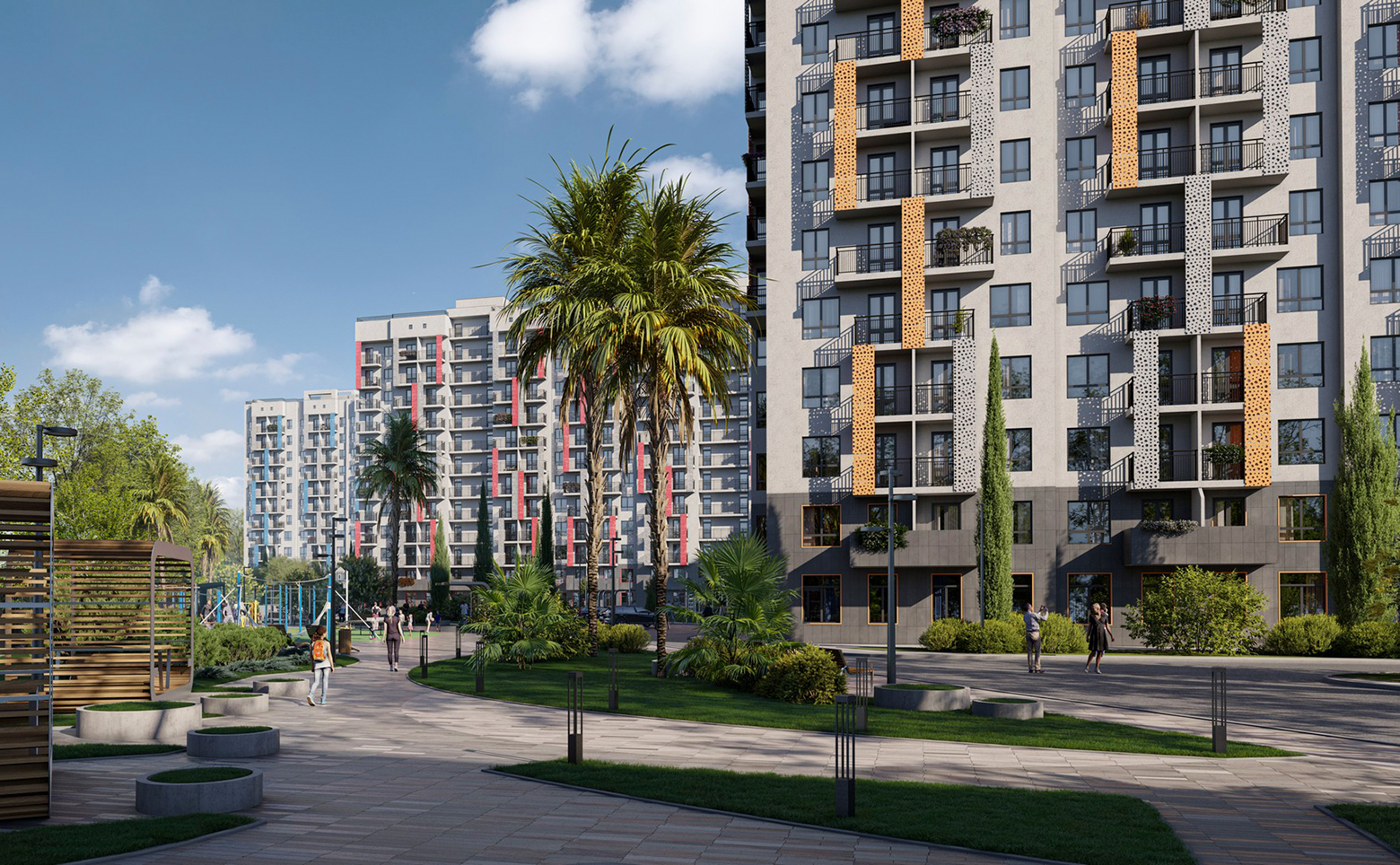 Территория комплекса закрытая. Во дворах предусмотрены детские площадки и спортивные площадки, места активного отдыха и природные рекреационные зоны. На территории комплекса предусмотрена собственная школа и детский сад.