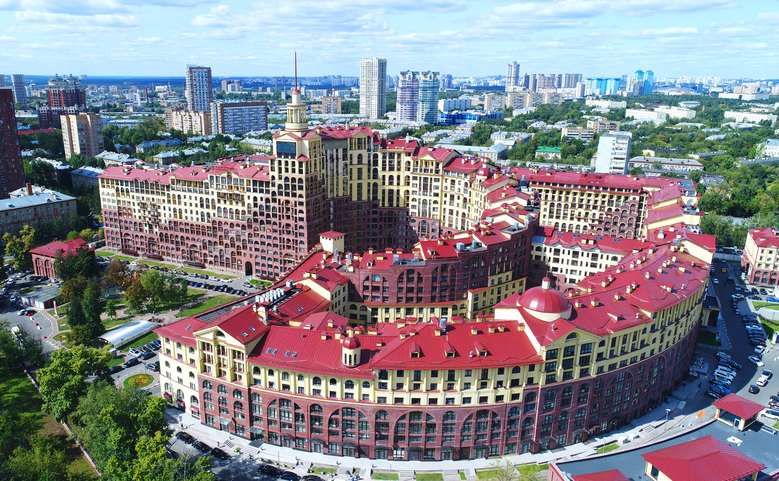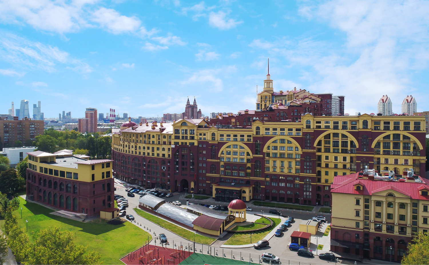 Территория комплекса благоустроена: имеется собственный двор-парк с ландшафтным дизайном для отдыха, прогулок и активного времяпрепровождения. Фонтан и детские площадки. Для автовладельцев предусмотрен подземный паркинг.