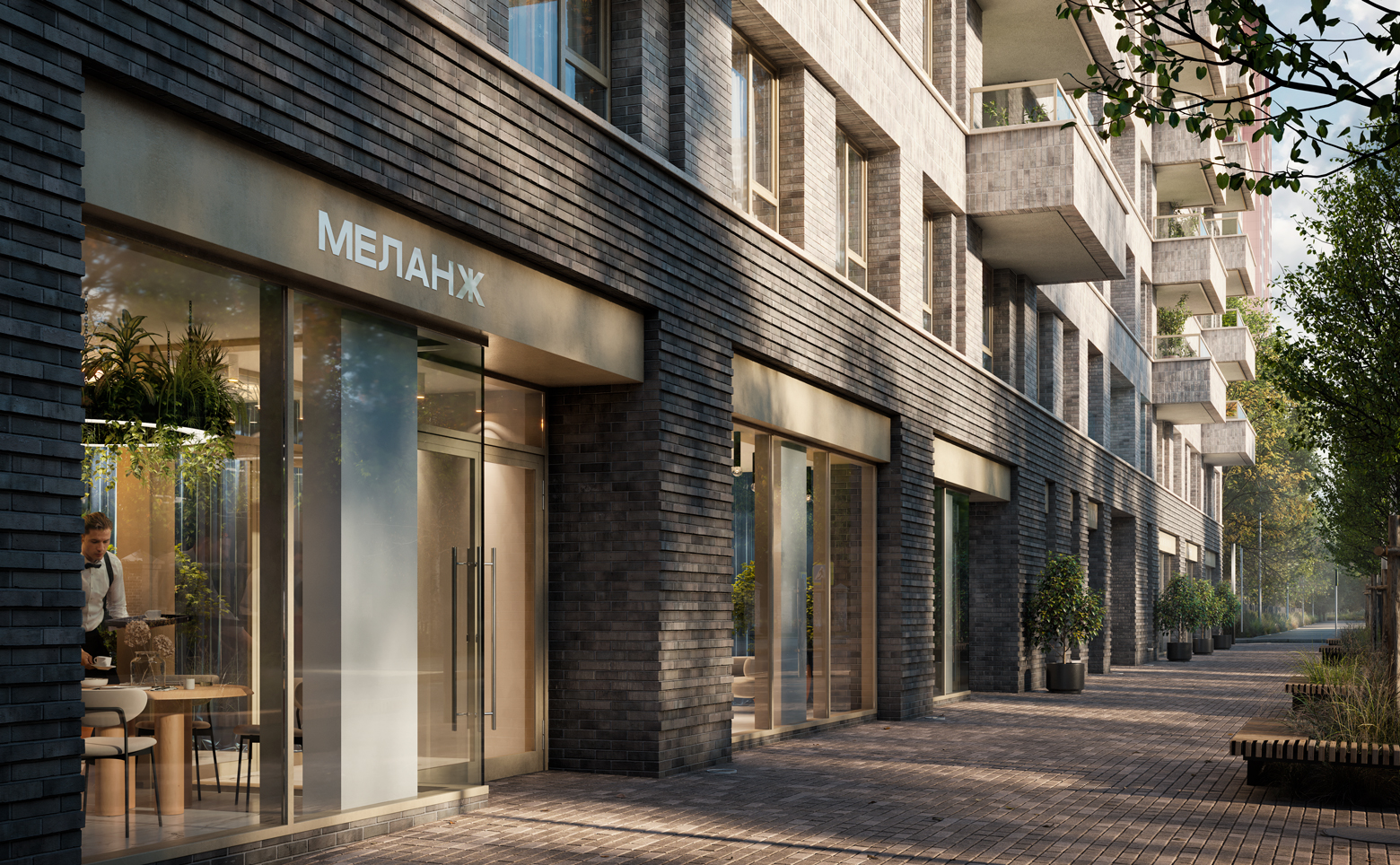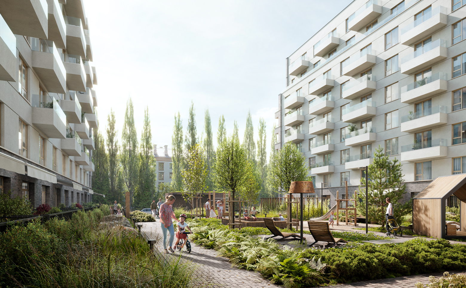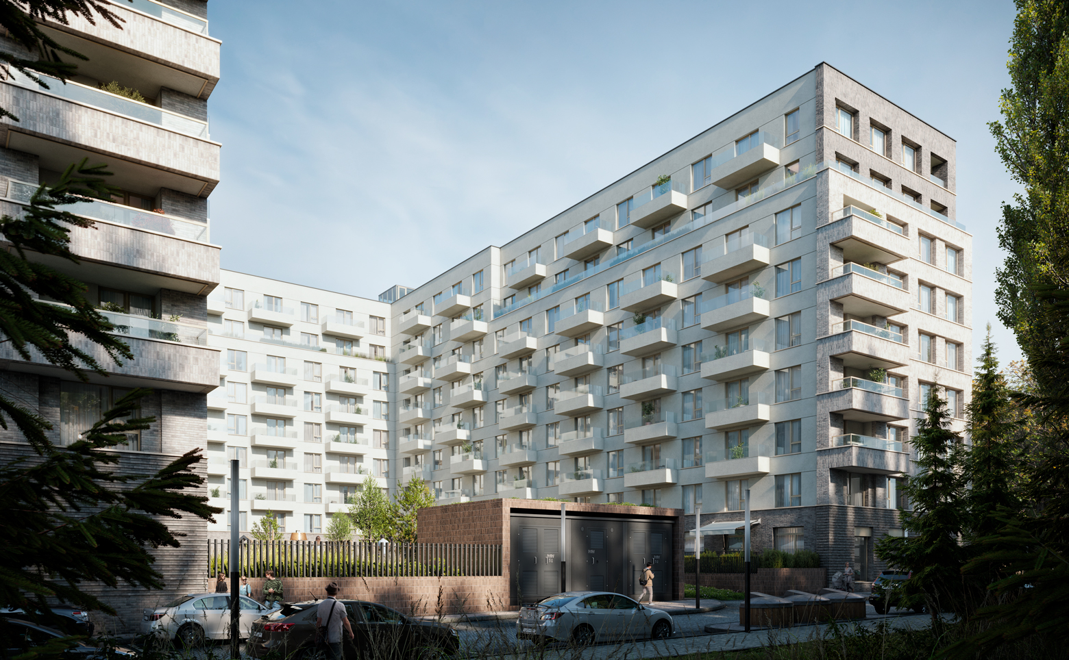 Территория комплекса закрыта от машин, выполнен ландшафтный дизайн и благоустройство с использованием натуральных материалов: металл, дерево, брусчатка и разнотравье; созданы зеленые уголки для спокойного времяпрепровождения. Для хранения предусмотрены келлеры, а для транспорта — подземный паркинг с удобной навигацией и станциями зарядки электромобилей. Во дворе обустроены детская и спортивная площадки, зоны отдыха и велопарковка.