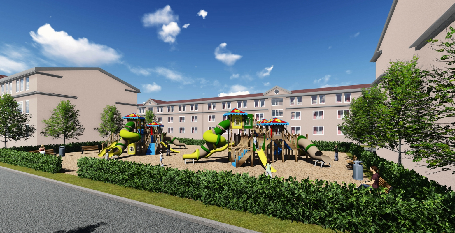 Рядом с домами размещаются детские площадки, уличные спортивные снаряды, площадки для игровых видов спорта со специальным покрытием, велодорожки, газоны, цветники и фонтаны. Пространство между корпусами планируется благоустроить: разбить газоны и высадить декоративные растения, установить малые архитектурные формы и создать комфортные прогулочные зоны.