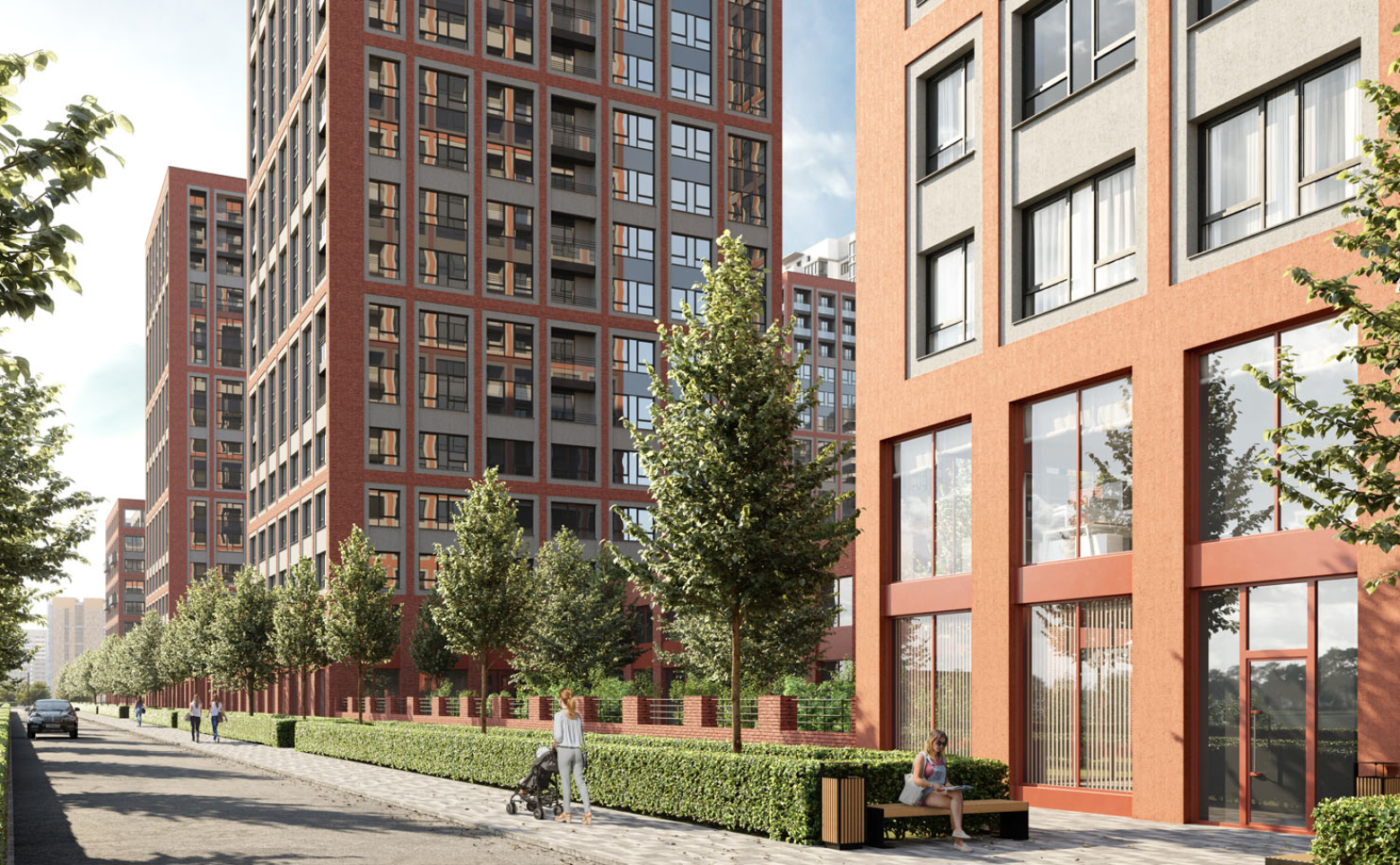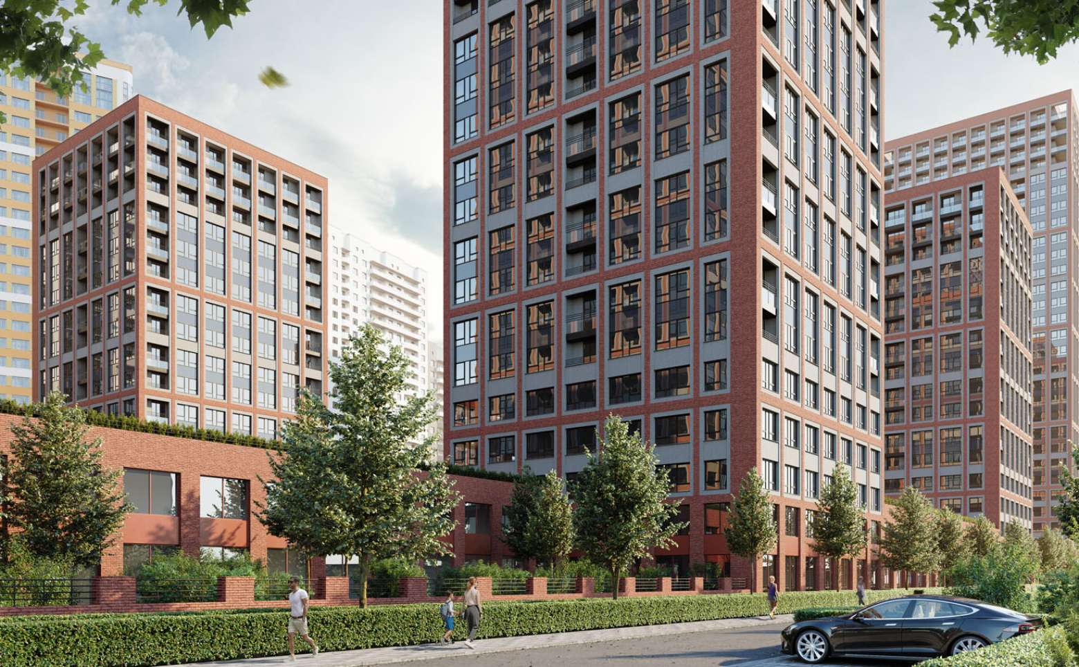 Внутреннее пространство задумано по концепции двор без машин. В центре спроектирована площадь с фонтаном, вокруг нее — прогулочные аллеи с высокими деревьями и детские игровые площадки. Попасть на территорию двора можно через арочные проходы и коммерческие помещения стилобата. Приватные дворы для жителей квартала расположены по периметру. Дворы представляют собой камерные сады, разбитые между секциями домов и окруженные живой изгородью. Проектом предусмотрен подземный паркинг и кладовые помещения.