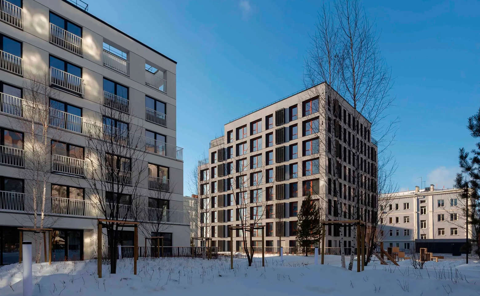Жилой комплекс имеет собственный зеленый парк во дворе без доступа для автомобилей. Общественные пространства двора сменяются уютными камерными садами между домов — лесным, водным, садом цветов и изгородей, и продолжаются прогулочными аллеями. Предусмотрены места спокойного отдыха, детских игр и спорта. На первых этажах разместились коммерческие помещения. Для владельцев автомобилей предусмотрена подземный паркинг, там же расположились кладовые.