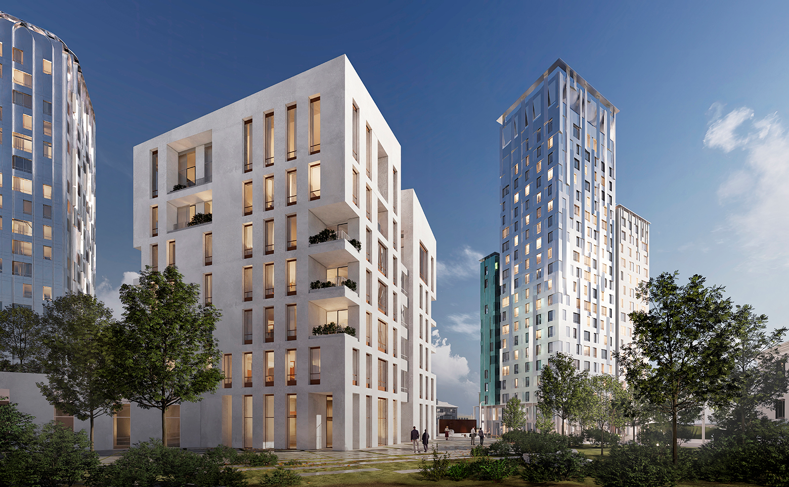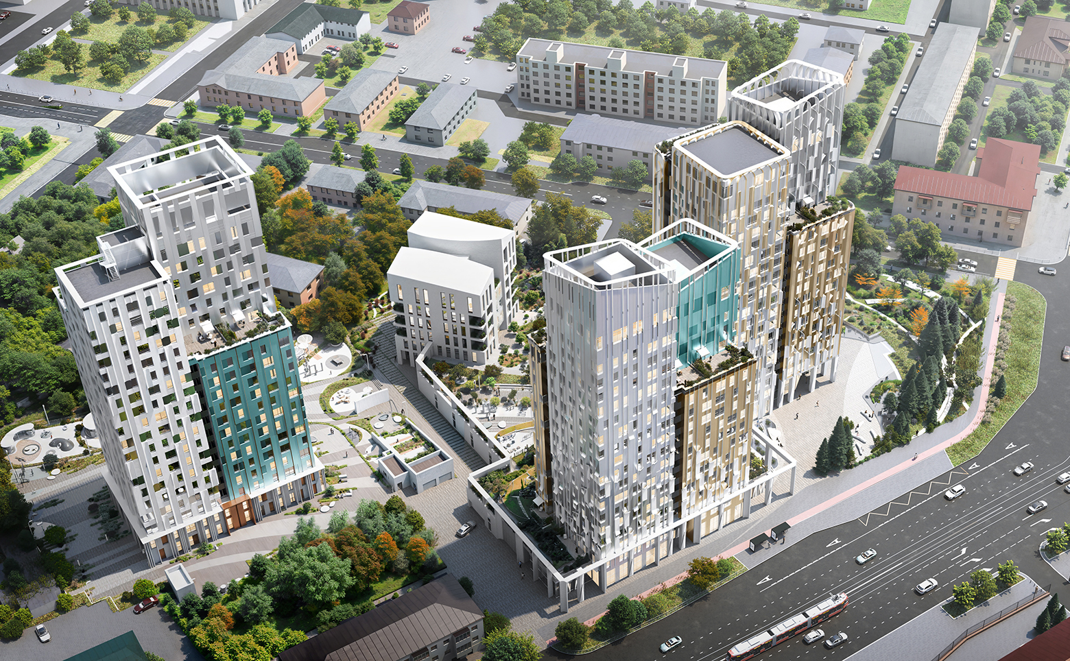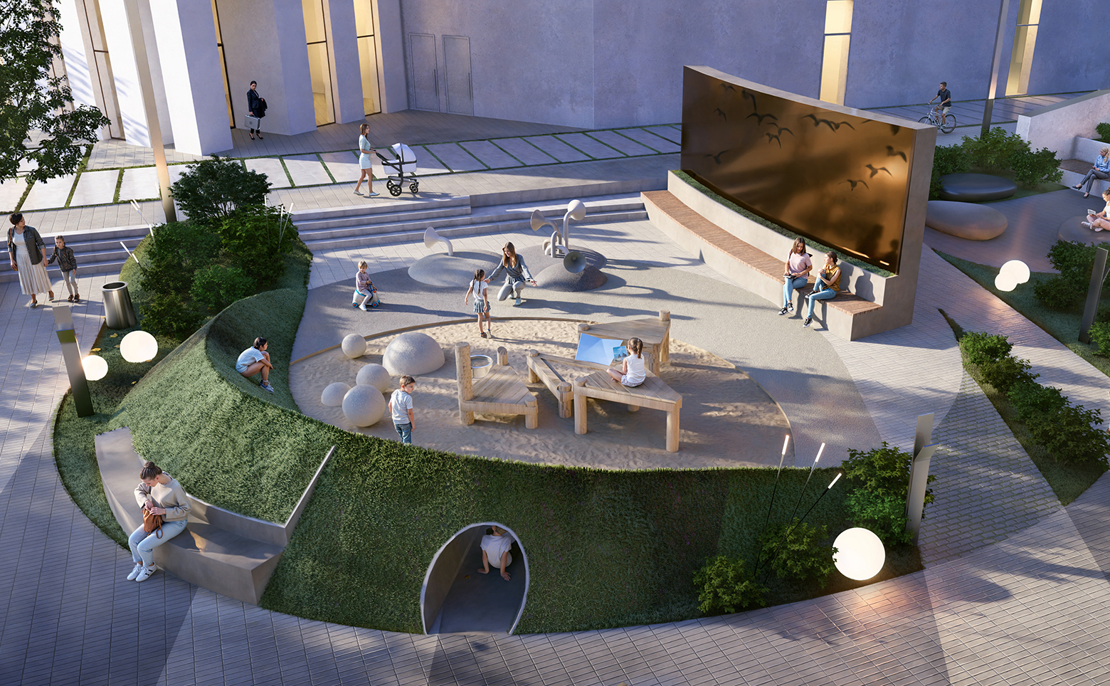 На территории комплекса расположены торговые галереи, прогулочный бульвар, спортивная и детская площадки, двор-парк и фитнес-клуб, зона для занятий спортом. Для автовладельцев имеется подземный паркинг.