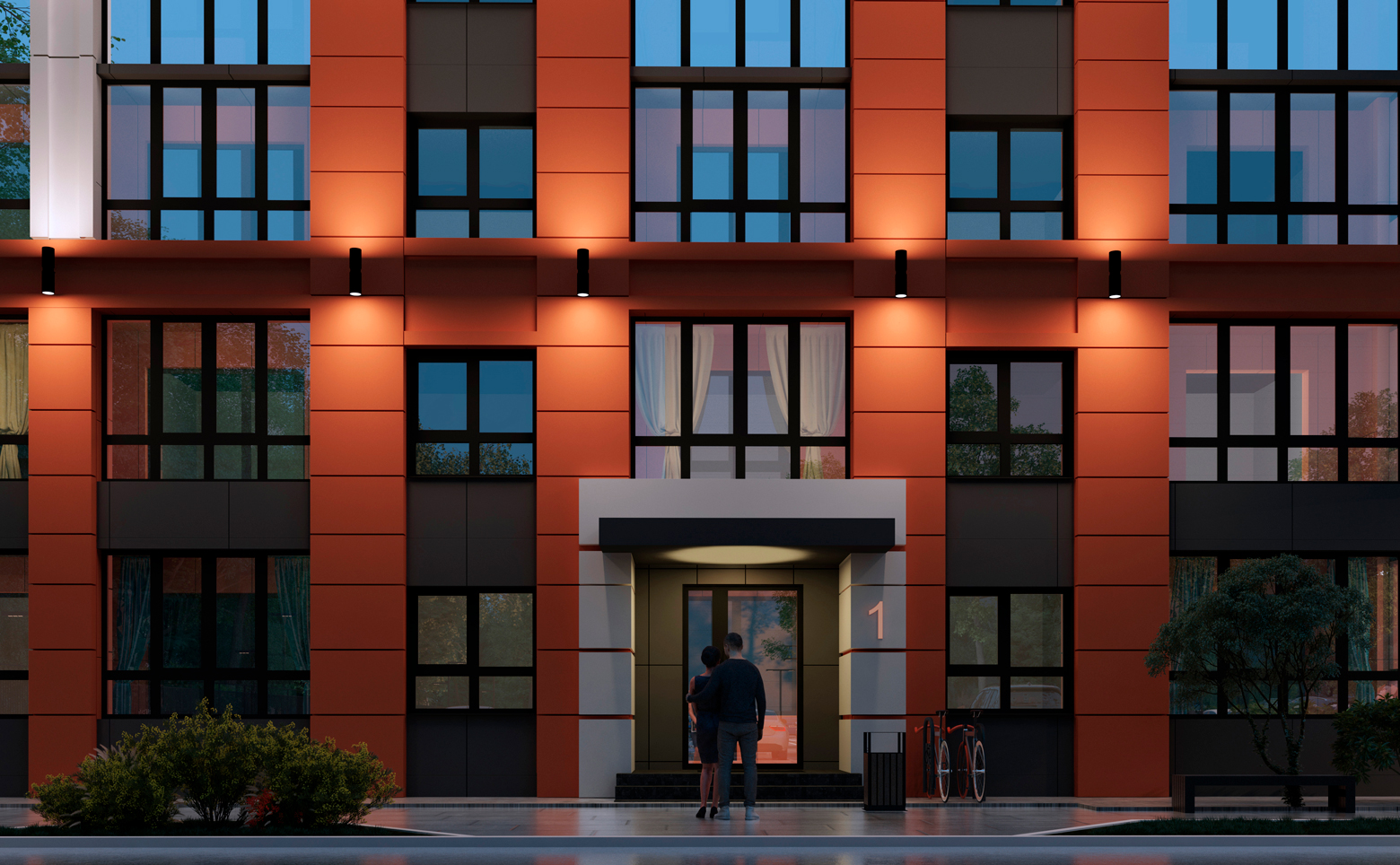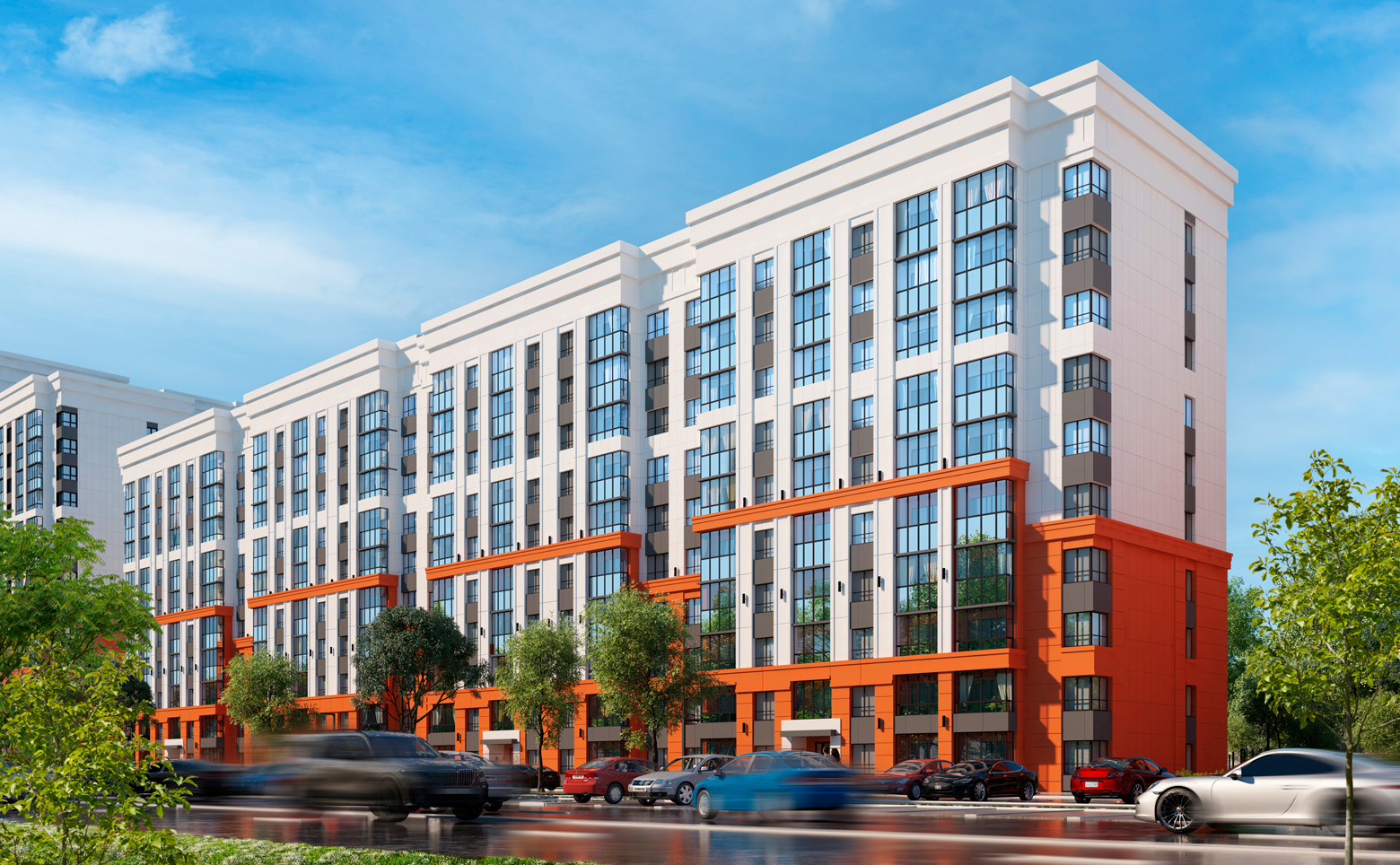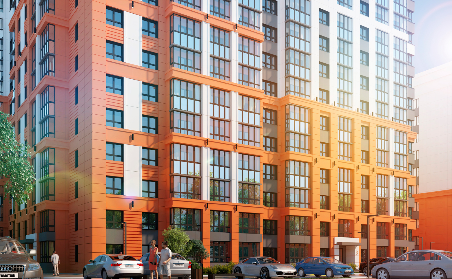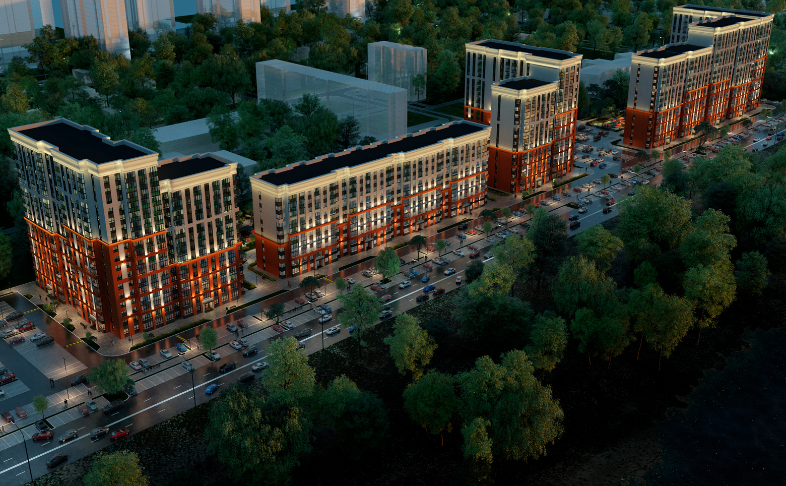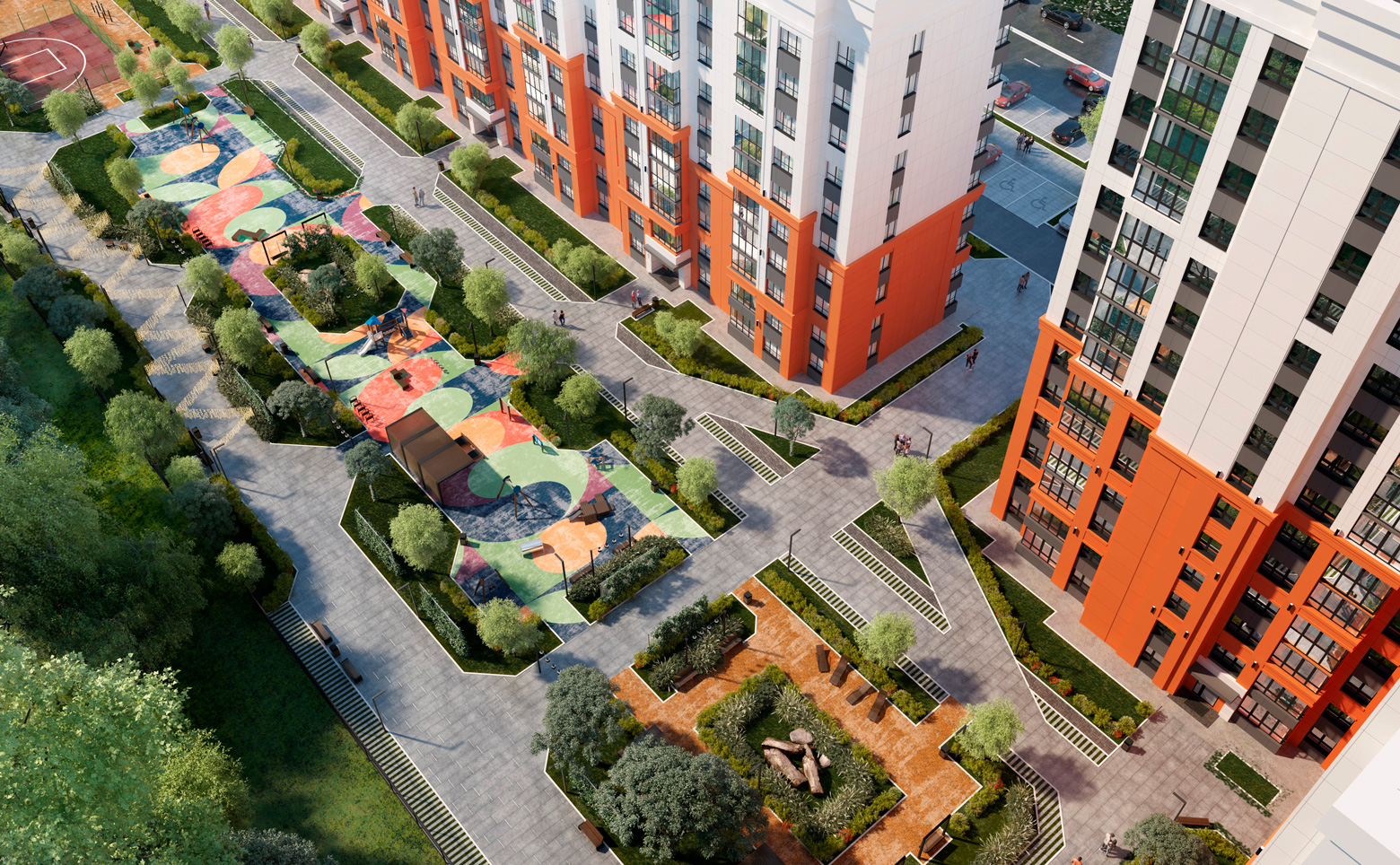 Территория проекта благоустроена и озеленена. Во дворах расположены детские и спортивные площадки, обустроены места для отдыха. Для владельцев автомобилей предусмотрена стоянка.