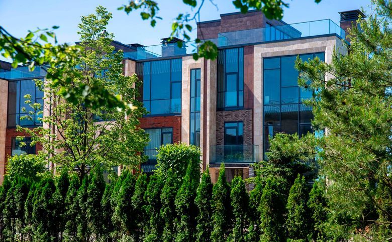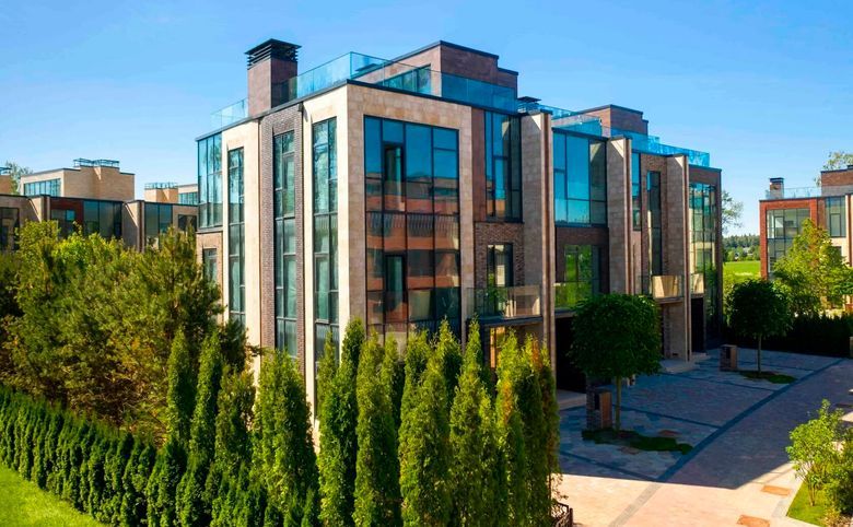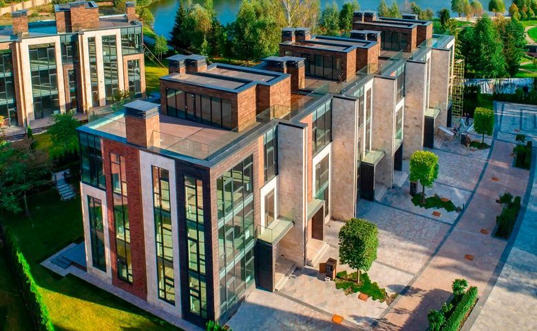 Проект представляет собой клубный поселок таунхаусов. Они рассчитаны на 2, 4 и 5 семей, высотой в 3 этажа. Высота потолков в таунхаусах составляет 3,5 м. В каждом доме предусмотрено панорамное остекление, а на эксплуатируемой кровле можно создать зону для отдыха.