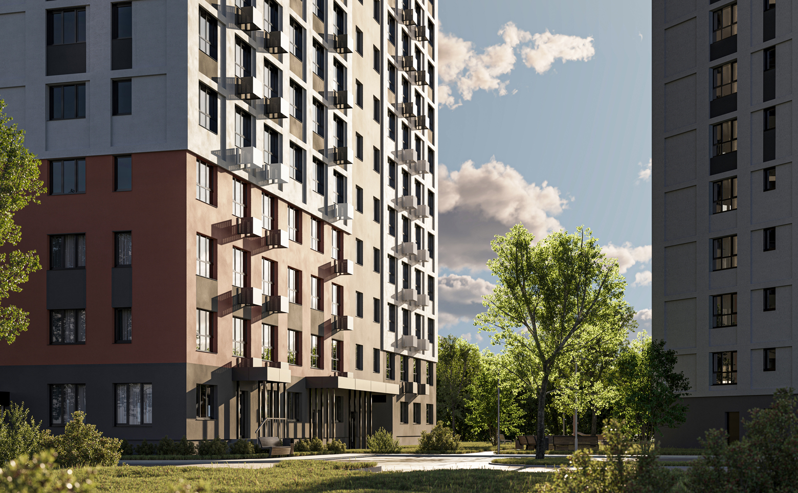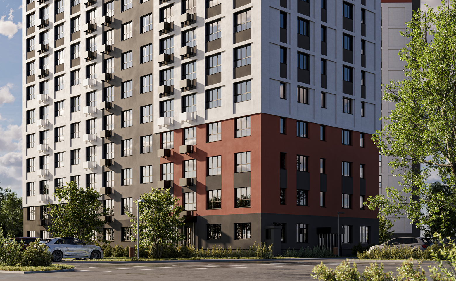 Территория комплекса благоустроена: выполнено озеленение, предусмотрены зоны отдыха с лавочками и беседками, а также спортивные и детские площадки. Игровые зоны оборудованы безопасными конструкциями, которые устойчивы к любым погодным условиям. Для любителей спорта создана воркаут-зона и площадка с уличными тренажерами, где можно заниматься различными видами физической активности на свежем воздухе.