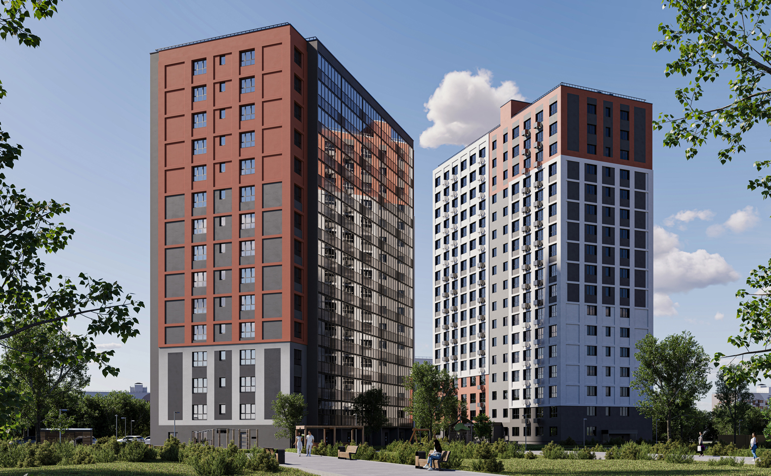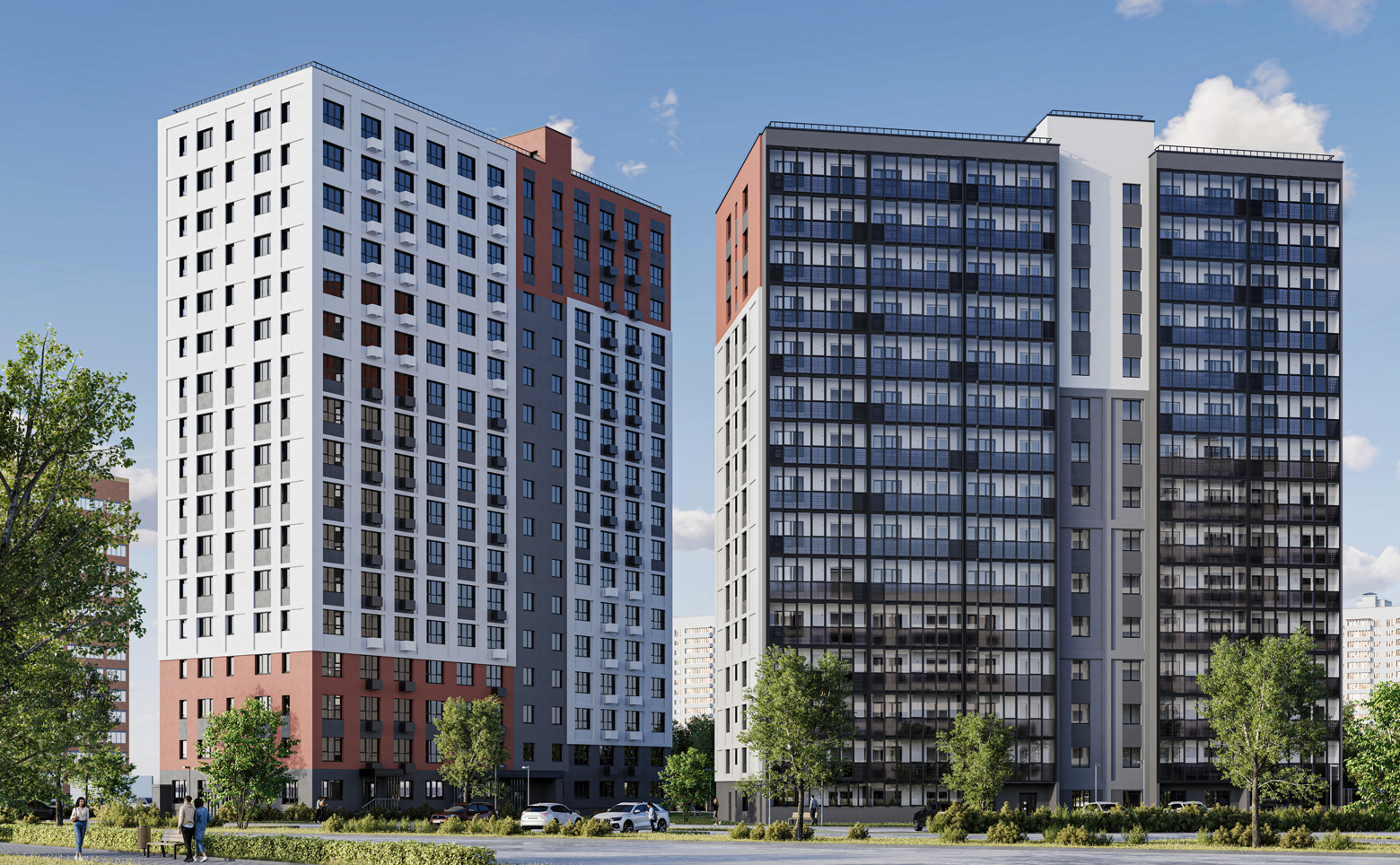 Жилой комплекс состоит из 2 домов по 17 этажей. Здания построены с использованием стеновых железобетонных панелей и эффективного утеплителя. Благодаря такой конструкции обеспечивается защита от холода и шума и создается комфортный микроклимат в квартирах. Для оформления фасадов использована декоративная штукатурка, предусмотрены корзины под наружные блоки кондиционеров. Используются строительные материалы собственного производства застройщика. В каждом подъезде установлены пассажирские и грузовые лифты.