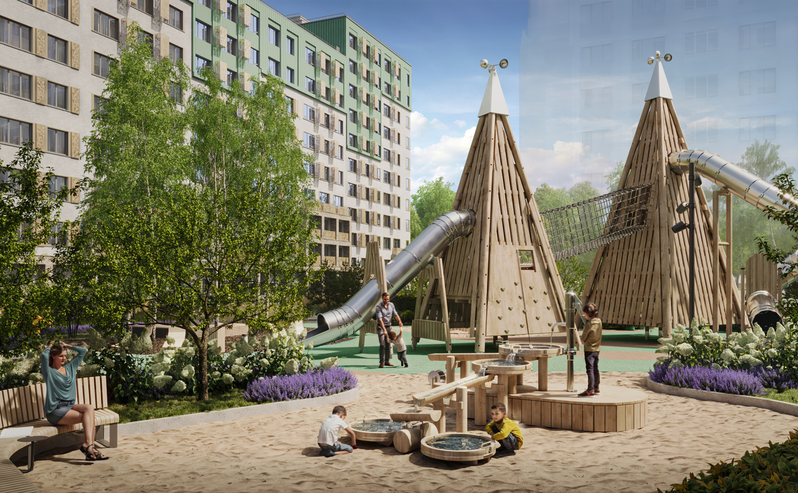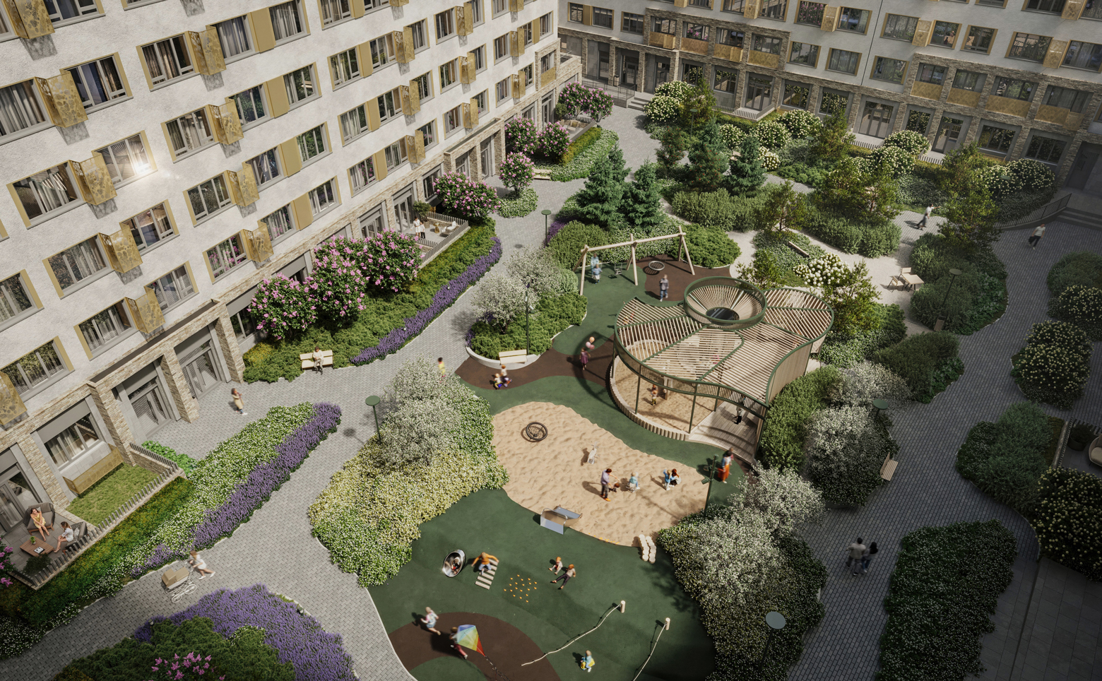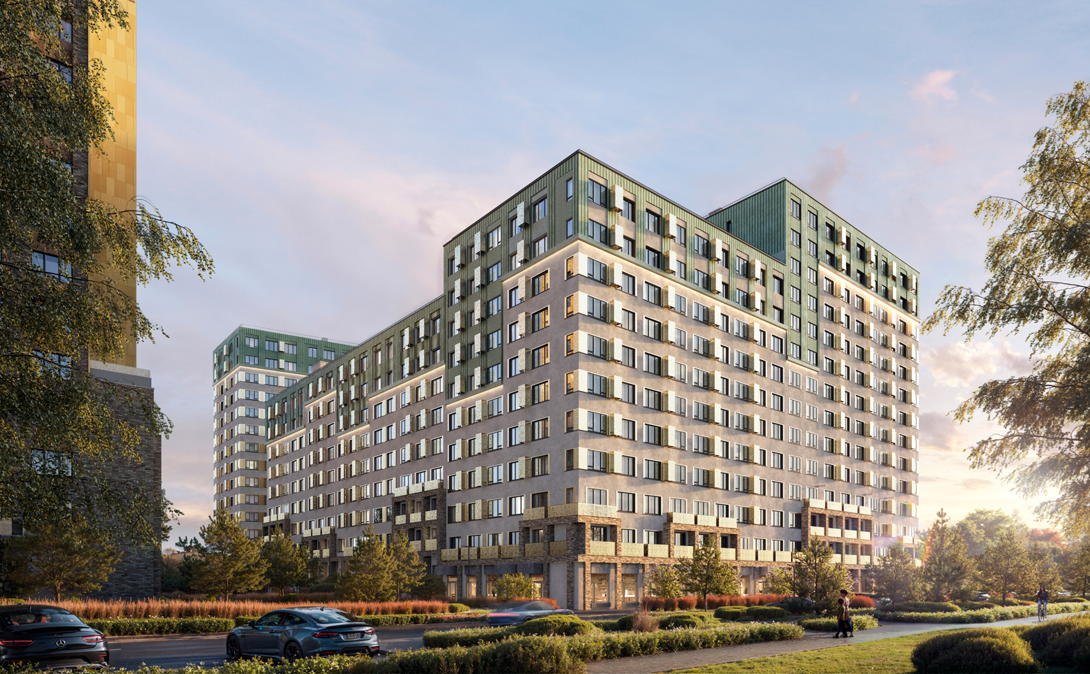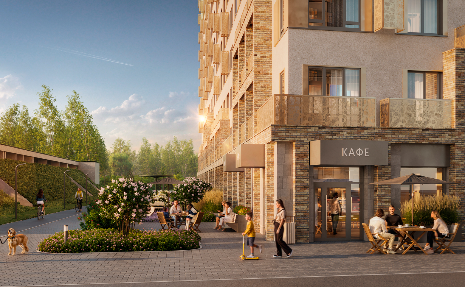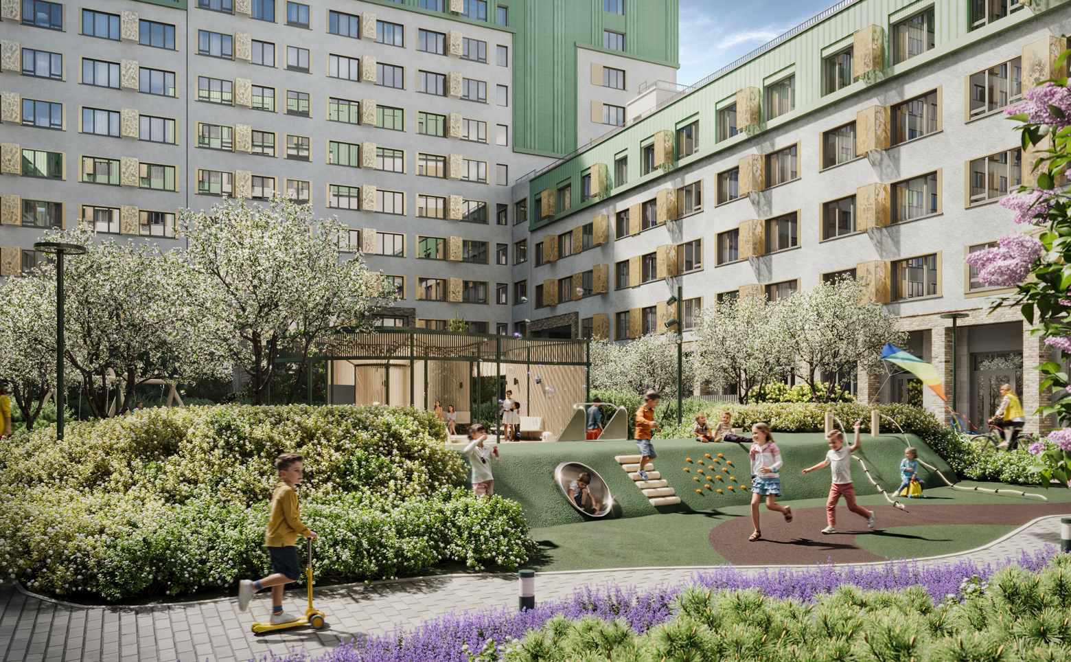 Во дворе организовано безопасное пространство формата двор-гнездо с ландшафтным дизайном и продуманной функциональной структурой. Созданы беговые дорожки, спортивные и воркаут-зоны, разновозрастные детские плейхабы, соседская площадь с арт-объектом, а также площадки для дрессировки питомцев и дог-боксы. Территория закрыта, работает видеонаблюдение. На первых этажах размещены коммерческие помещения, предусмотрена стоянка для авто.