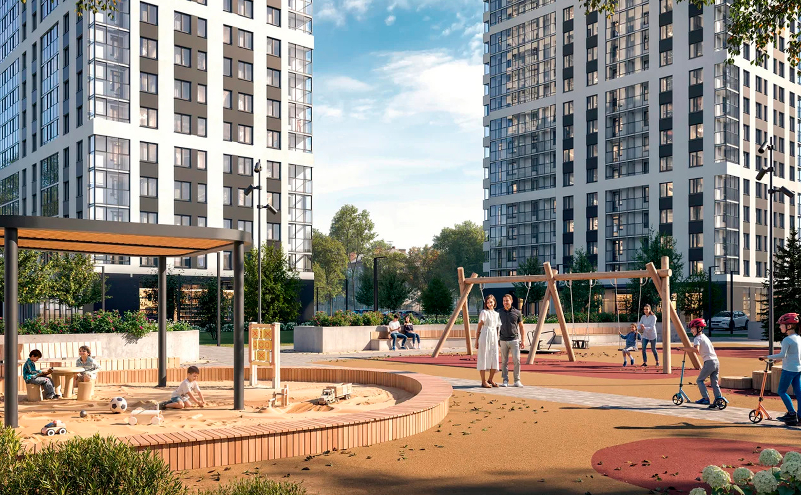 Территория квартала благоустроена и продумана для комфортной жизни — внутри обустроен парк для отдыха и прогулок. Во дворе организованы детская площадка, зона воркаута и прогулочные аллеи. Для жителей предусмотрена автостоянка и келлеры для хранения вещей.