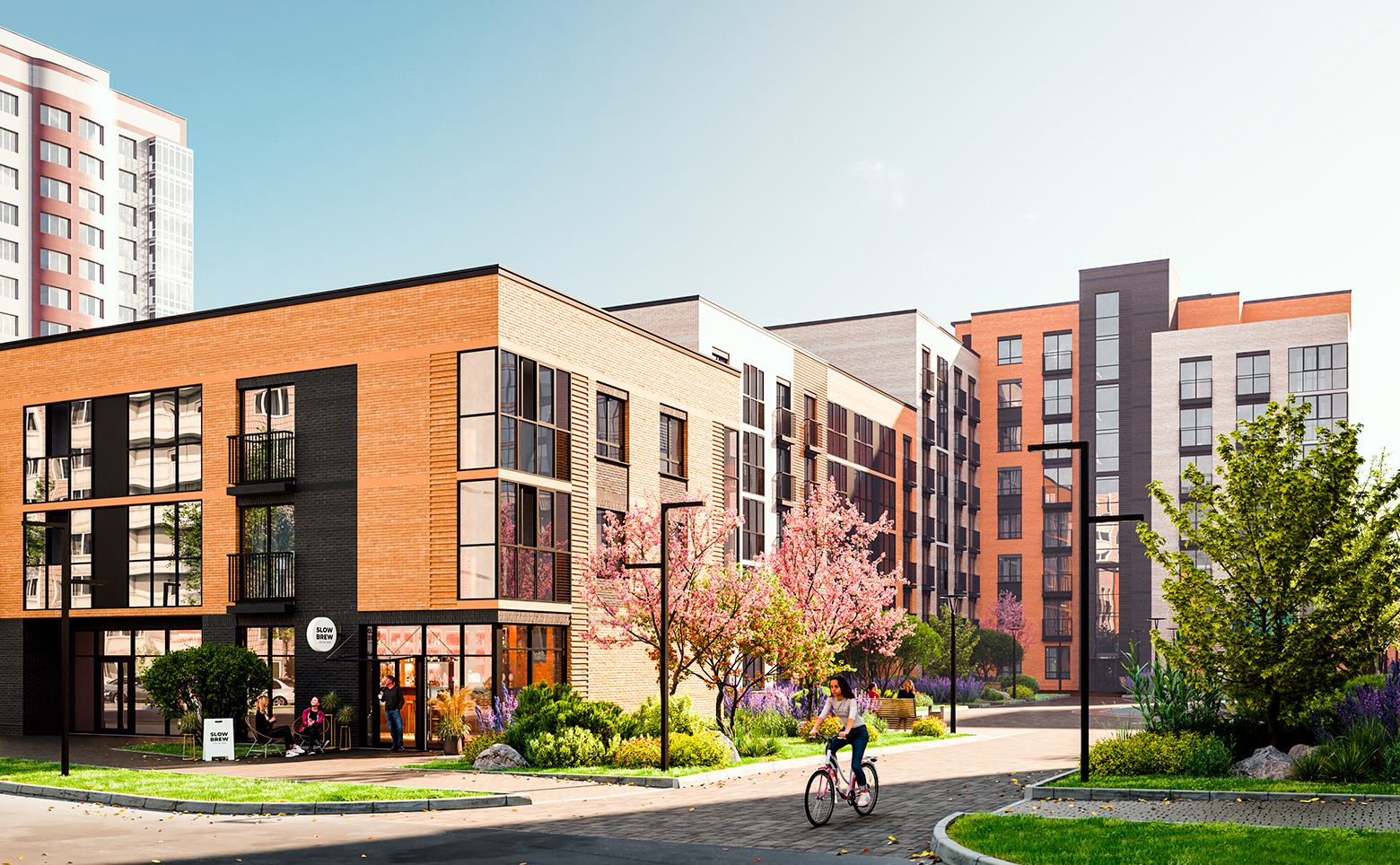 Жилой комплекс представляет собой корпуса построенные по долговечной кирпично-монолитной технологии. Фасад облицован кирпичом светлого и темного оттенков. Во всех домах выполнена дизайнерская отделка входных групп и установлены современные лифты.