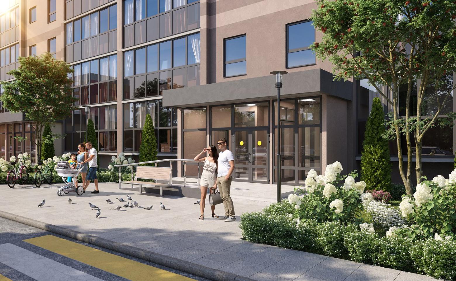 На территории жилого комплекса находится большой благоустроенный двор, разбитый на множество зон, для детей и взрослых, спроектированы велодорожки. В проект входят баскетбольная площадка и зона уличных тренажеров. Концепция предусматривает «двор без машин», а для владельцев автомобилей предусмотрена стоянка.