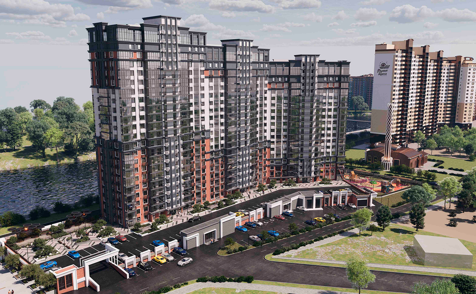 Территория комплекса благоустроена в формате дизайнерского двора. Оборудованы детские и спортивные площадки, велосипедные дорожки. Для жителей обустроены кладовые, на первых этажах спроектированы коммерческие помещения. Для владельцев авто организованы подземный паркинг и наземная стоянка.