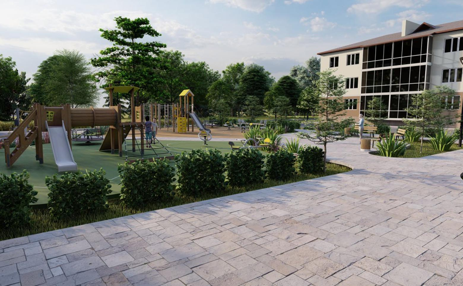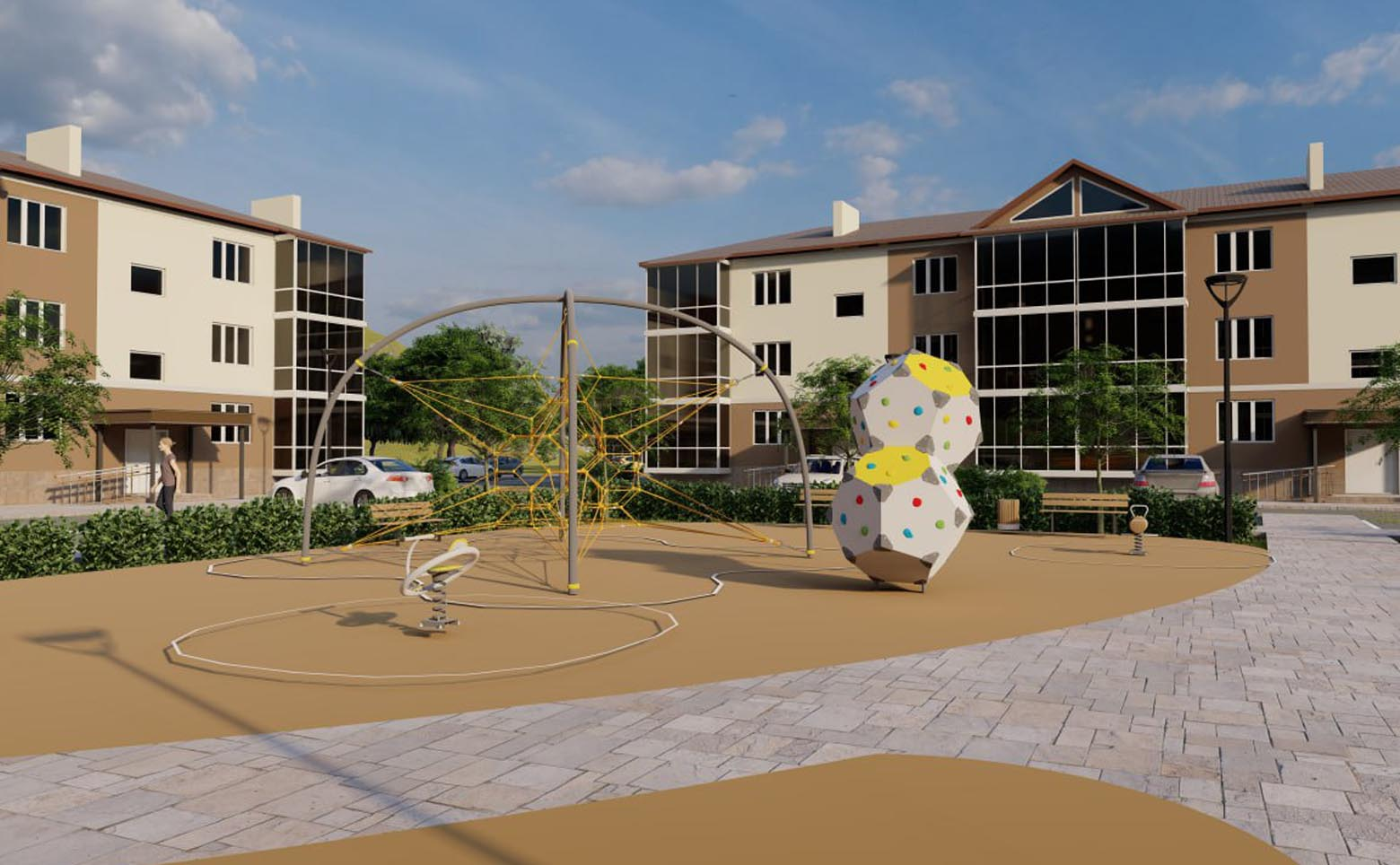 Территория комплекса благоустроена: оборудованы детские и спортивные площадки, а также открытая стоянка для авто. Внутри организованы зеленые зоны с кустарниками, деревьями и газонами, что создает условия для прогулок, занятий спортом и семейного отдыха.