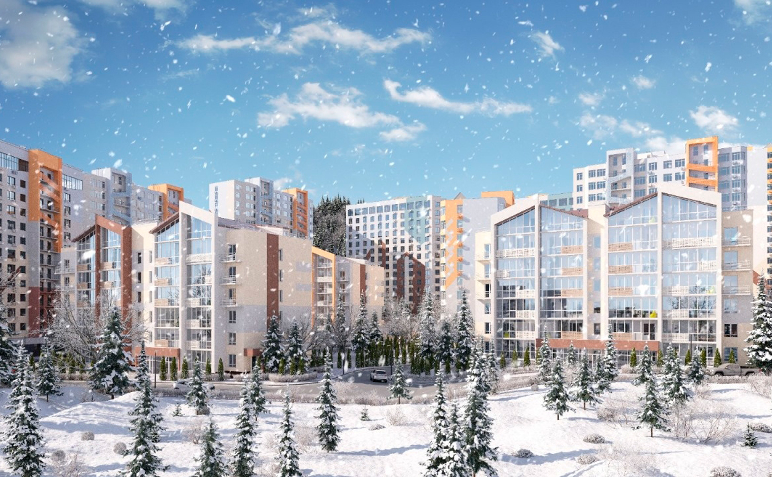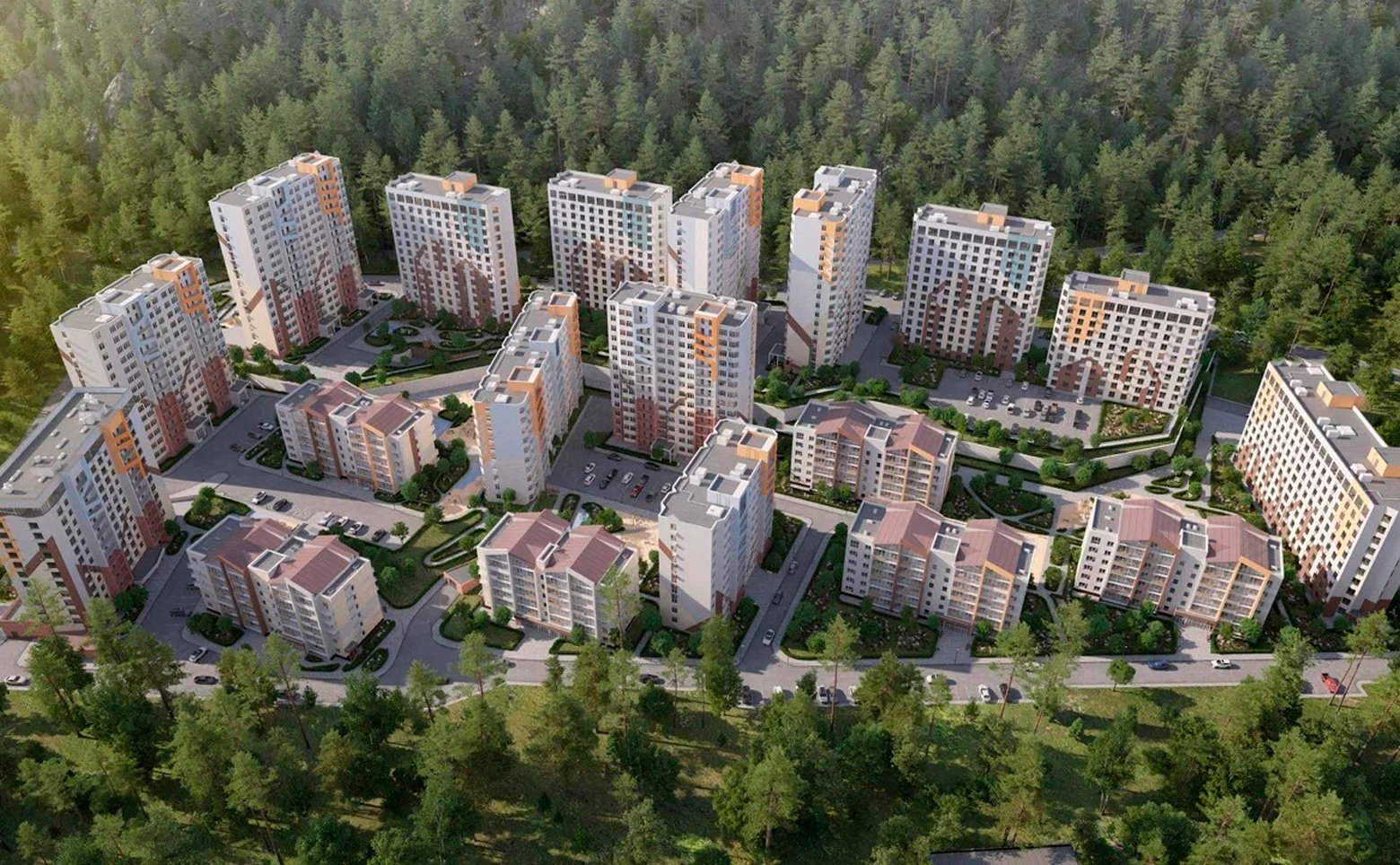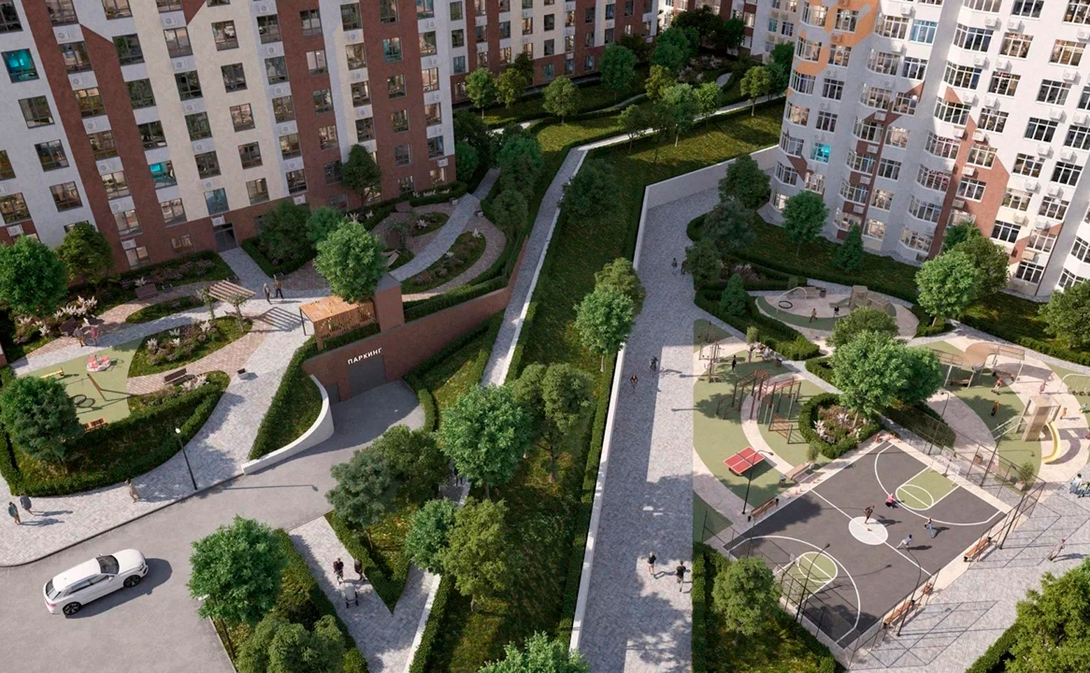 Территорий комплекса имеет реализована в концепции «двор без машин». Во дворах обустроены зоны отдыха, детские площадки, пространства для занятий спортом на открытом воздухе, прогулочные маршруты по зеленым скверам, благоустроенным парковым дорожкам. Для владельцев автомобилей предусмотрены стоянки и подземные паркинги.