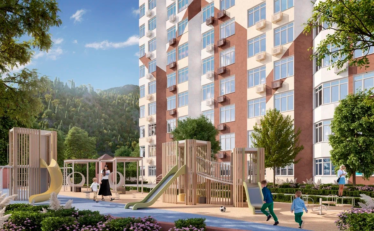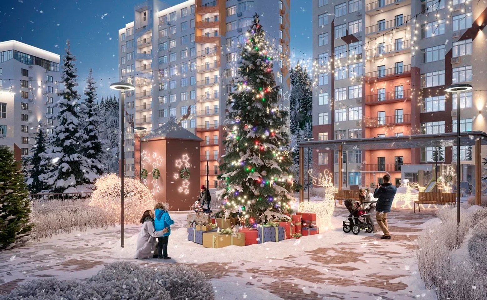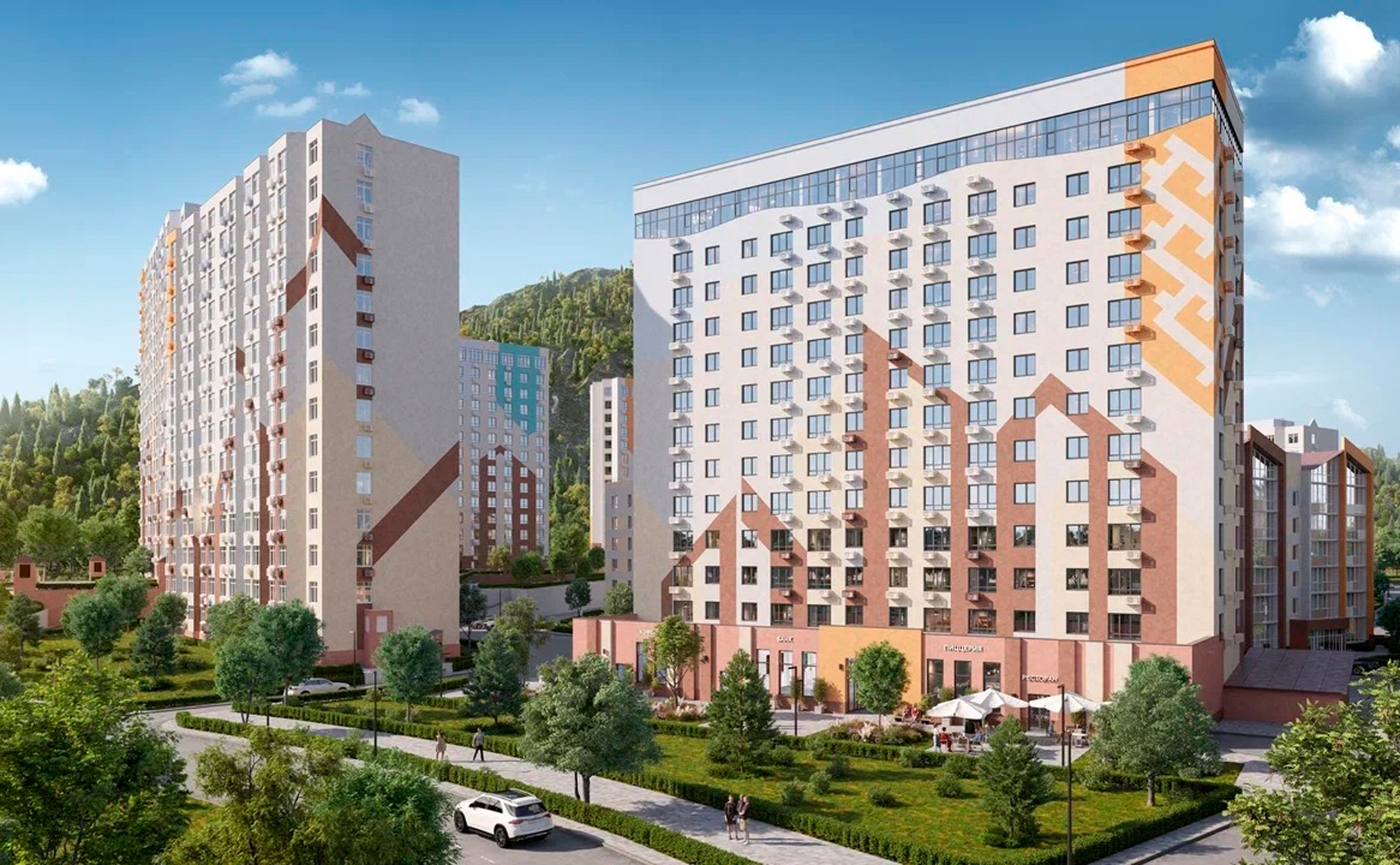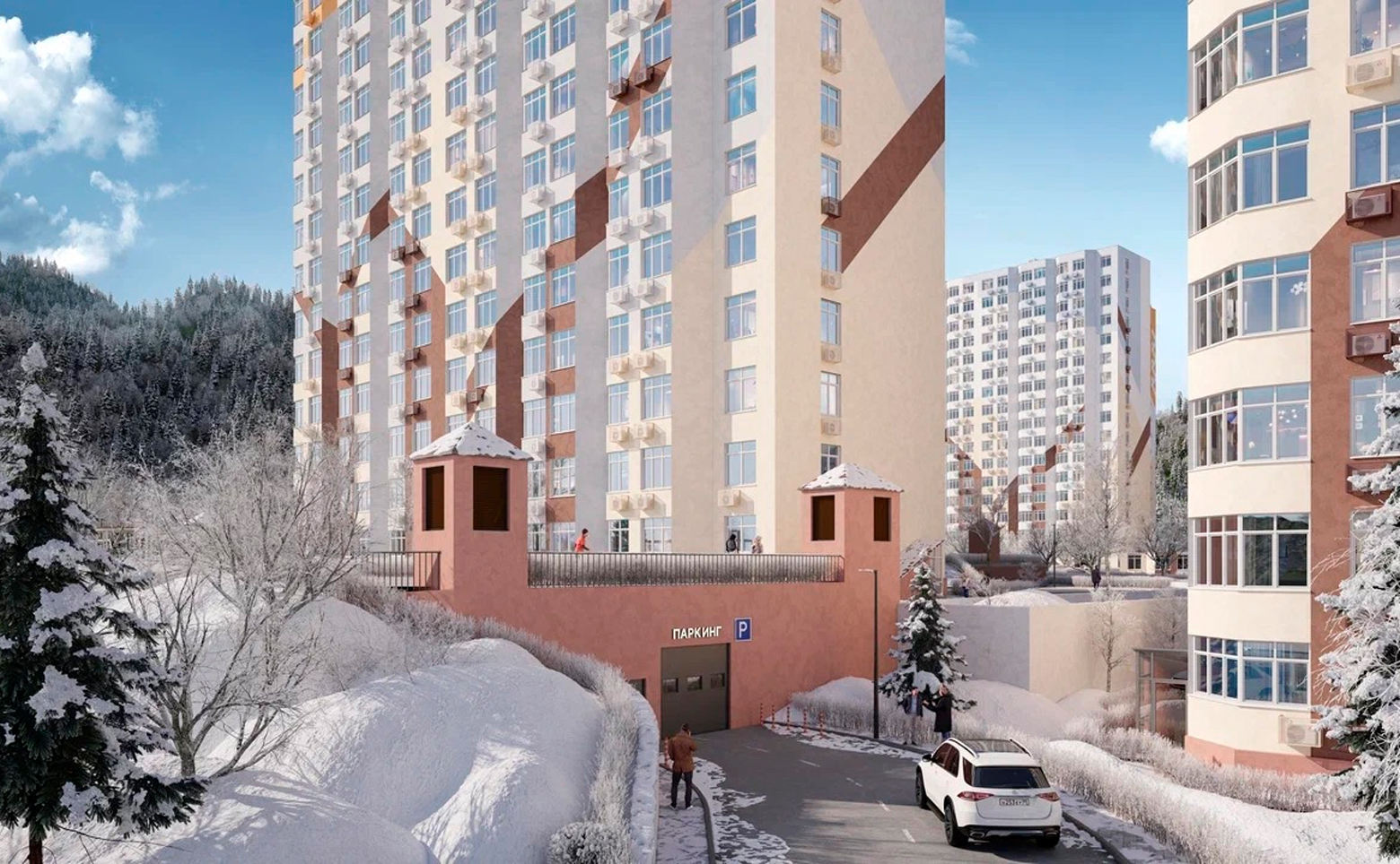 Территорий комплекса имеет реализована в концепции «двор без машин». Во дворах обустроены зоны отдыха, детские площадки, пространства для занятий спортом на открытом воздухе, прогулочные маршруты по зеленым скверам, благоустроенным парковым дорожкам. Для владельцев автомобилей предусмотрены стоянки и подземные паркинги.
