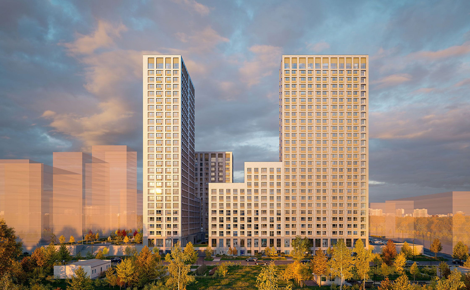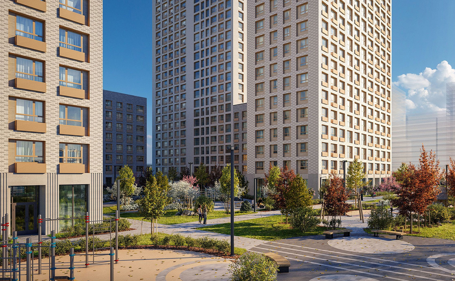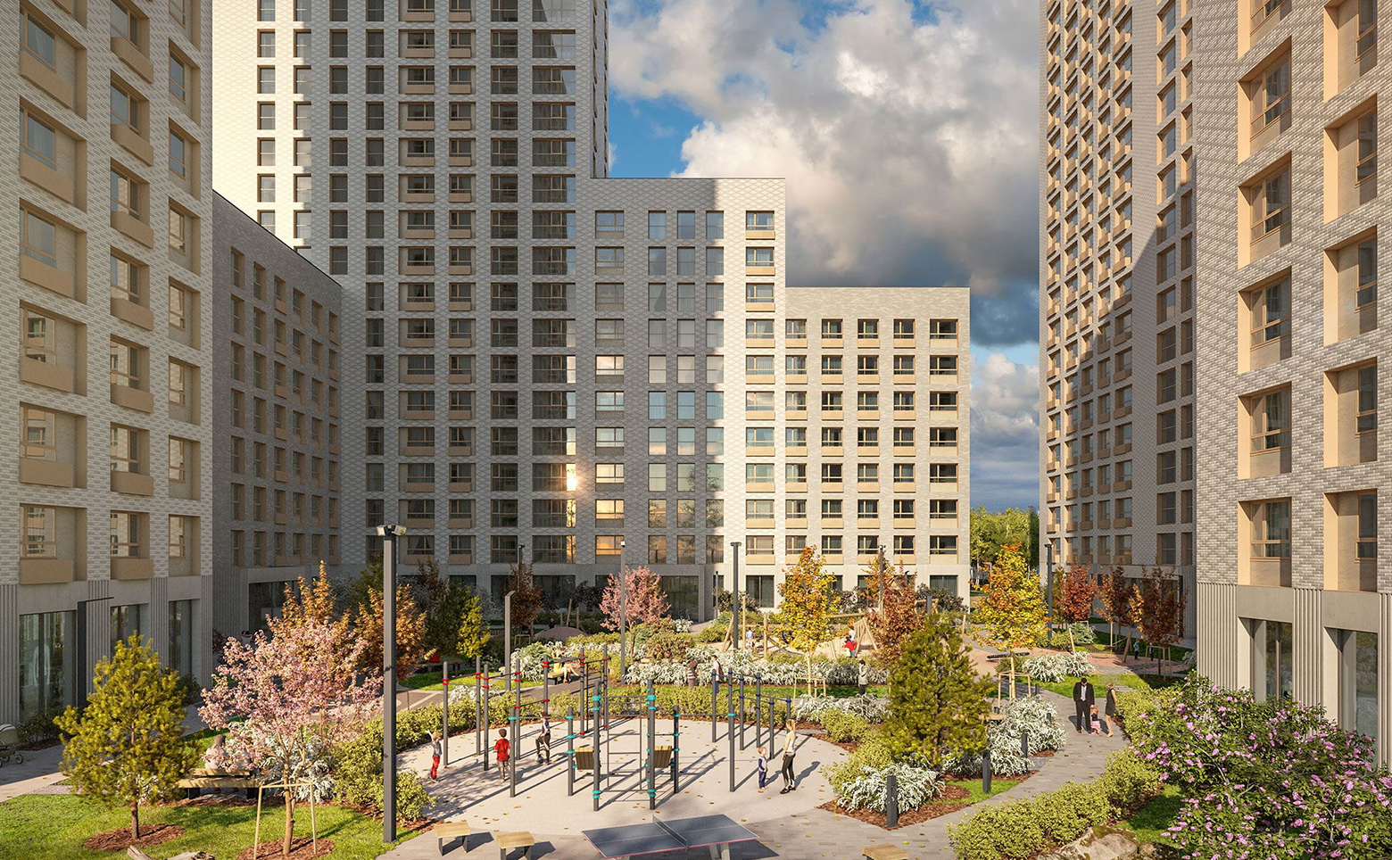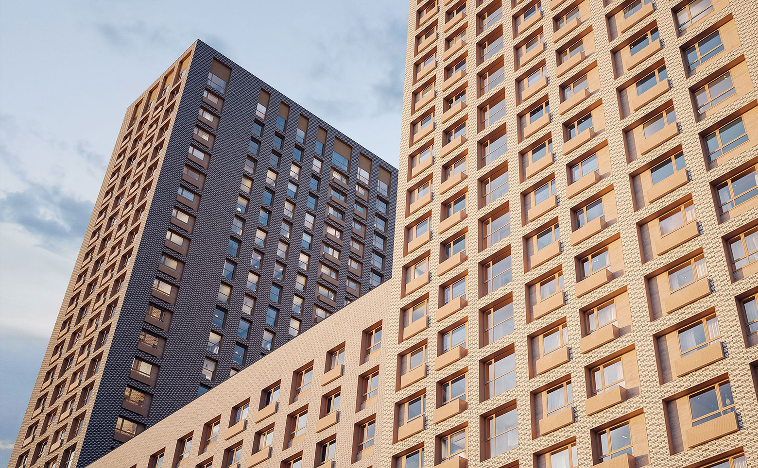 Жилой комплекс представляет собой комплексную застройку кирпично-монолитными домами переменной этажности: от 7 до 26 этажей. В оформлении стен зданий используется современный навесной вентилируемый фасад молочных оттенков. Во всех входных группах выполнена дизайнерская отделка, предусмотрены высокие потолки, прозрачные двери и установлены современные лифты. Входы в подъезды сделаны на уровне земли.