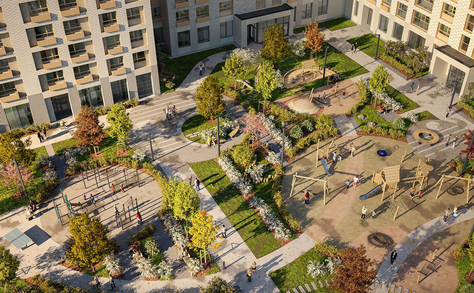 Через весь квартал тянется широкий пешеходный бульвар с велодорожками, велопарковками, зонами для отдыха, детскими и спортивными площадками. В проекте предусмотрены коммерческие помещения, свои школа и 2 детских сада. Для удобства жителей спроектированы подземные паркинги, 4 наземных многоуровневых паркинга, индивидуальные кладовые и колясочные.