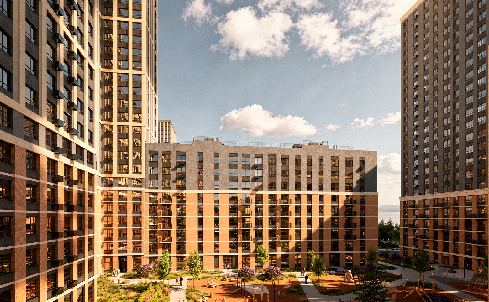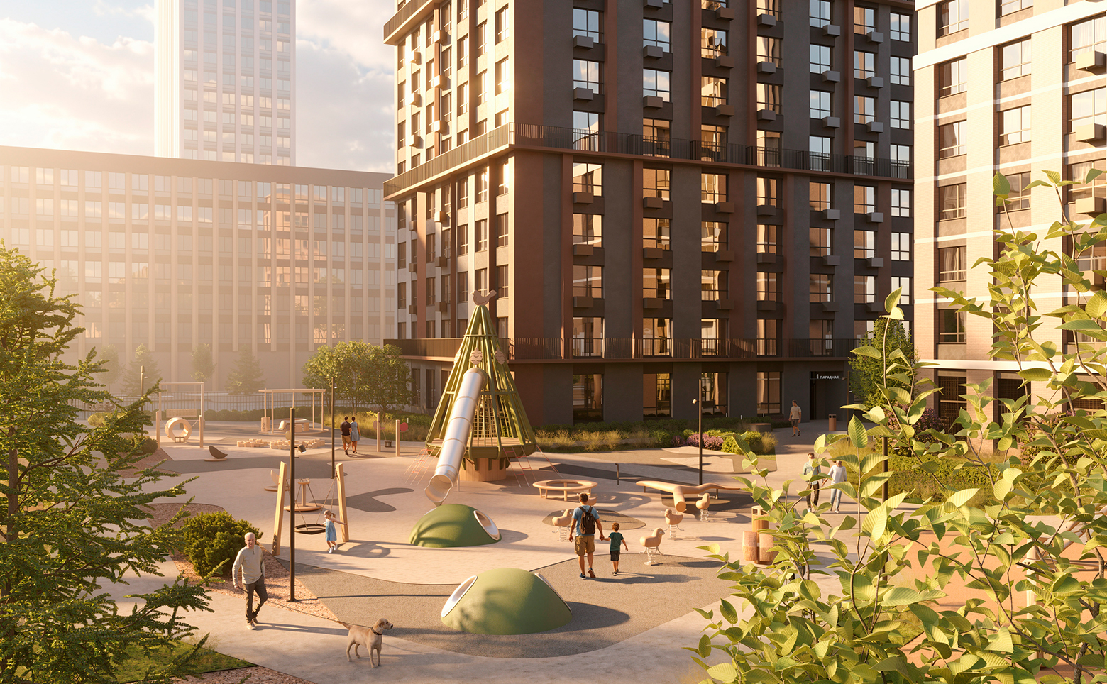 Во дворе обустроена безбарьерная среда: детские площадки для разных возрастов, зоны отдыха для взрослых, гармоничное озеленение. Двор свободен от машин. На первых этажах находятся помещения для хранения колясок и велосипедов, современные кладовые и технические зоны. Предусмотрена система видеонаблюдения.