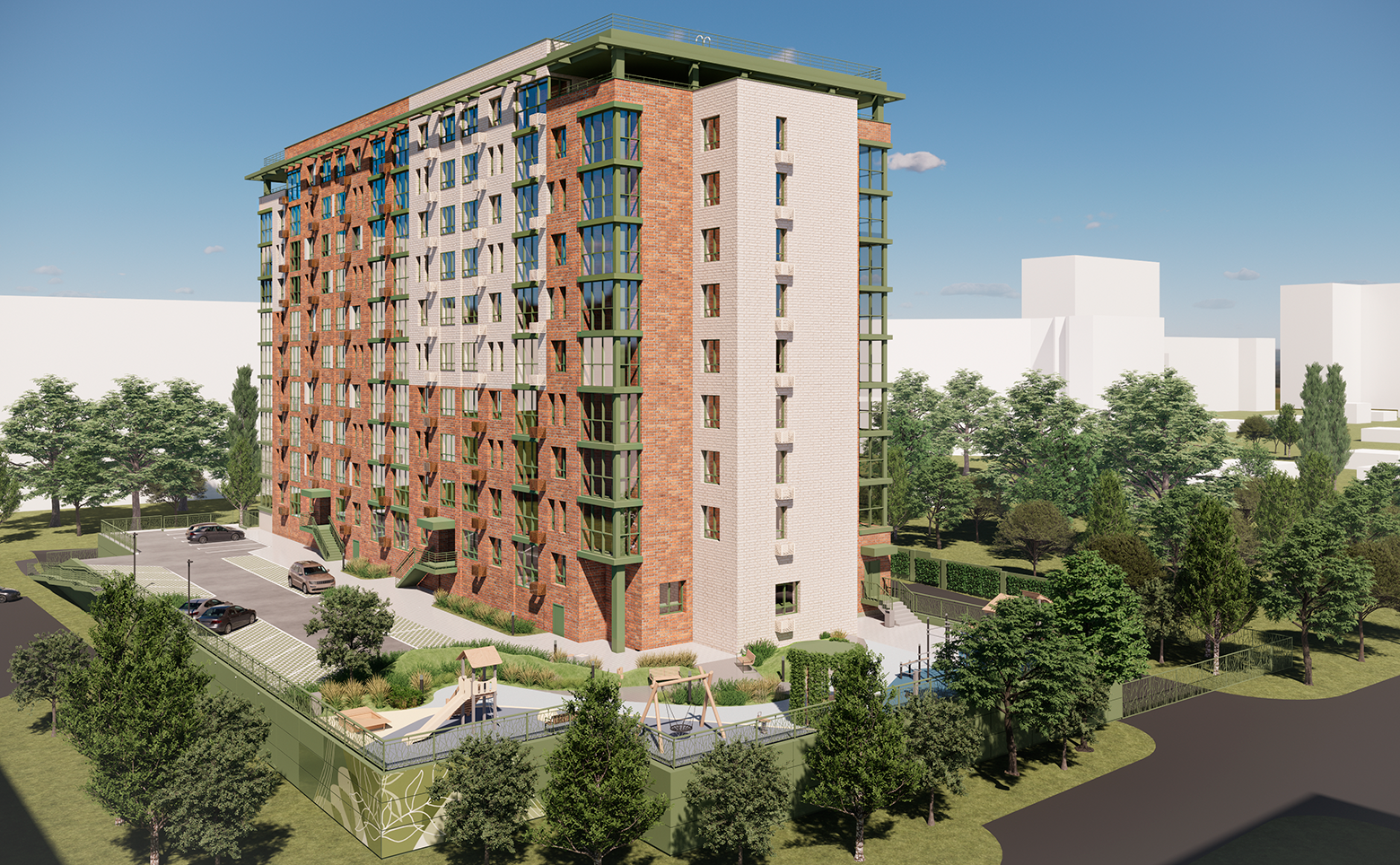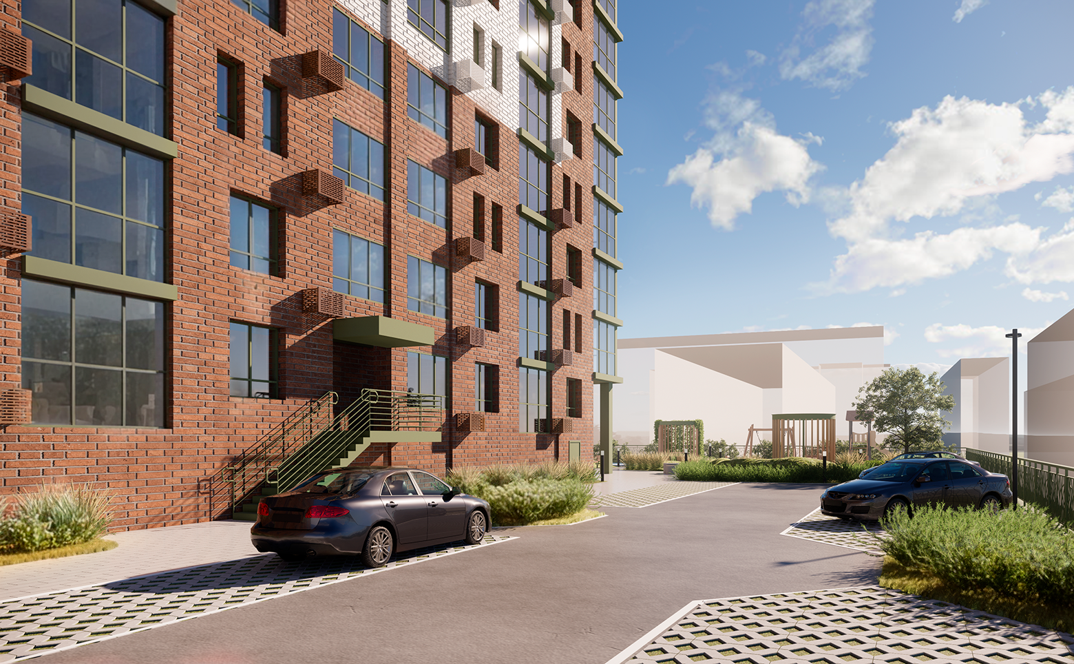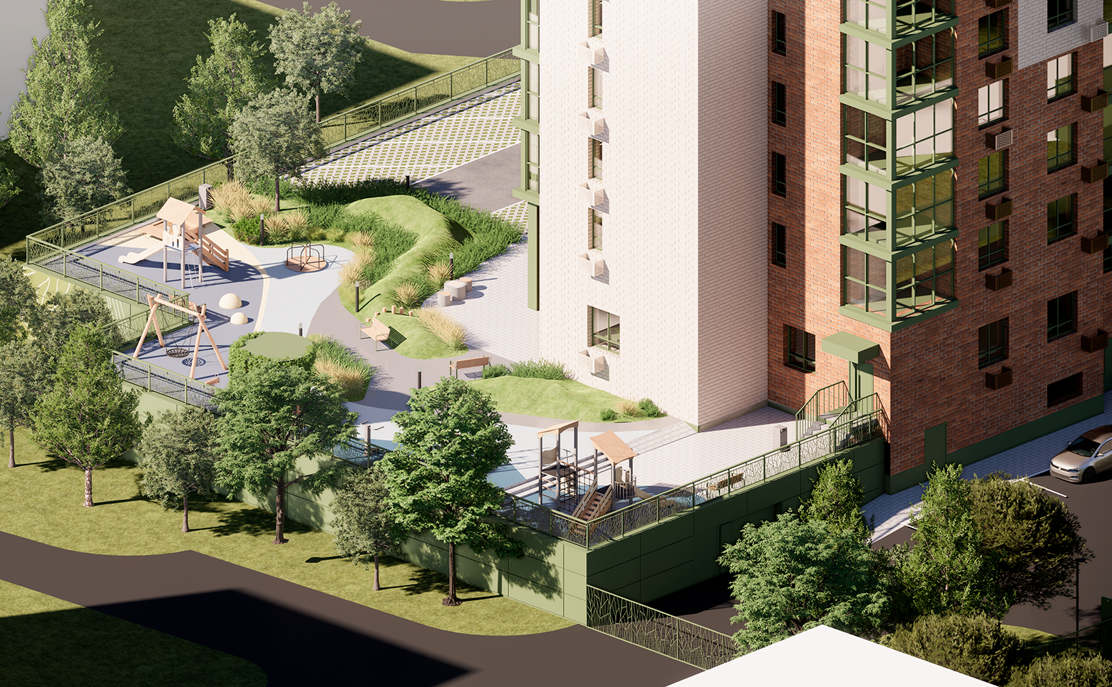 Территория огорожена забором и живой изгородью из зеленых насаждений. Во дворе расположена современная детская площадка с безопасным покрытием и work-out зона, оборудованная тренажерами. По периметру дома установлено видеонаблюдение, а также камерами оснащены домофоны. Для владельцев автомобилей предусмотрен подземный паркинг на 112 мест.