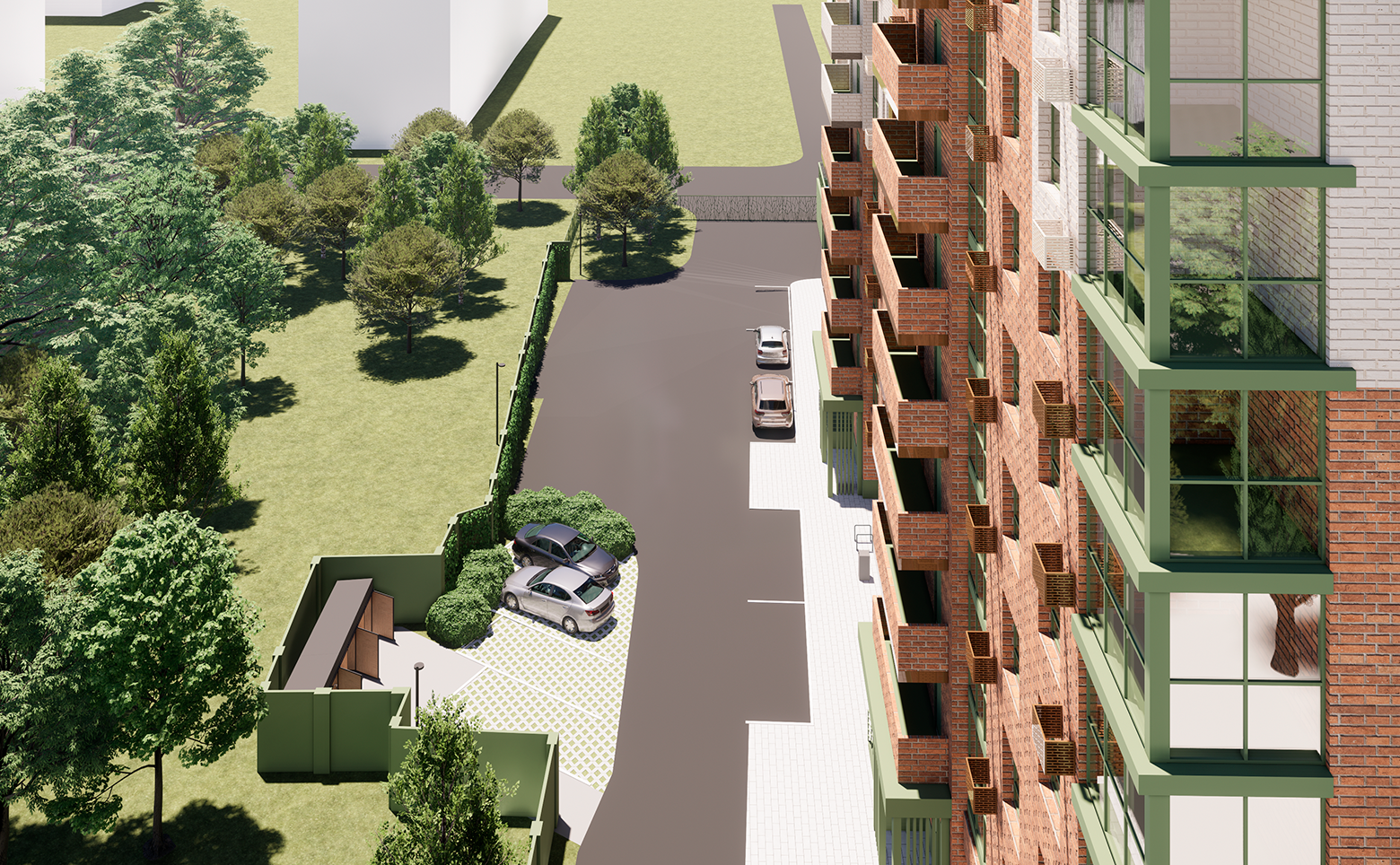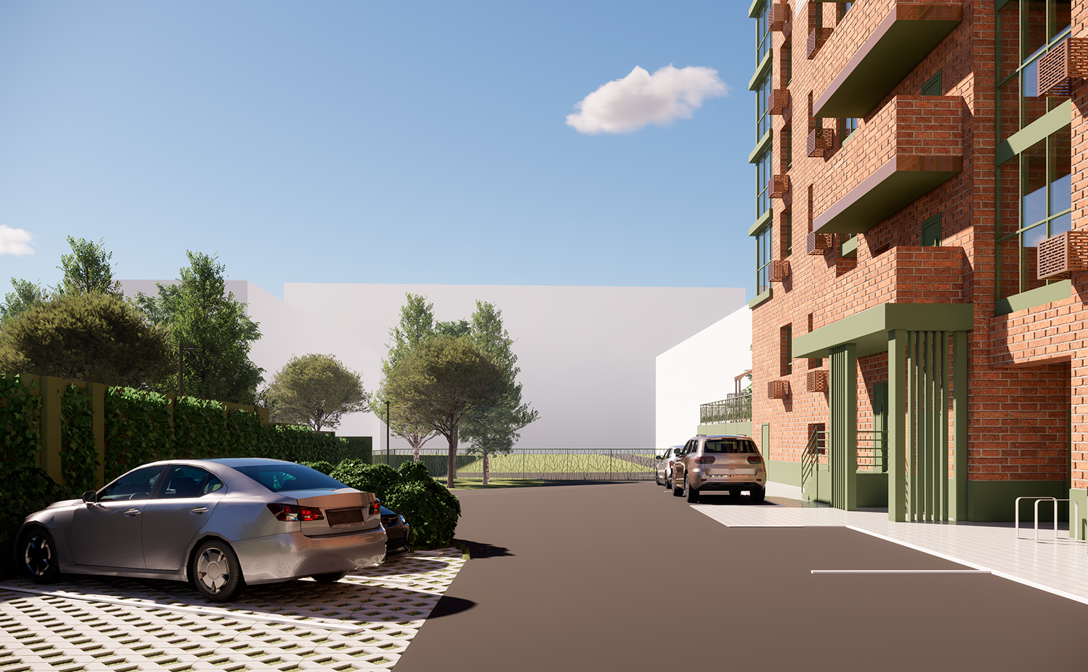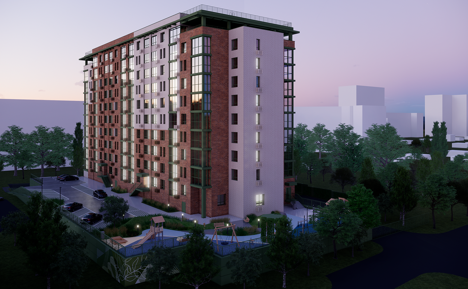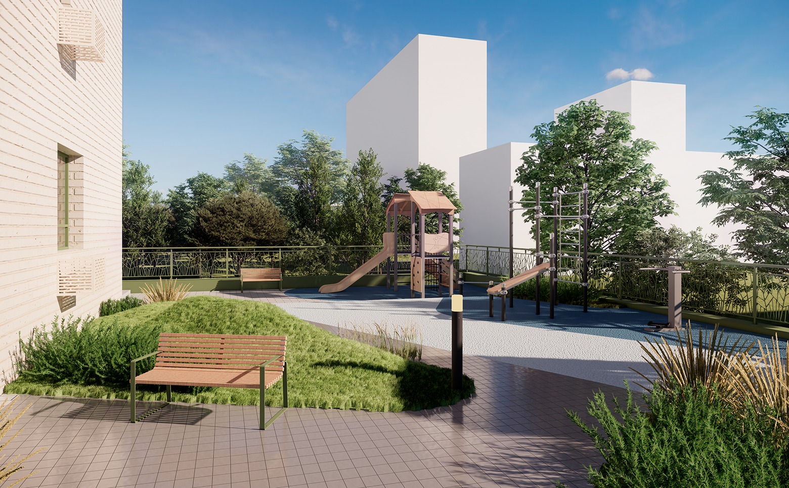 Территория огорожена забором и живой изгородью из зеленых насаждений. Во дворе расположена современная детская площадка с безопасным покрытием и work-out зона, оборудованная тренажерами. По периметру дома установлено видеонаблюдение, а также камерами оснащены домофоны. Для владельцев автомобилей предусмотрен подземный паркинг на 112 мест.