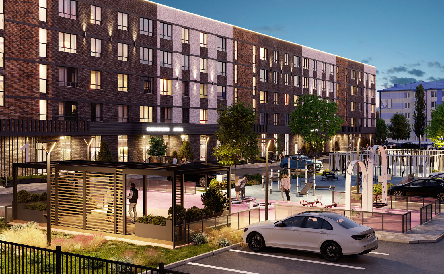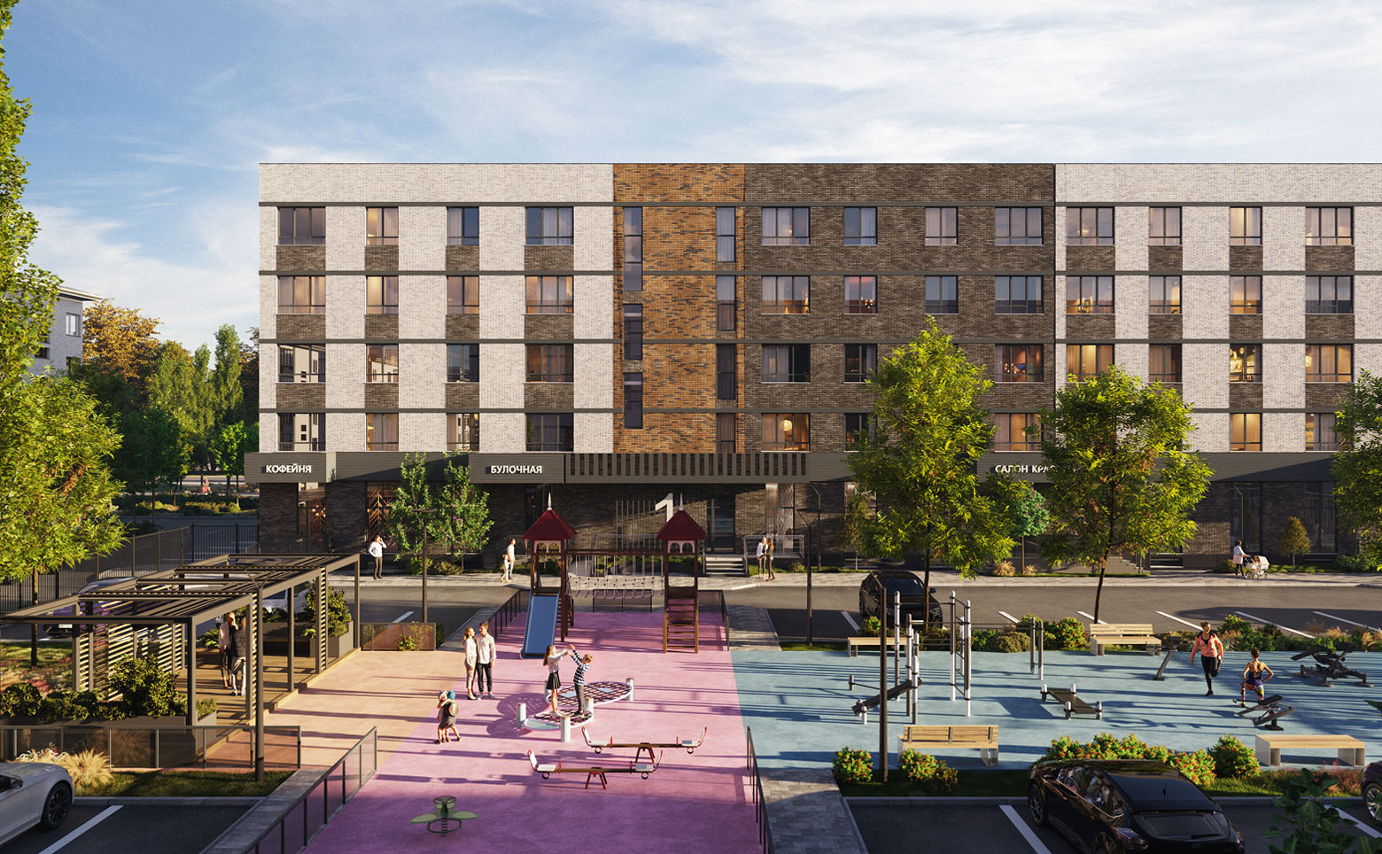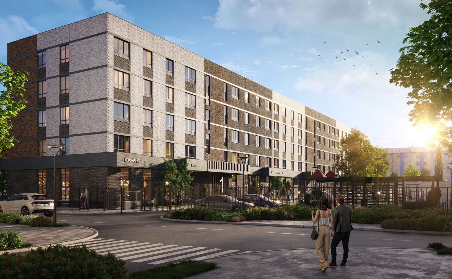 Во внутреннем дворе создан ландшафтный парк с авторским озеленением, лаунж-зонами, прогулочными аллеями, спортивными площадками и безопасными детскими пространствами. На первых этажах размещена коммерческая галерея. Территория закрыта, с контролем доступа, видеонаблюдением и системой Face ID. Для автомобилей предусмотрена стоянка.