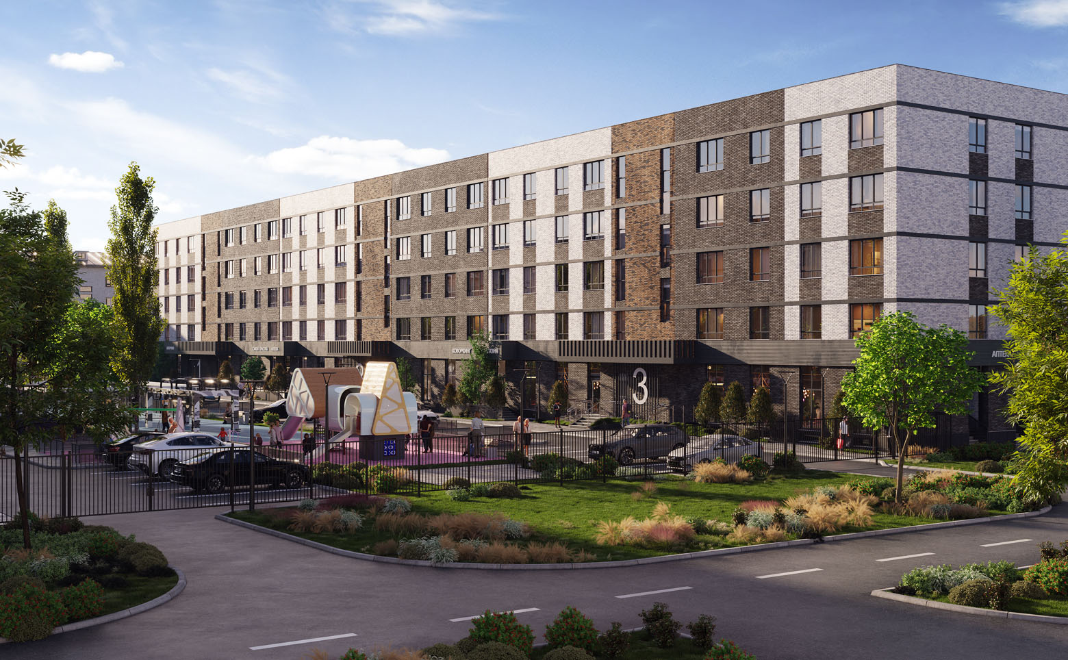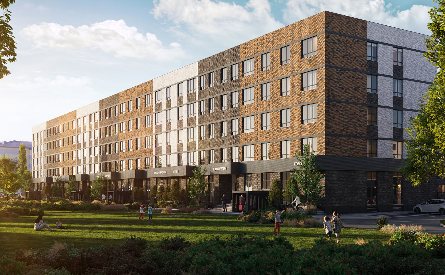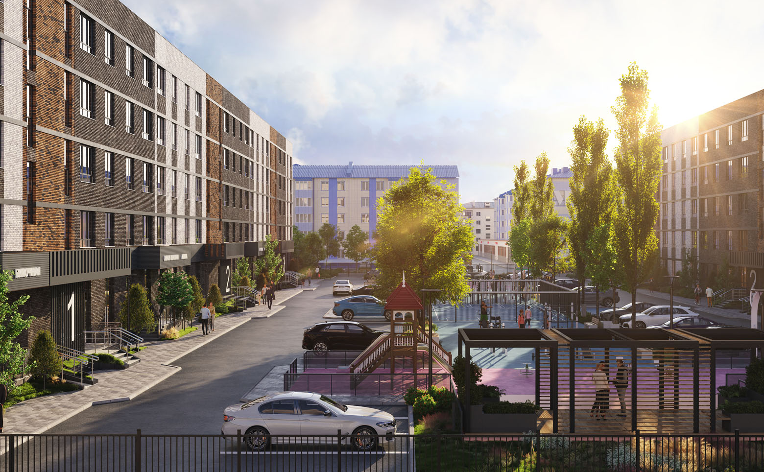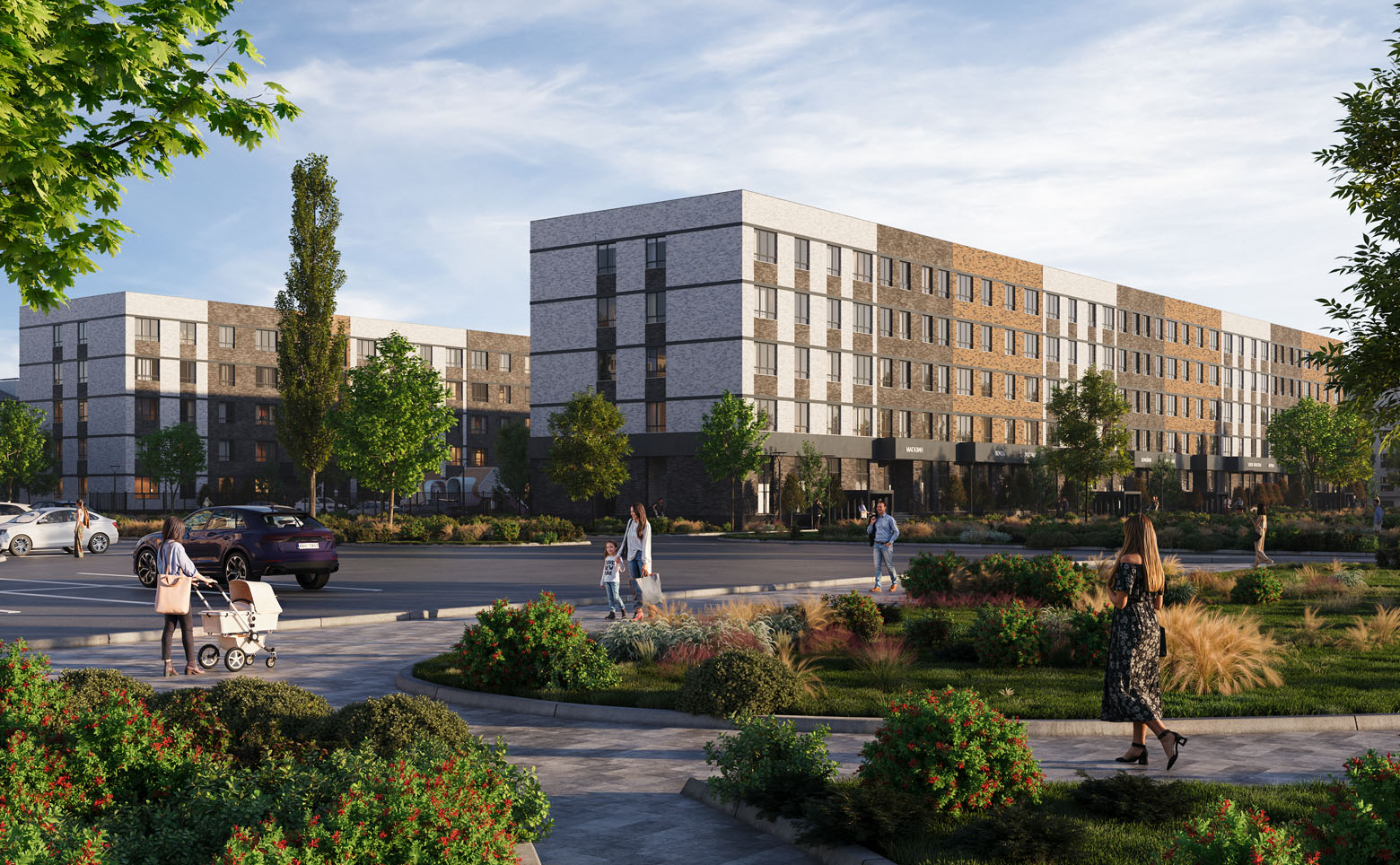 Во внутреннем дворе создан ландшафтный парк с авторским озеленением, лаунж-зонами, прогулочными аллеями, спортивными площадками и безопасными детскими пространствами. На первых этажах размещена коммерческая галерея. Территория закрыта, с контролем доступа, видеонаблюдением и системой Face ID. Для автомобилей предусмотрена стоянка.