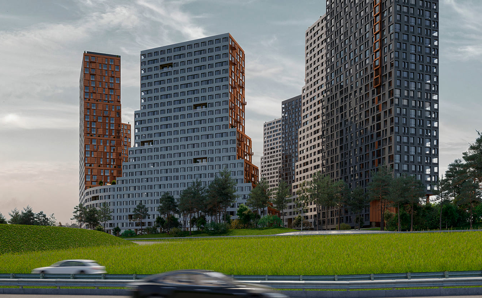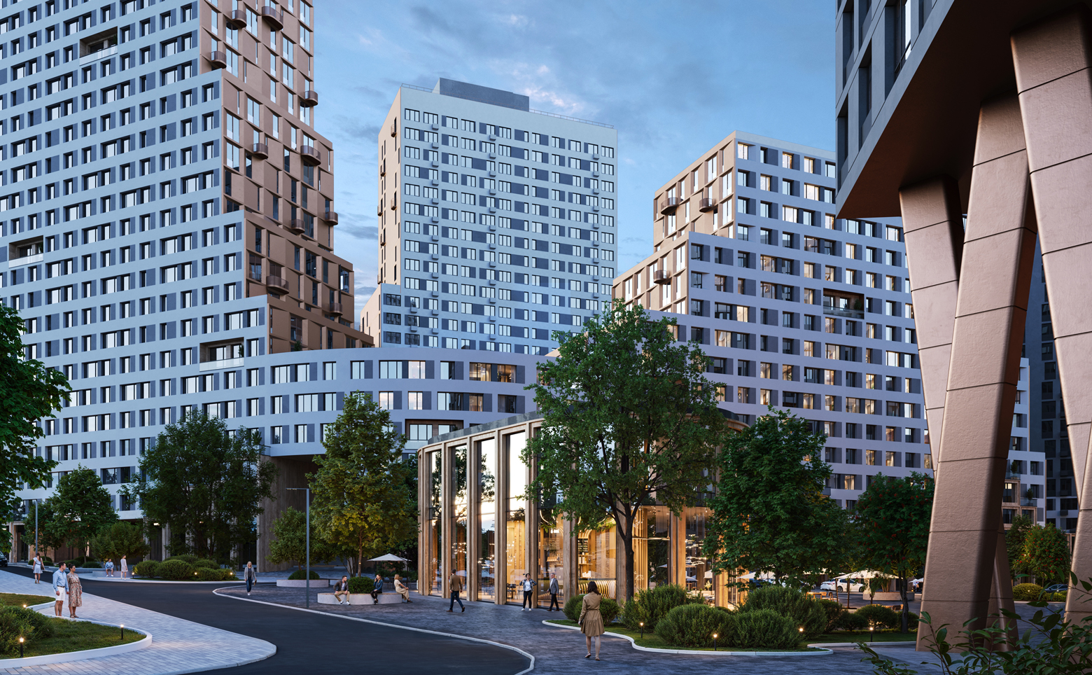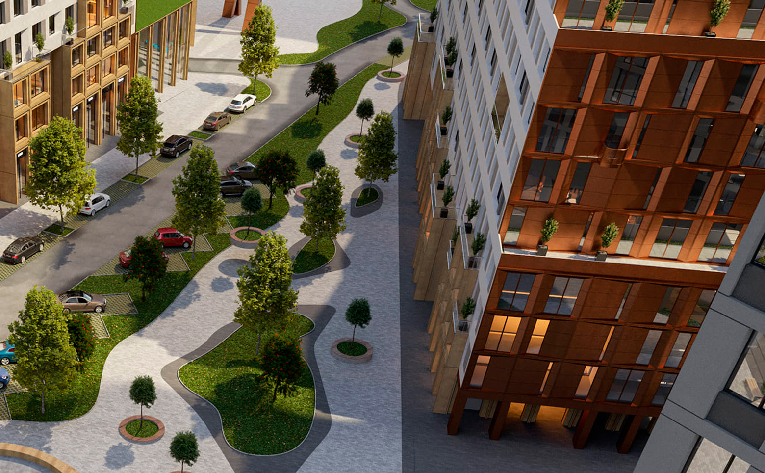 Территория комплекса закрыта и благоустроена как двор-парк с функциональным делением на зоны отдыха и активности. В составе проекта детский сад, скейт-парк, беговые и велосипедные дорожки, многофункциональная спортивная площадка, зоны для воркаута и настольного тенниса. Для детей обустроены игровые площадки, а для взрослых — теневые навесы и прогулочные маршруты. Выполнено озеленение деревьями и кустарниками. Управление обеспечивает собственная сервисная компания. Для автовладельцев организован двухуровневый подземный паркинг.