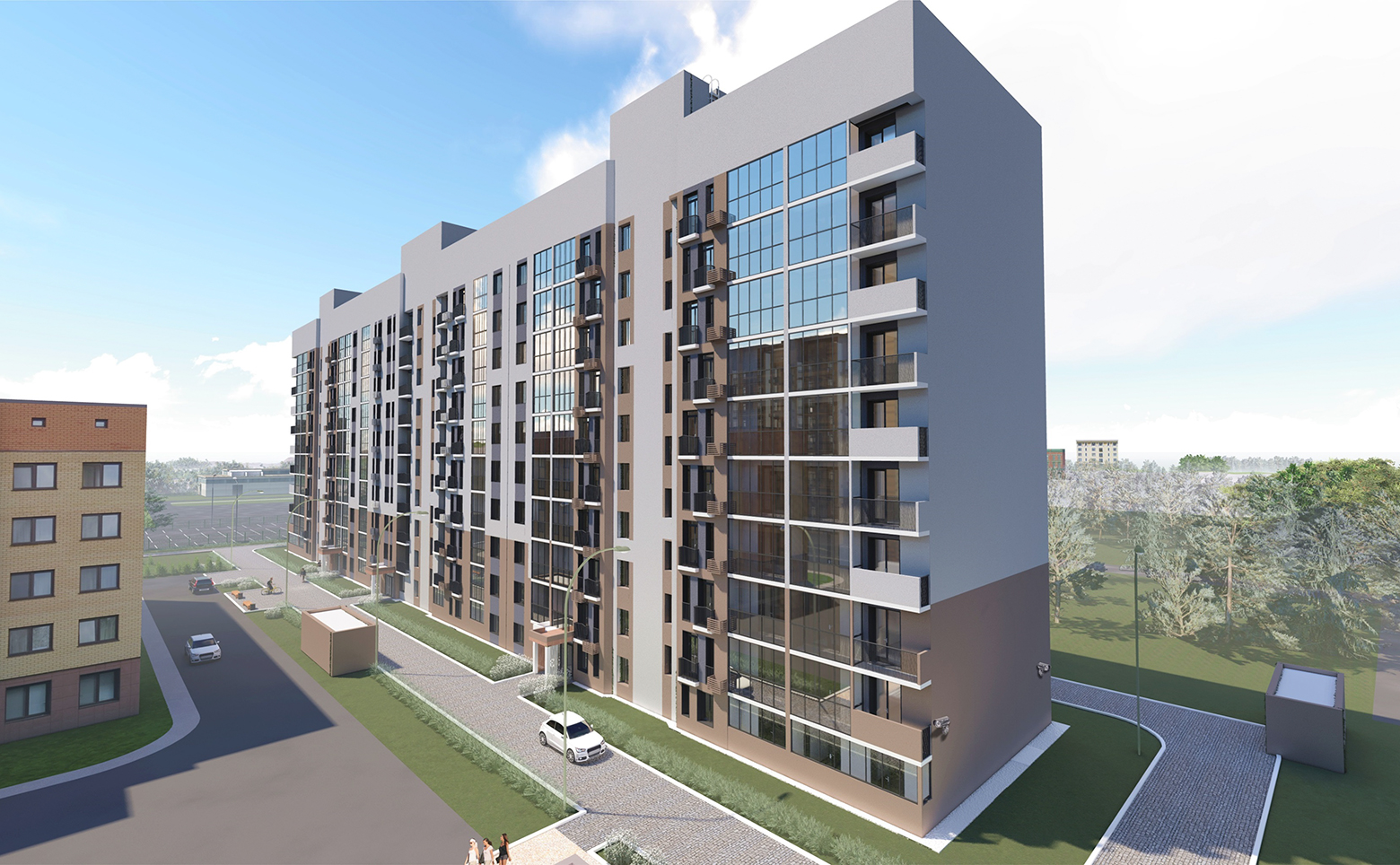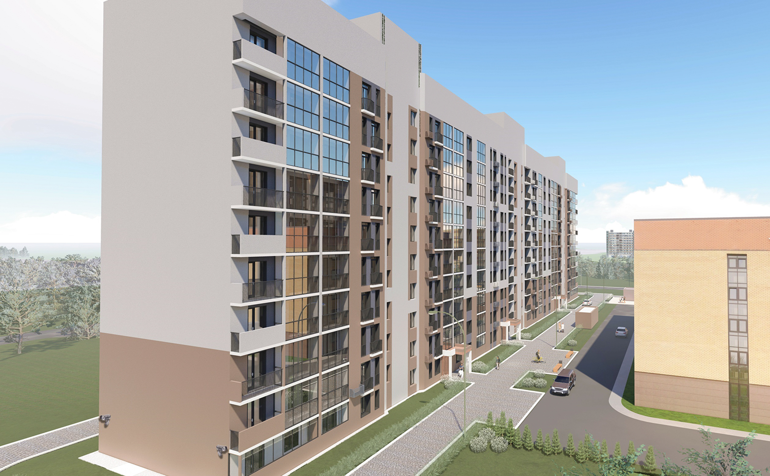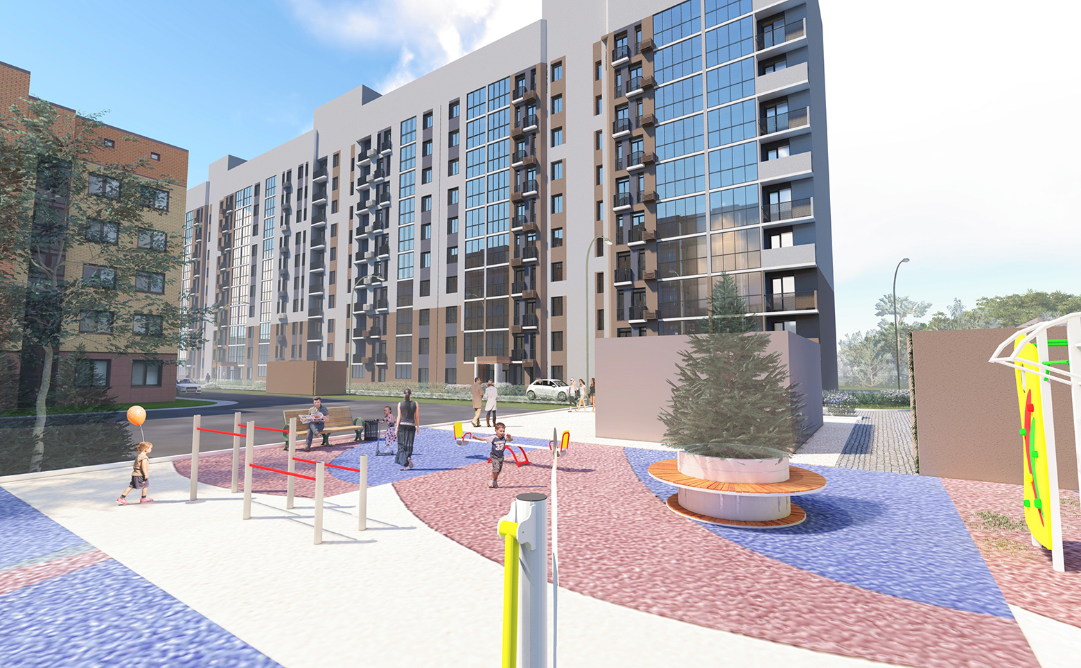 На территории комплекса предусмотрены уютные внутренние дворы с детскими площадками и зонами отдыха. Во дворе дома, а также вокруг него предусмотрено дизайнерское озеленение территории. Для катания на велосипедах и самокатах на территории комплекса оборудована велодорожка со специальным покрытием и местами для парковки велосипедов. Для владельцев автомобилей предусмотрен подземный паркинг.