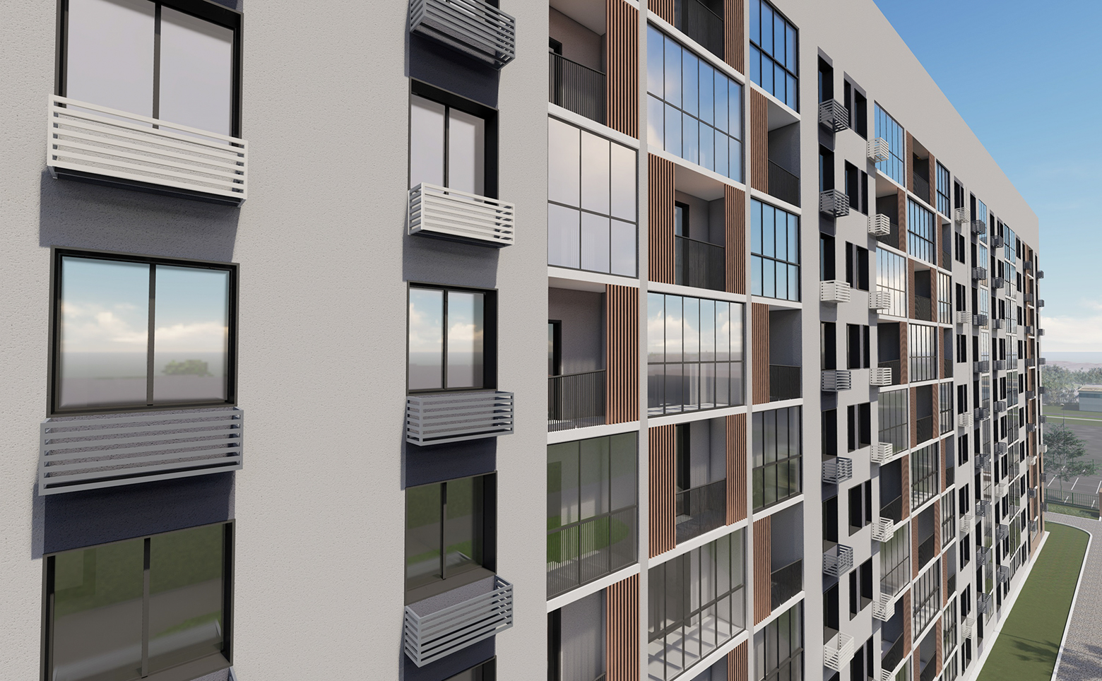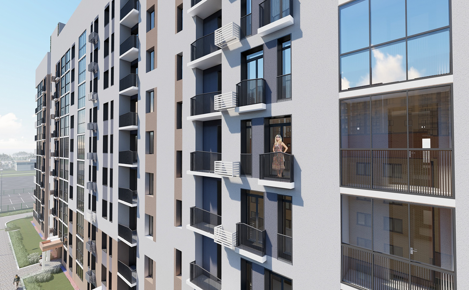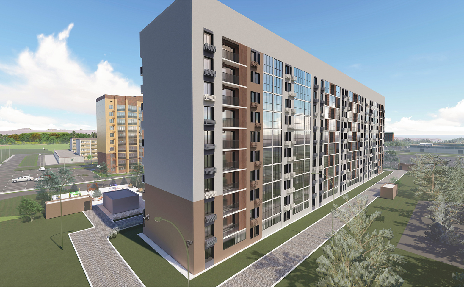 На территории комплекса предусмотрены уютные внутренние дворы с детскими площадками и зонами отдыха. Во дворе дома, а также вокруг него предусмотрено дизайнерское озеленение территории. Для катания на велосипедах и самокатах на территории комплекса оборудована велодорожка со специальным покрытием и местами для парковки велосипедов. Для владельцев автомобилей предусмотрен подземный паркинг.