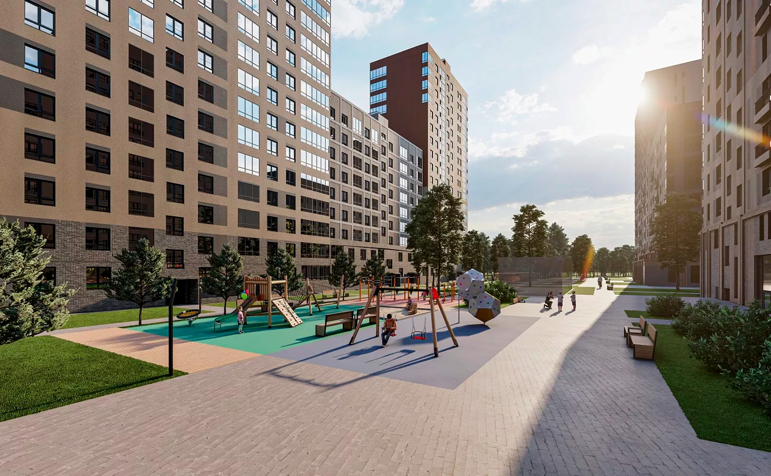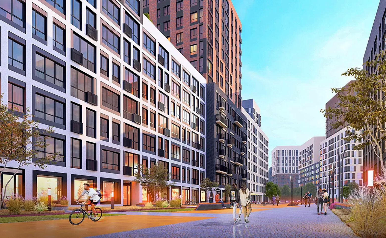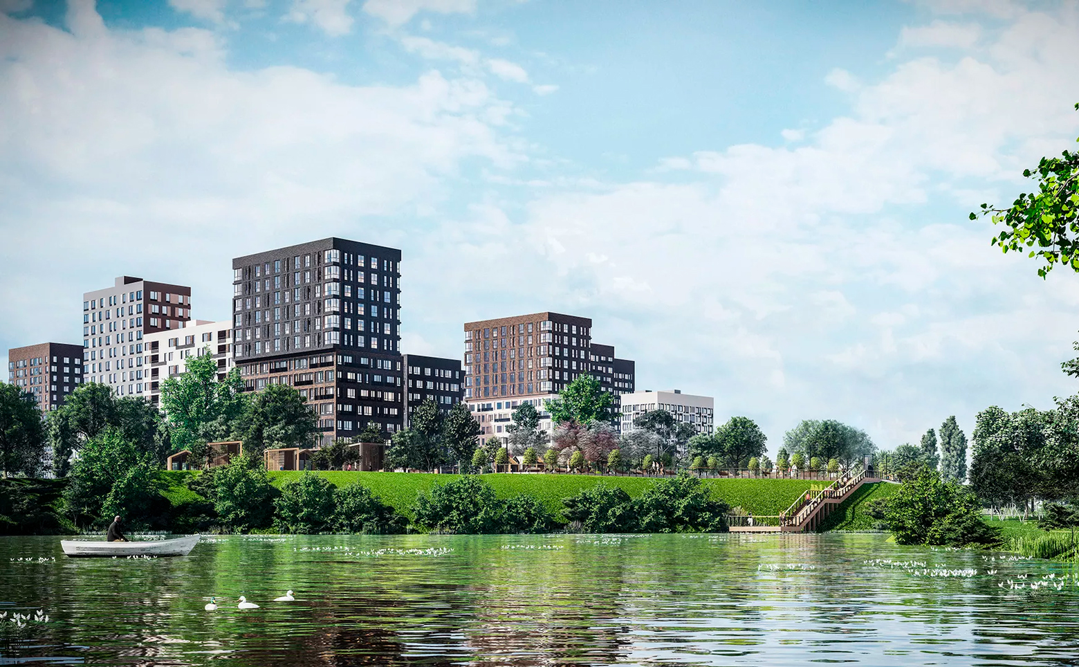 В жилом комплексе спроектирован центральный бульвар-променад, вдоль которого располагаются летние веранды кафе, детские площадки для разных возрастов, спортивные площадки, площадка для воркаута и зона для групповых тренировок, система велодорожек, связывающая дворы с парком. Изюминкой комплекса является собственное озеро и набережная. Для владельцев автомобилей предусмотрен подземный паркинг.