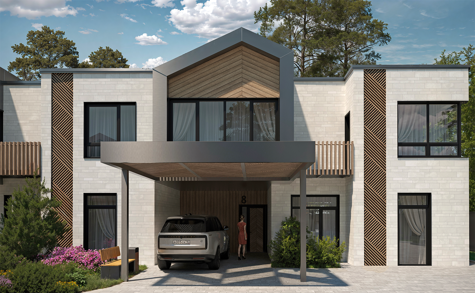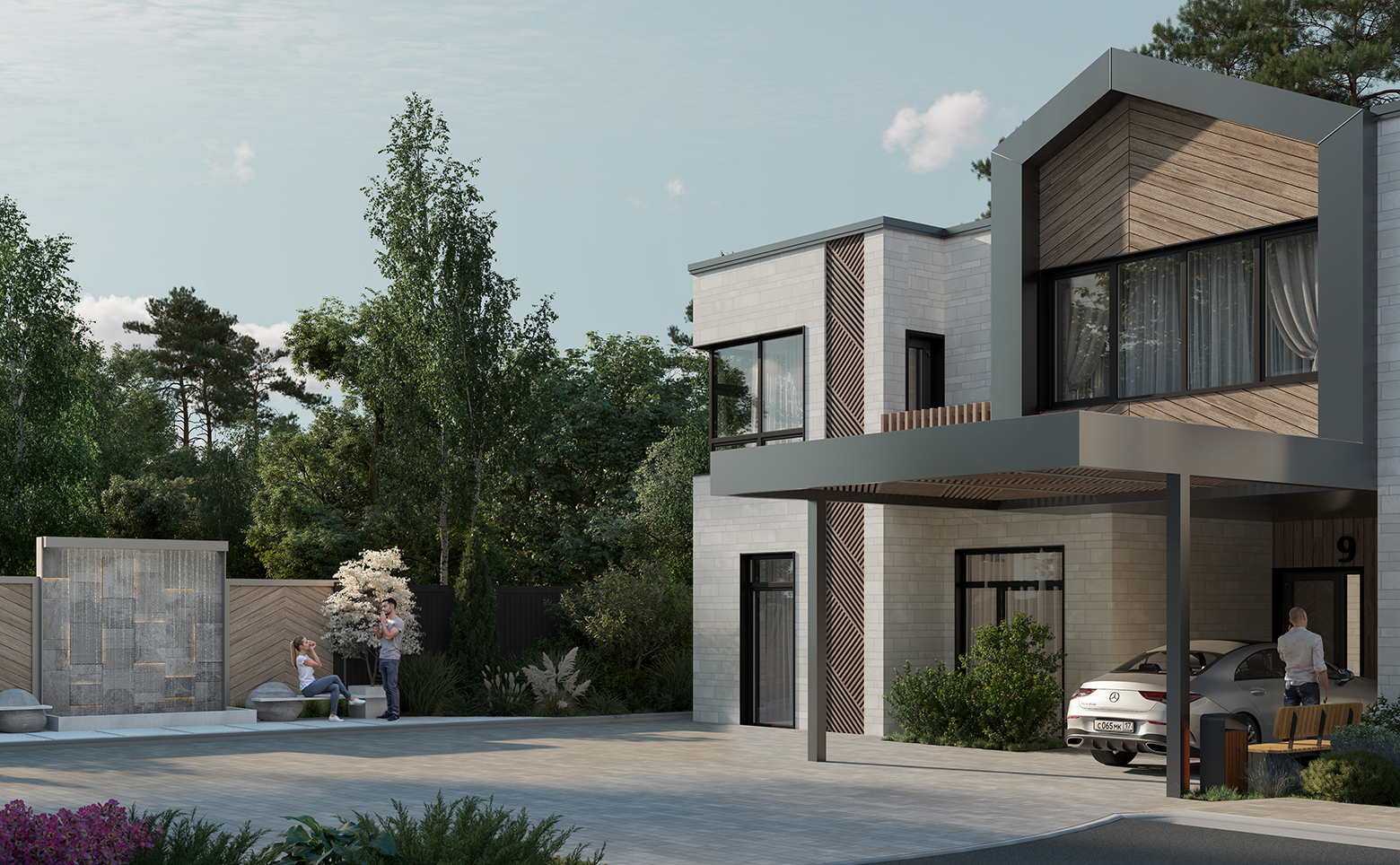 Коттеджный комплекс состоит из 10 эксклюзивных 2-этажных домов, возведенных по технологии монолитного каркаса со стенами из керамического кирпича. Фасады выполнены в комбинированной отделке: фиброцементная плитка, панели Кликфальц, планкен, ламели из бруса и декоративная штукатурка. На каждом участке предусмотрена стоянка для автомобилей.