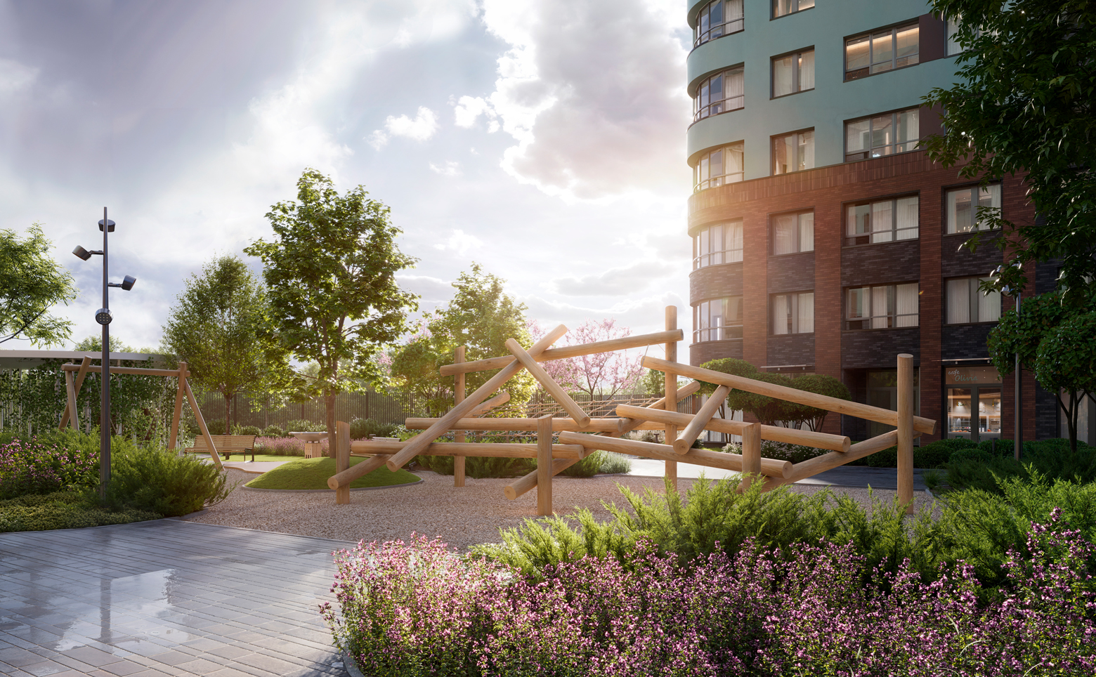 На территории — 2 приватных двора, разделенные аллеей с фруктовым садом, беседки и зоны отдыха, зоны для занятий йогой, коворкинг на открытом воздухе, спортивные и детские площадки. В комплексе также есть детская поликлиника. Для владельцев автомобилей предусмотрен закрытый паркинг на 300 мест. На территории ведется круглосуточное видеонаблюдение.