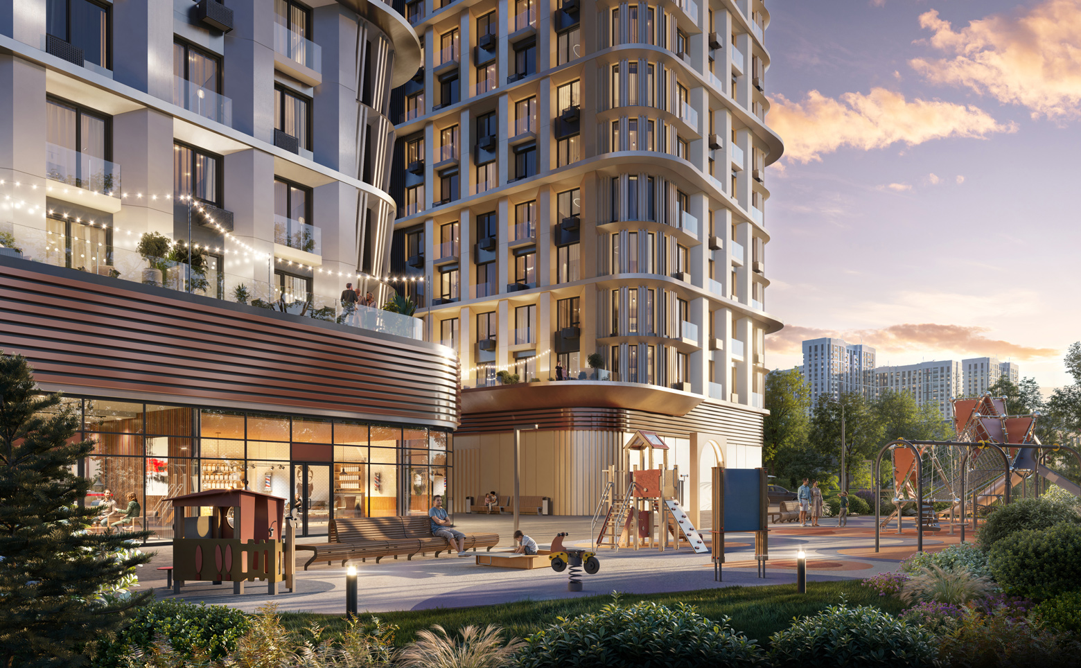Общая площадь озеленения на территории проекта составляет более 1,8 тыс. кв. м. На благоустроенной территории расположены спортивная и детская игровая площадка, места для отдыха. В стилобатной части и на первых этажах корпусов находятся коммерческие помещения. В комплексе предусмотрено 155 машиномест, 129 из которых расположены в подземном паркинге, а 26 — на плоскостной парковке.