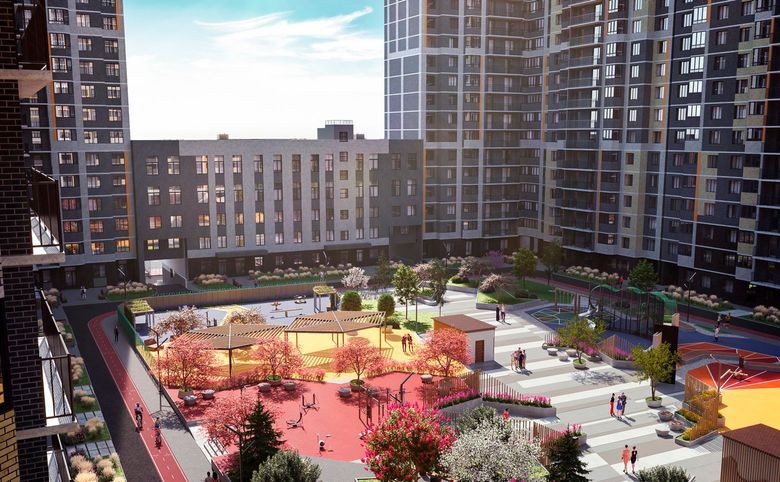 Территория жилого комплекса благоустроена. Внимание уделили придомовой территории, где кроме традиционного ландшафтного озеленения c системой автоматического полива установлены современные детские и спортивные площадки. На первых этажах расположены коммерческие помещения. Для владельцев автомобилей предусмотрена стоянка и подземный паркинг.
