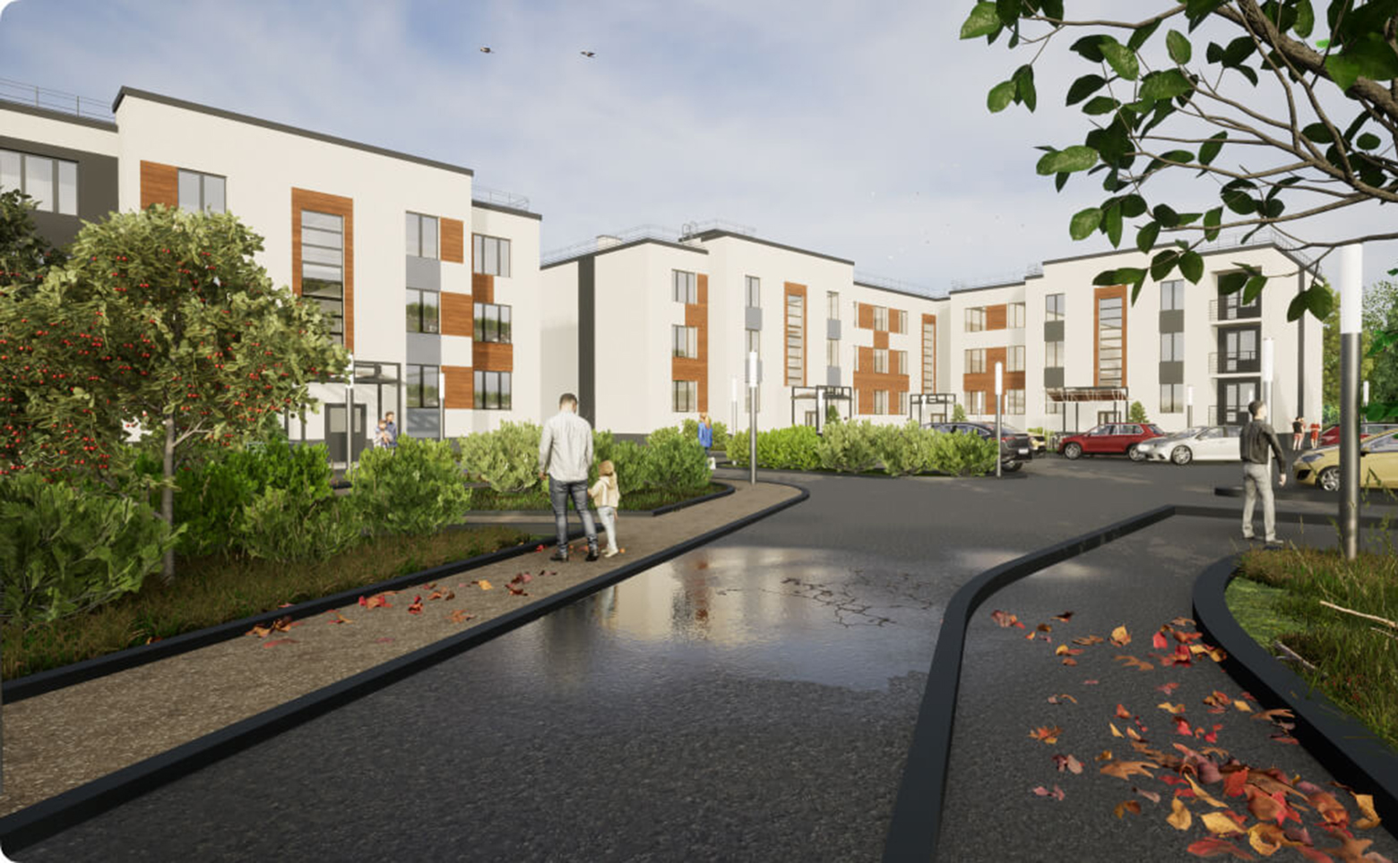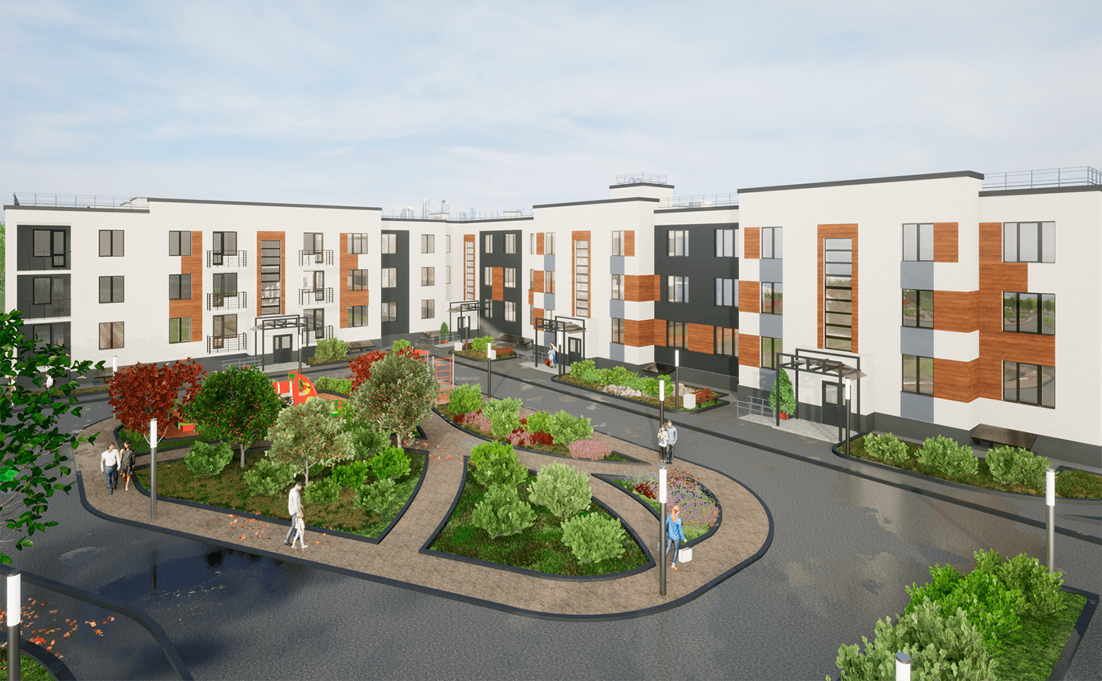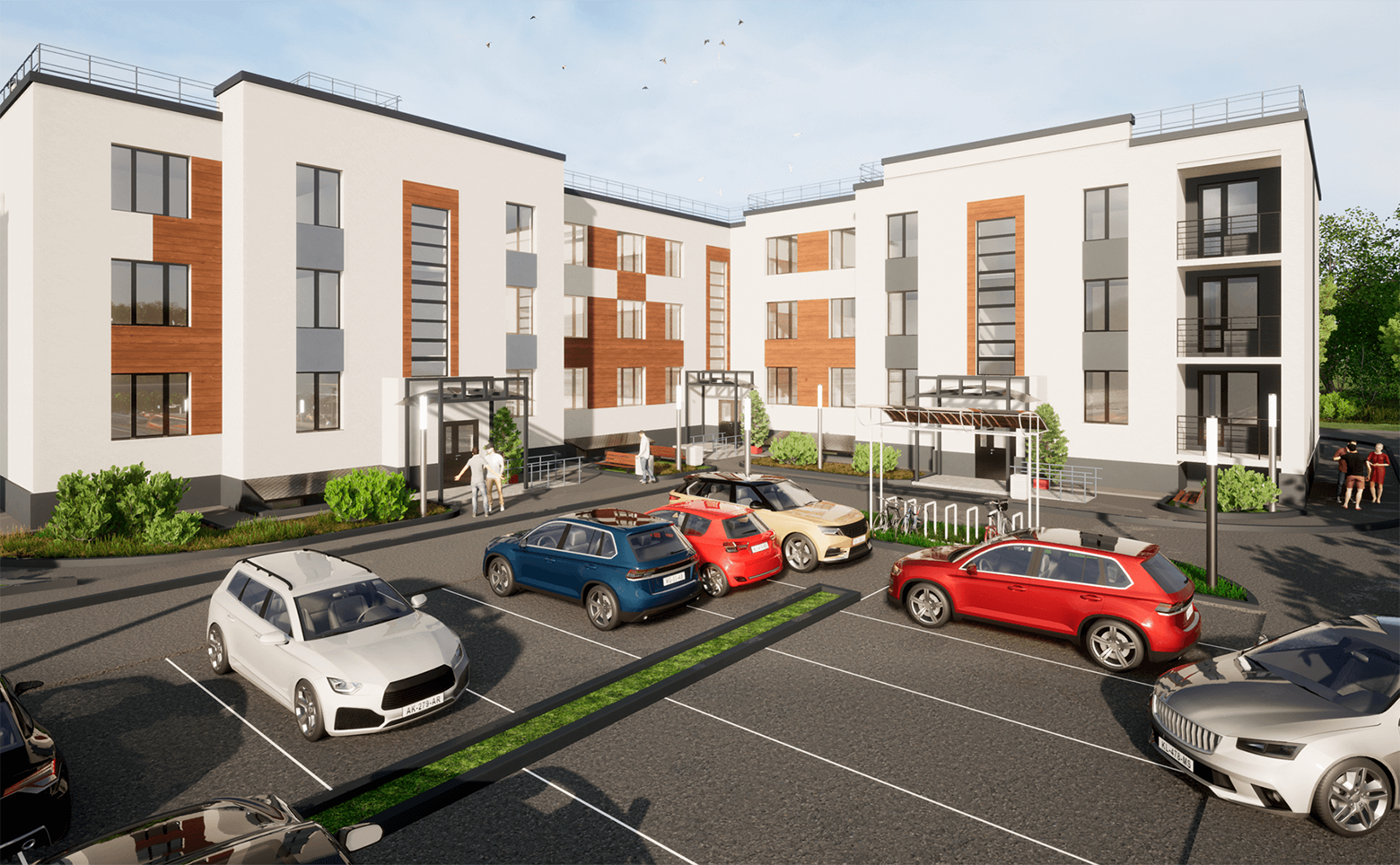 Жилой комплекс представляет собой два корпуса возведенных по газобетон-монолитной технологии высотой в 3 этажа. Фасады облицованы штукатуркой.