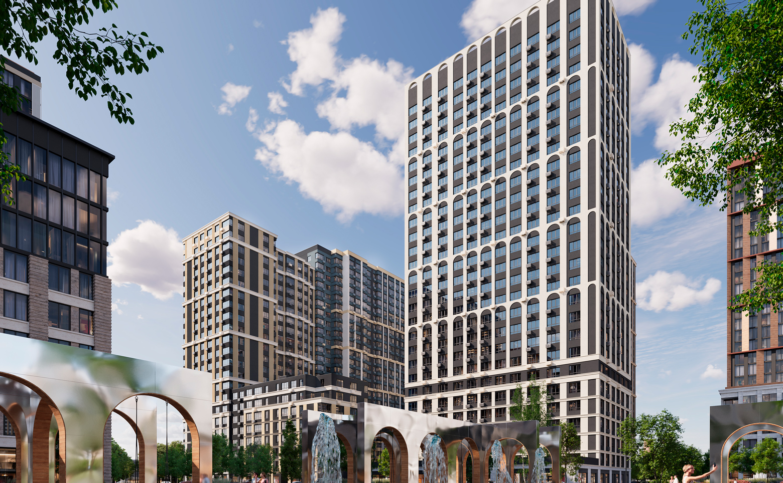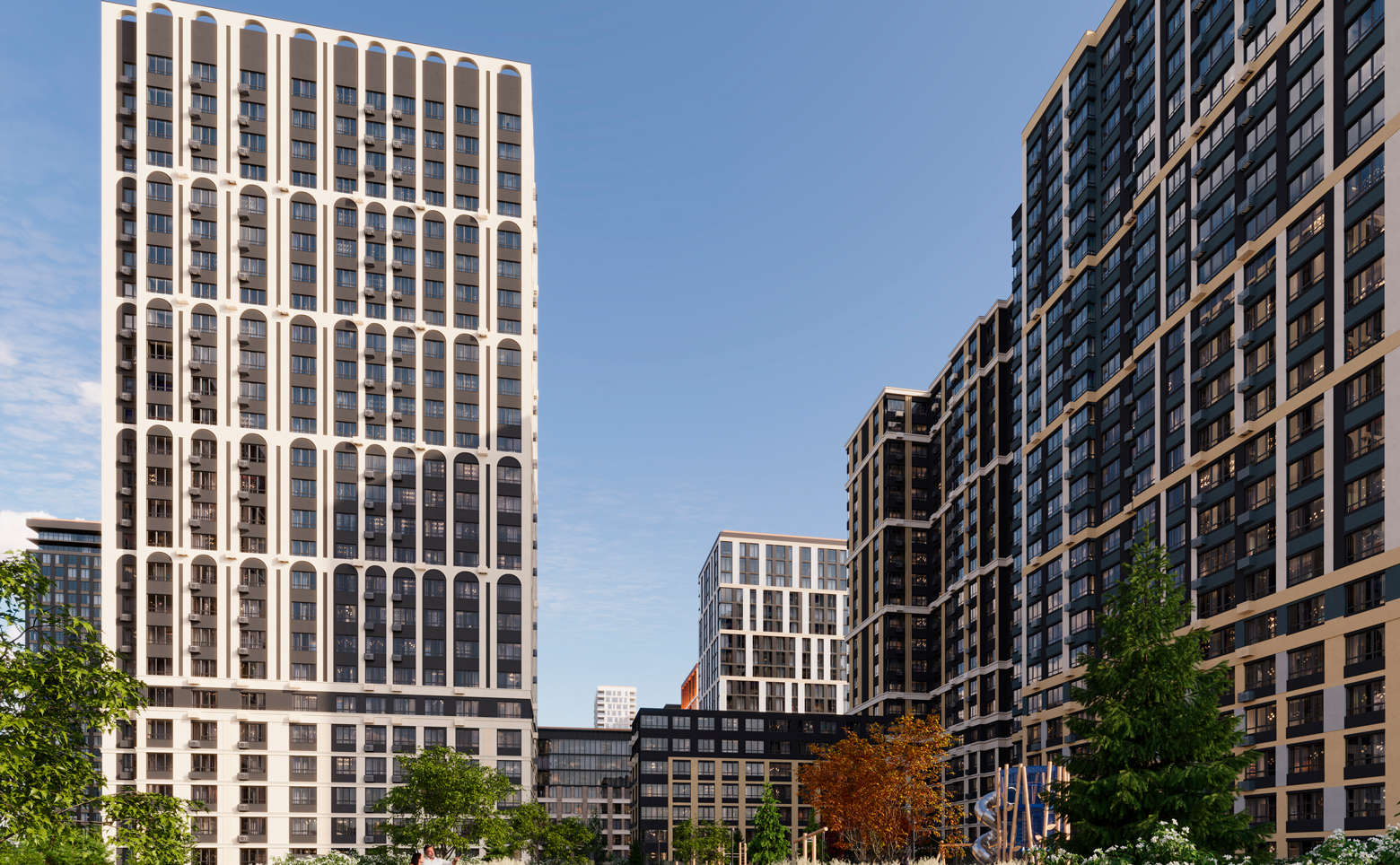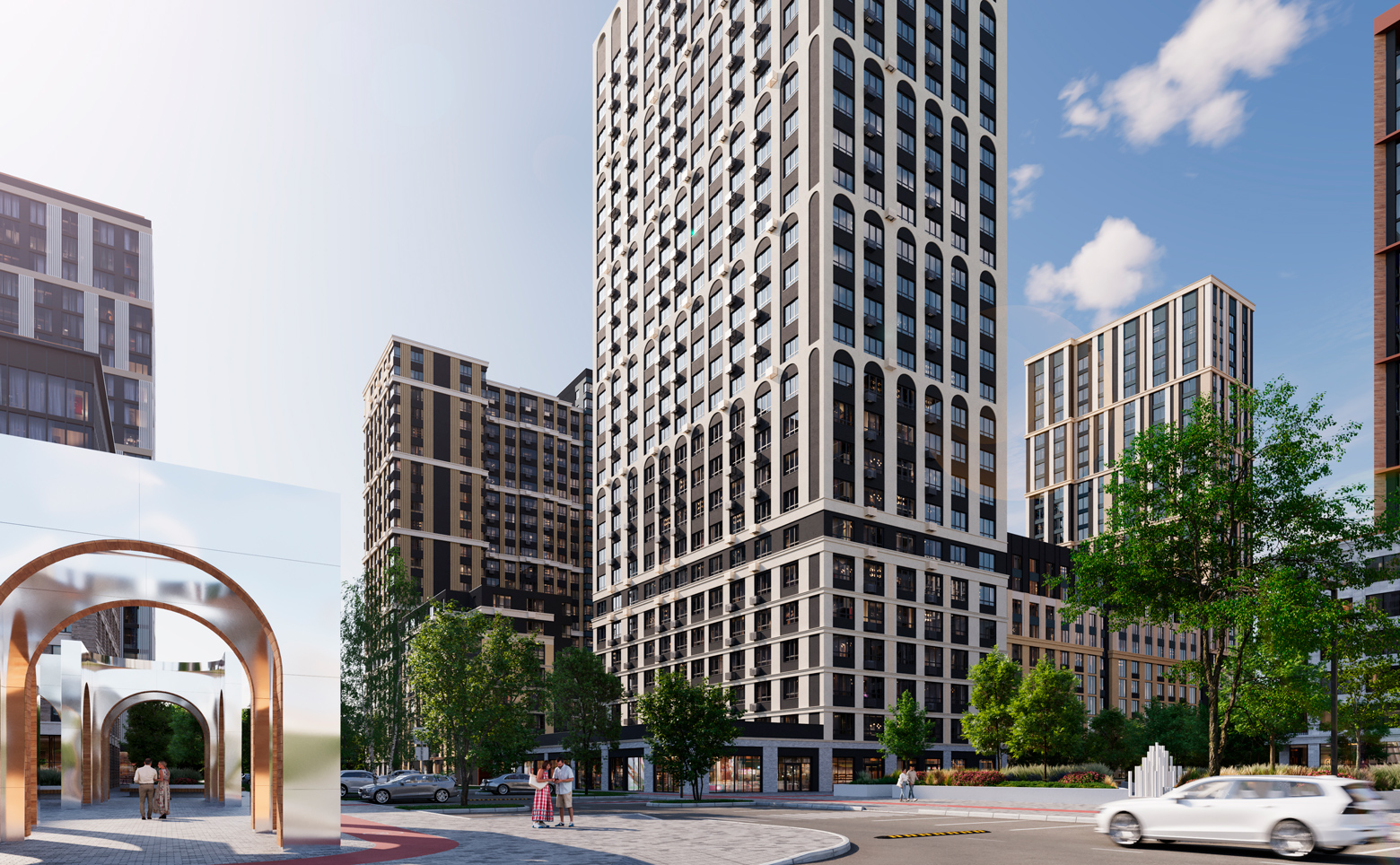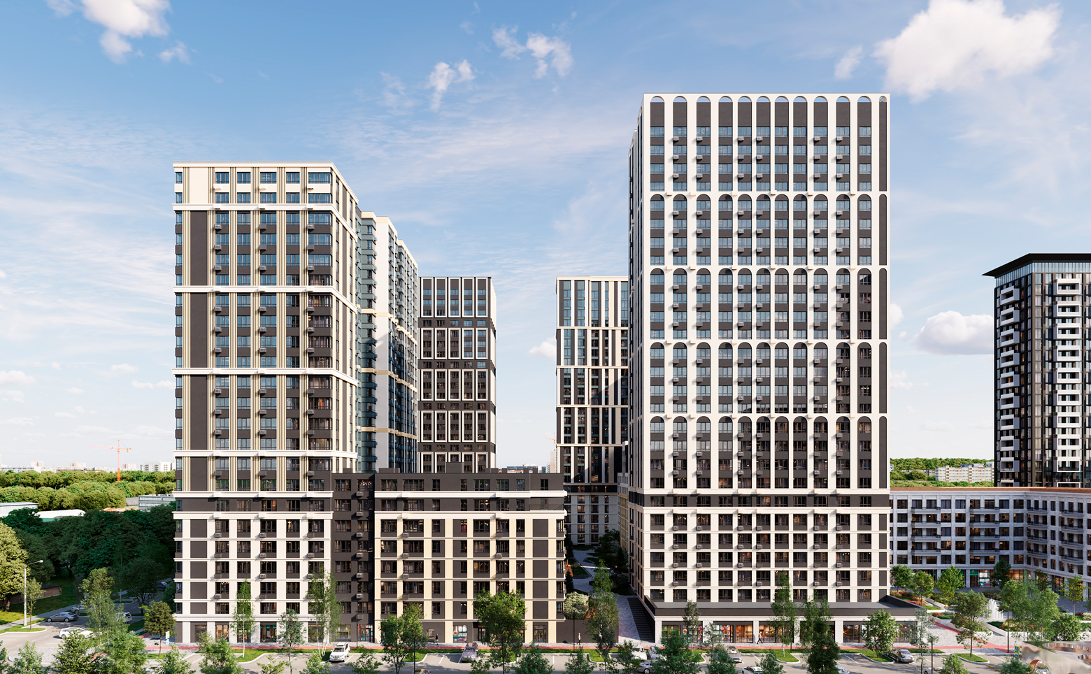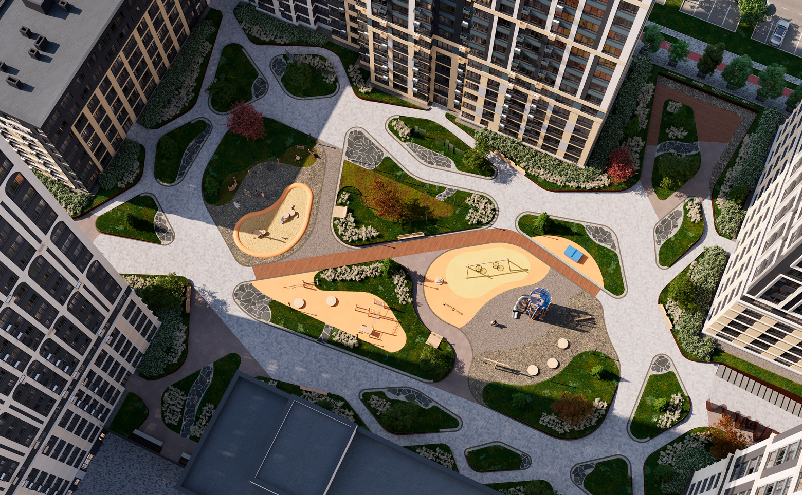 Внутренний двор распложен на уровне второго этажа и изолирован от внешнего доступа. На территории создана универсальная площадка для детей любого возраста. Также обустроены спортивные зоны: комплекс с турниками и скамьей для пресса, кочки на пружине для тренировки равновесия, канатный тренажер, зона для занятий йогой, теннисный стол. Между жилыми кварталами проложены бульвары, велодорожки и зеленые парки. На первых этажах корпусов расположены коммерческие помещения. Для владельцев автомобилей предусмотрены стоянка и подземный паркинг.