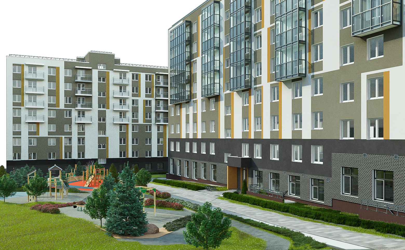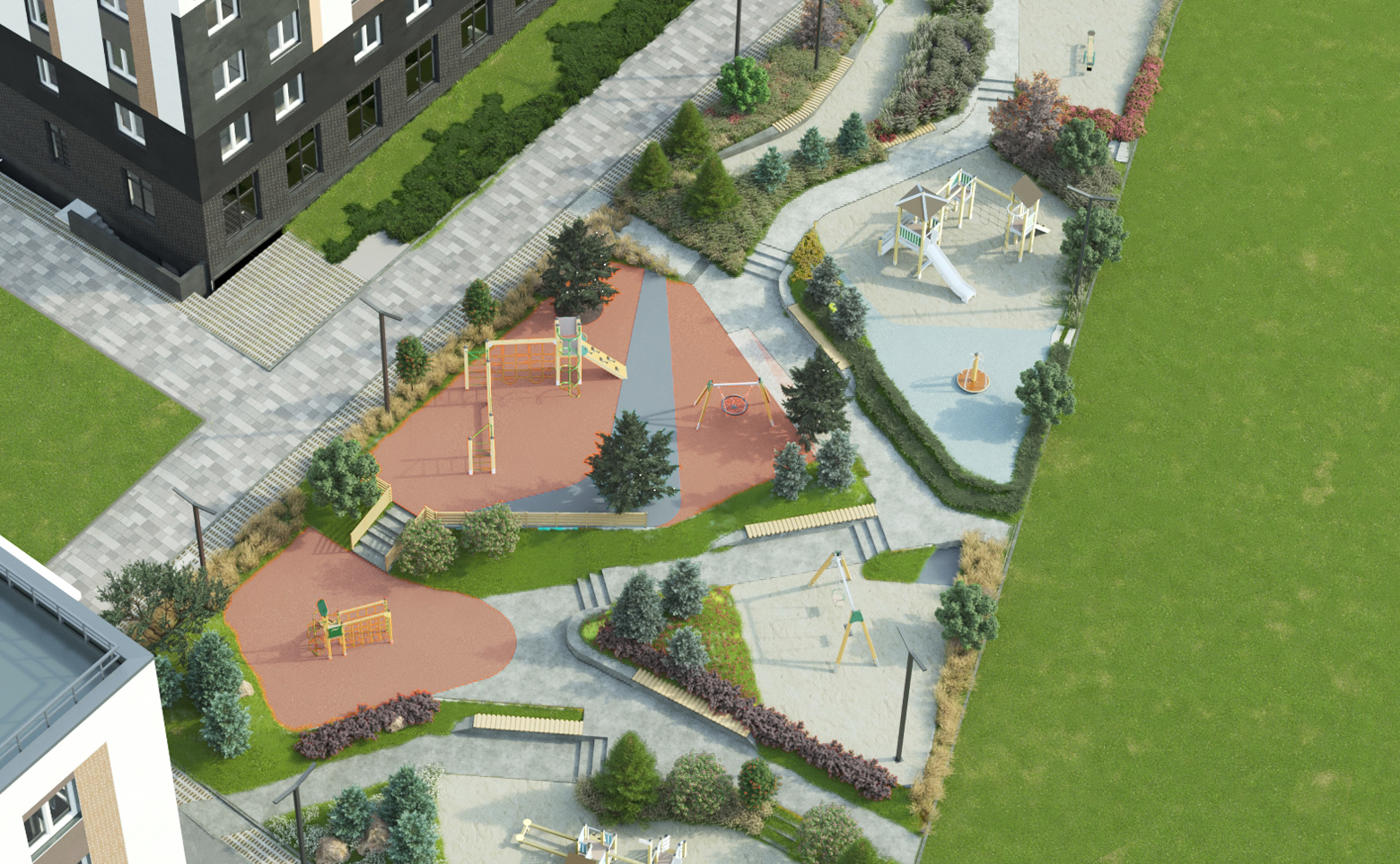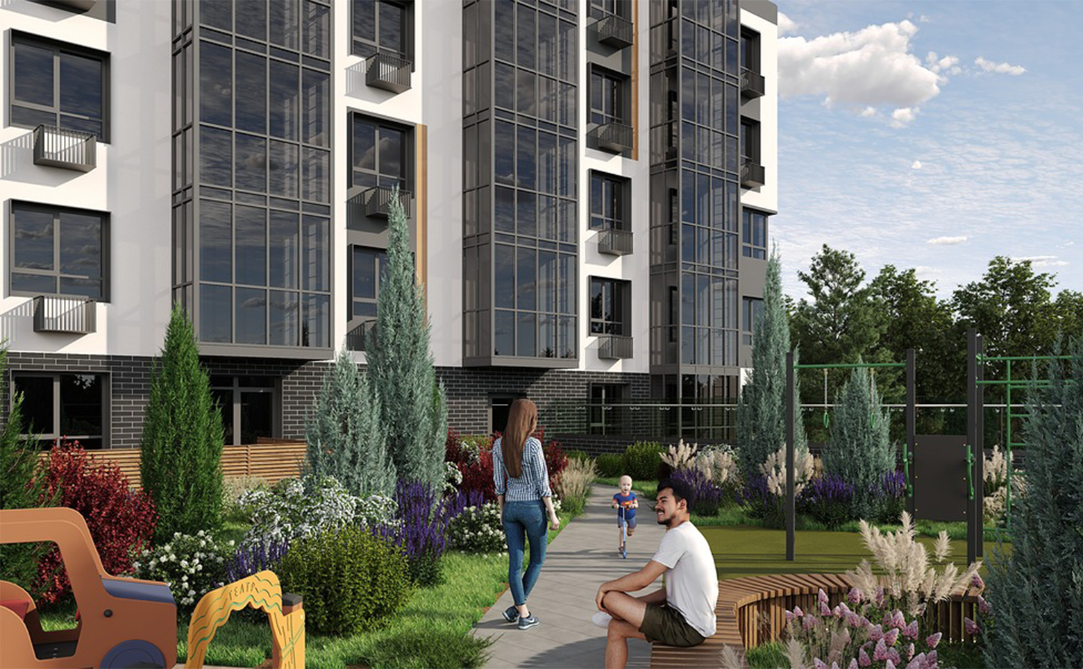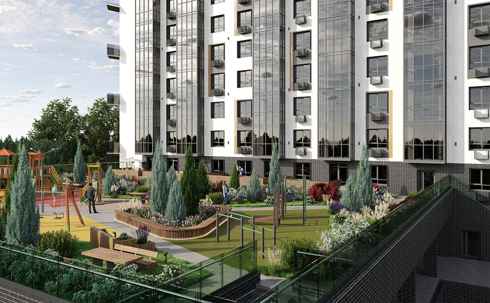 Территория комплекса разделена на зоны отдыха, досуга, игровые и спортивные площадки. Так же частный детский сад и образовательный центр с бассейном находятся внутри комплекса. Для автовладельцев предусмотрена стоянка.