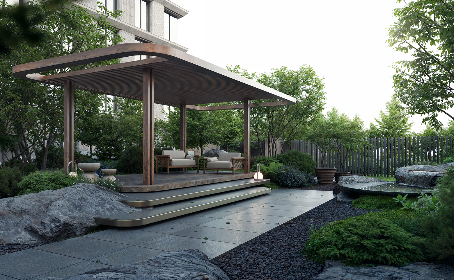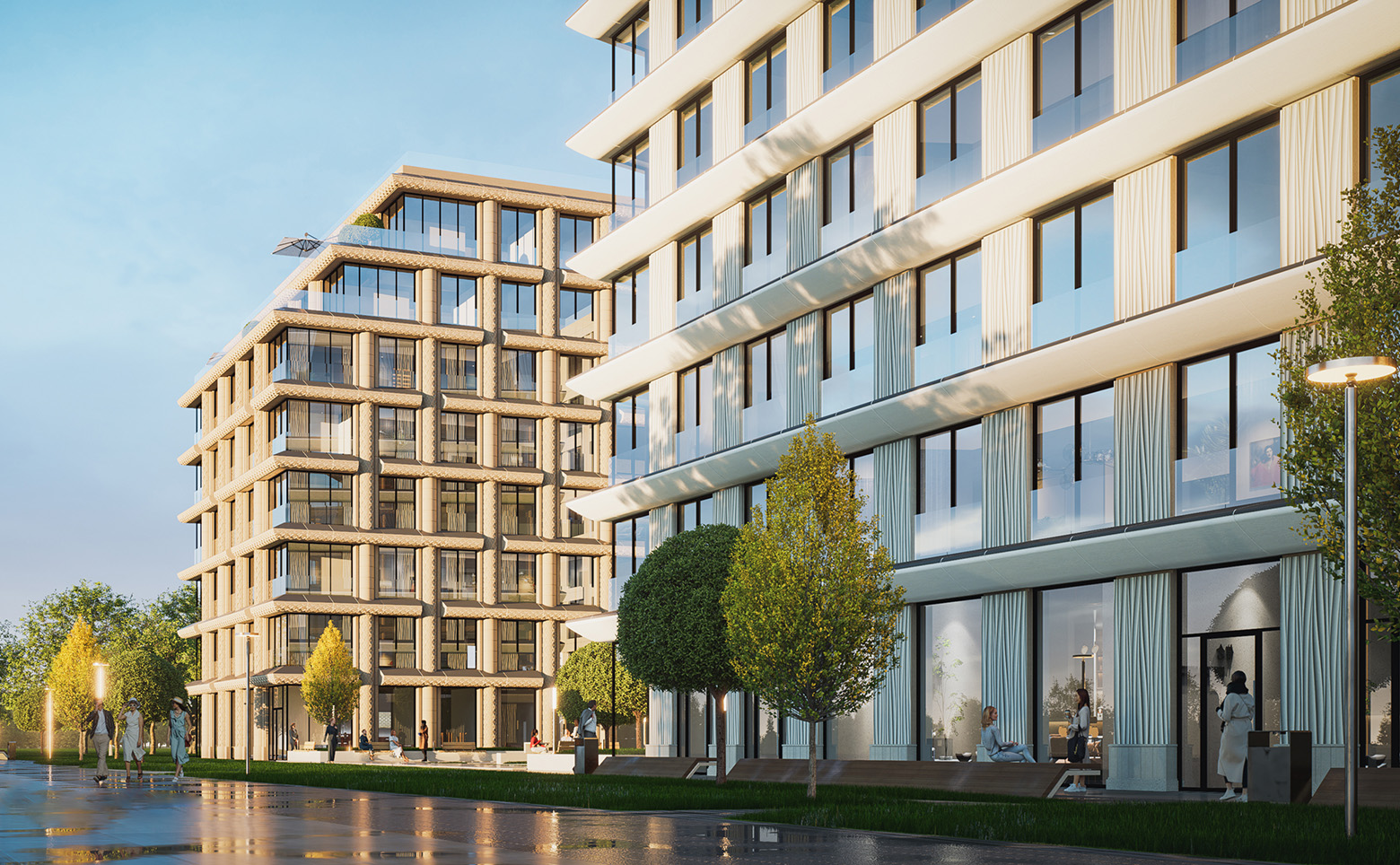 Благоустройство территории выполнено бюро «DEREVO PARK». Для резидентов комплекса предоставляется 1000 метров общественных пространств, круглосуточные услуги и сервис 5* отелей: лобби с ресепшн и консьерж-сервисом, коворкинг.