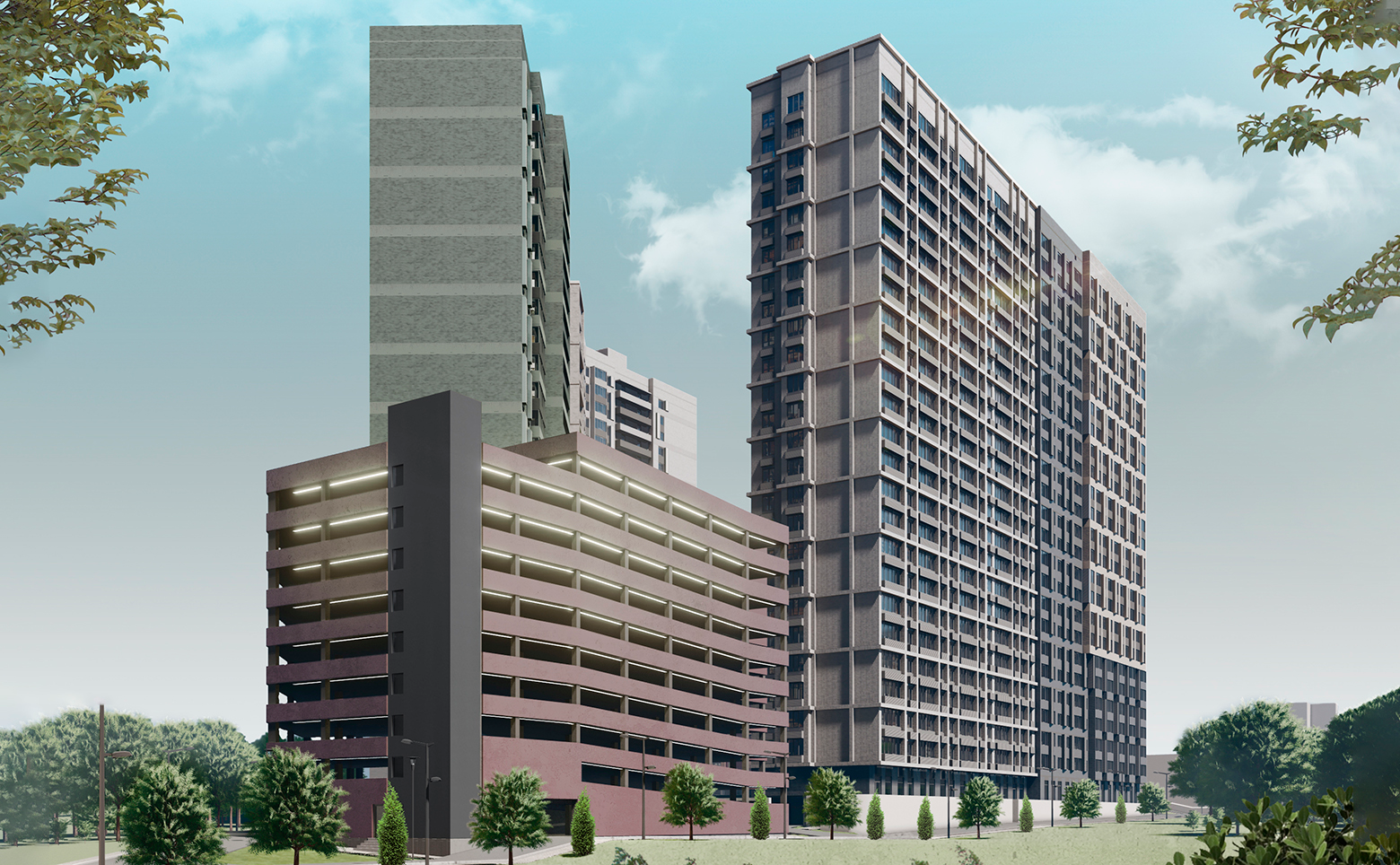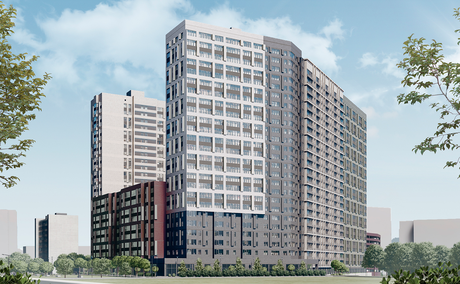 Жилой комплекс включает в себя 3 дома переменной этажности: от 9 до 25 этажей. Здания возведены по монолитной технологии строительства, фасады облицованы кирпичом. В лобби расположен консьерж-сервис и туалетная комната, спроектированы места для хранения колясок и велосипедов, лапомойка для собак.