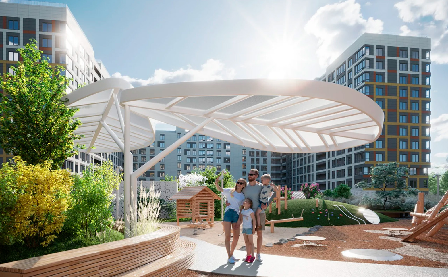 Благоустройство двора выполнено от московсковского бюро Megabudka по концепции двор без машин. В проекте предусмотрены разновозрастные детские площадки, зоны отдыха, спортивные зоны, бесплатный детский клуб, свой детский сад и школа. Территория комплекса огорожена по периметру, за охрану комплекса отвечают множество видеокамер и круглосуточная охрана. Для владельцев автомобилей предусмотрены подземный паркинг и стоянка. В подвальном этаже жилых корпусов предусмотрены индивидуальные кладовые (сити-боксы).