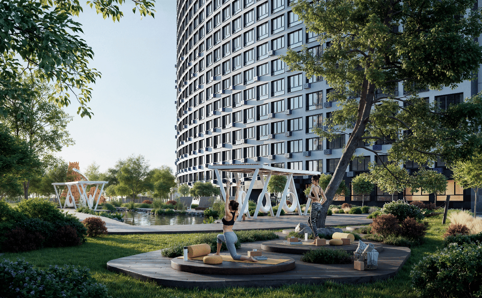 защищённое и камерное пространство для каждого жителя. Разноэтажные секции, плавно поднимаясь от 16 до 20 этажей, формируют динамичный силуэт, подчёркивая лёгкость и ритм архитектуры.