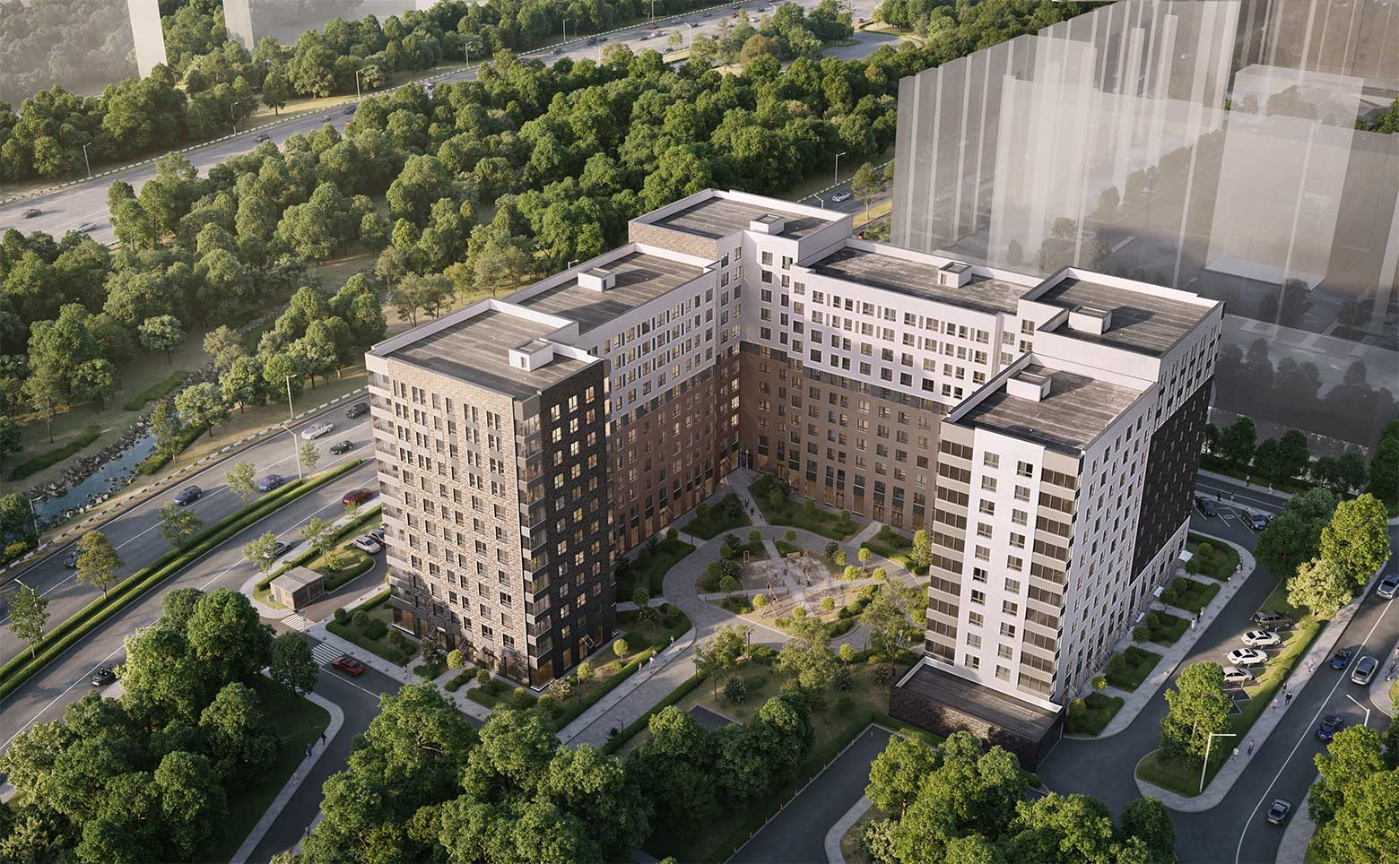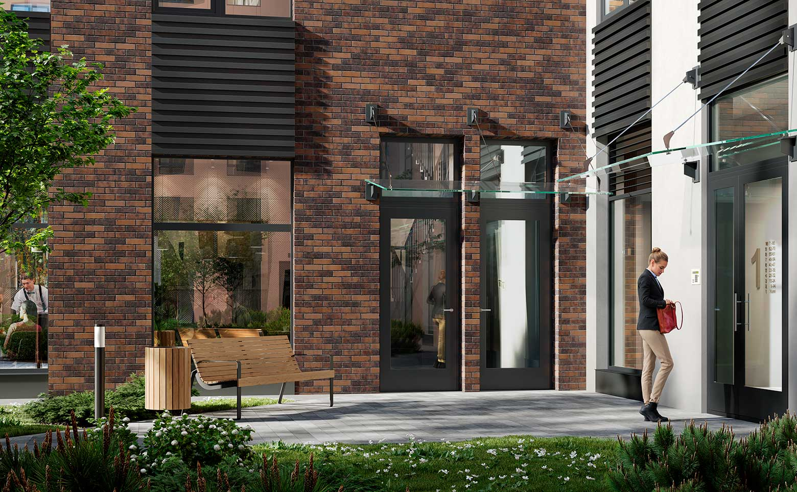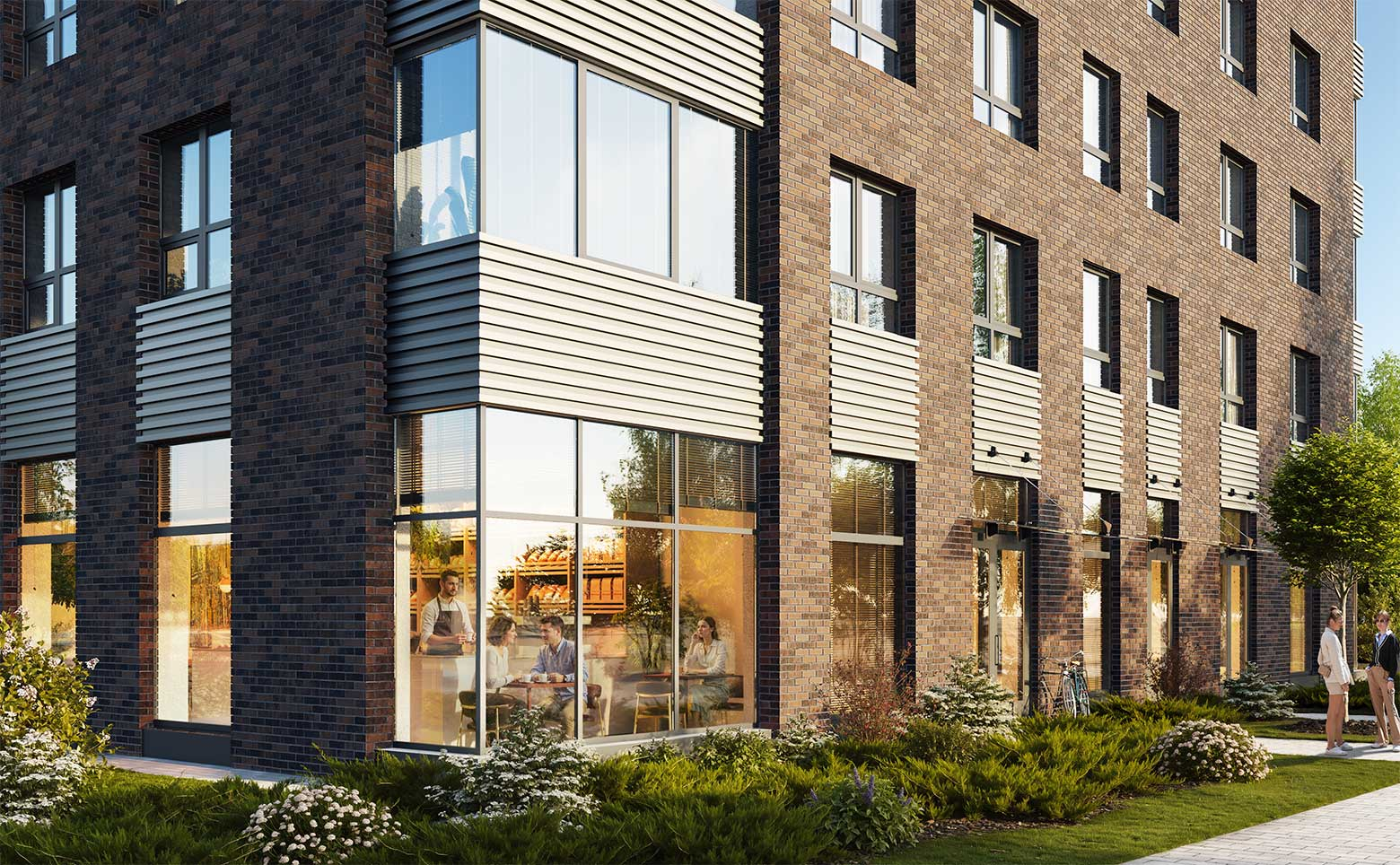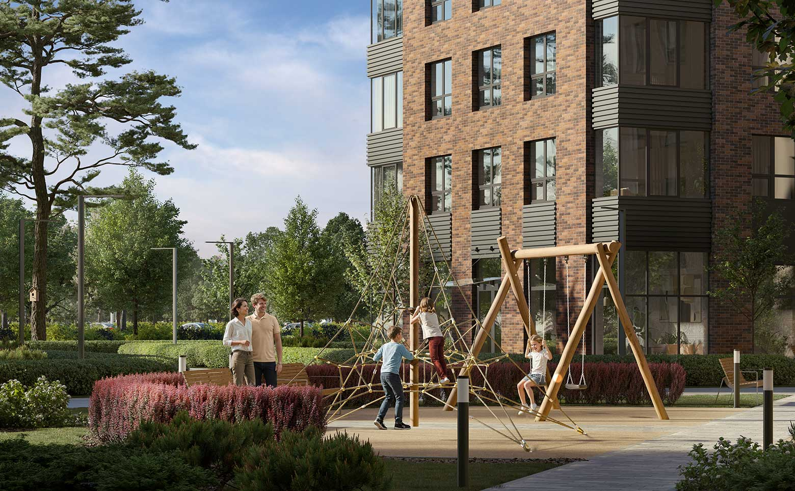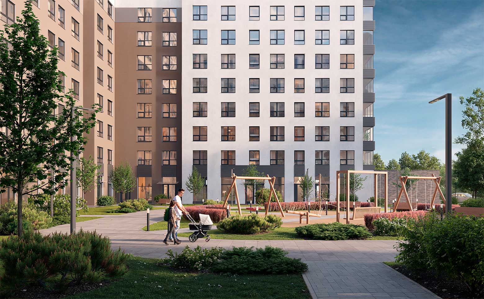 «Аквилон Солар» — фасад в английском стиле с кирпичной кладкой и акцентными металлическими вставками. Подземный паркинг с прямым спуском на лифте. Вся необходимая инфраструктура: магазины, сервисы, прогулочные зоны и благоустроенные общественные пространства. Во дворе современные детские и спортивные площадки, зоны отдыха и «умные» скамейки с солнечными батареями. В квартирах предусмотрены места для хранения.