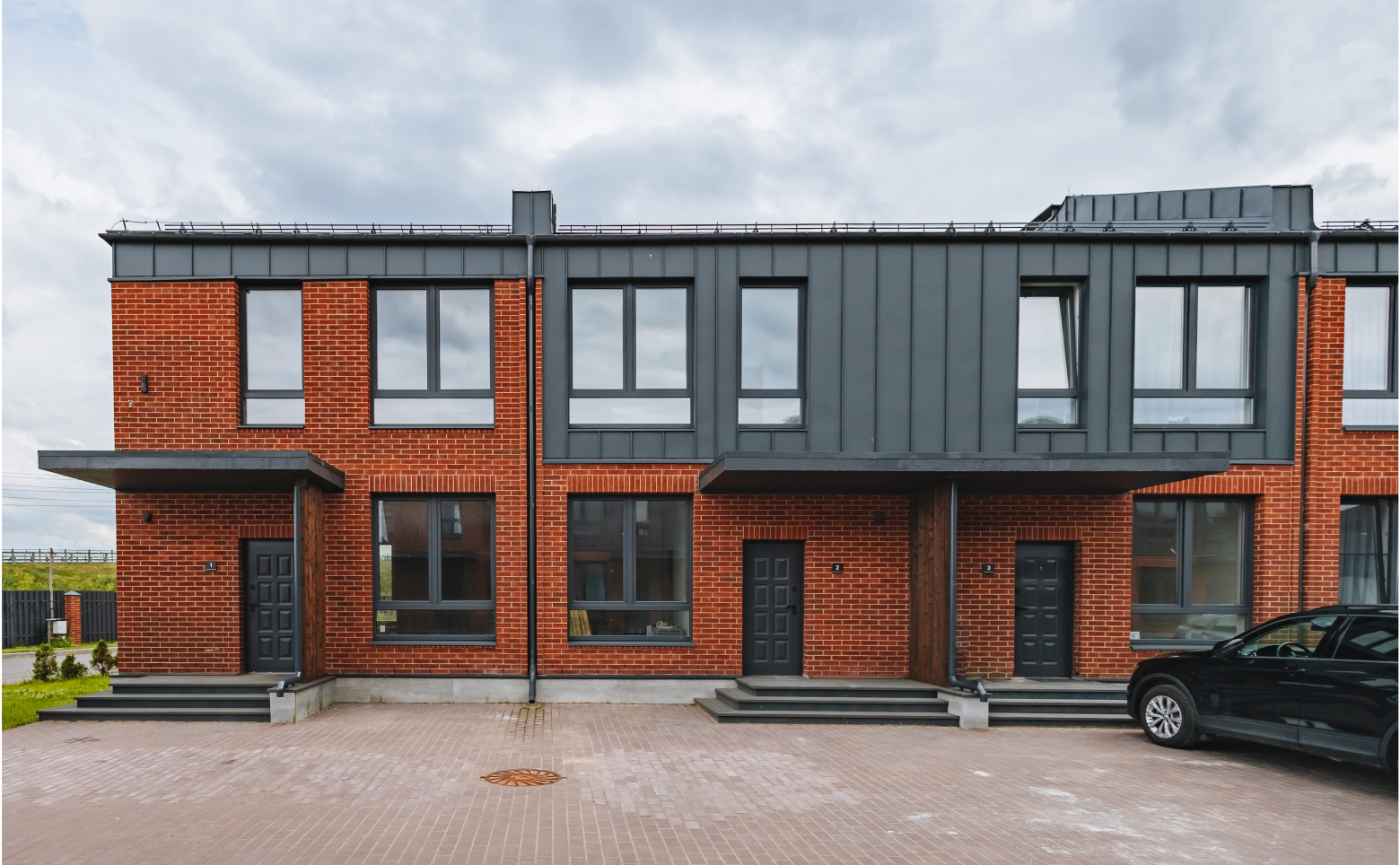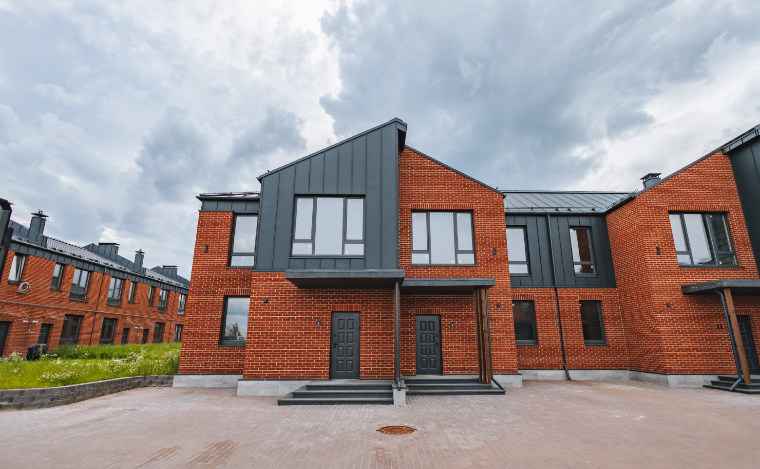 Жилой комплекс — это малоэтажные дома, построенные в едином европейском архитектурном стиле высотой в 2-3 этажа. Возведены они по газобетонной технологии строительства. В оформлении фасадов использовано 2 оттенка — красный кирпич и серый металл.