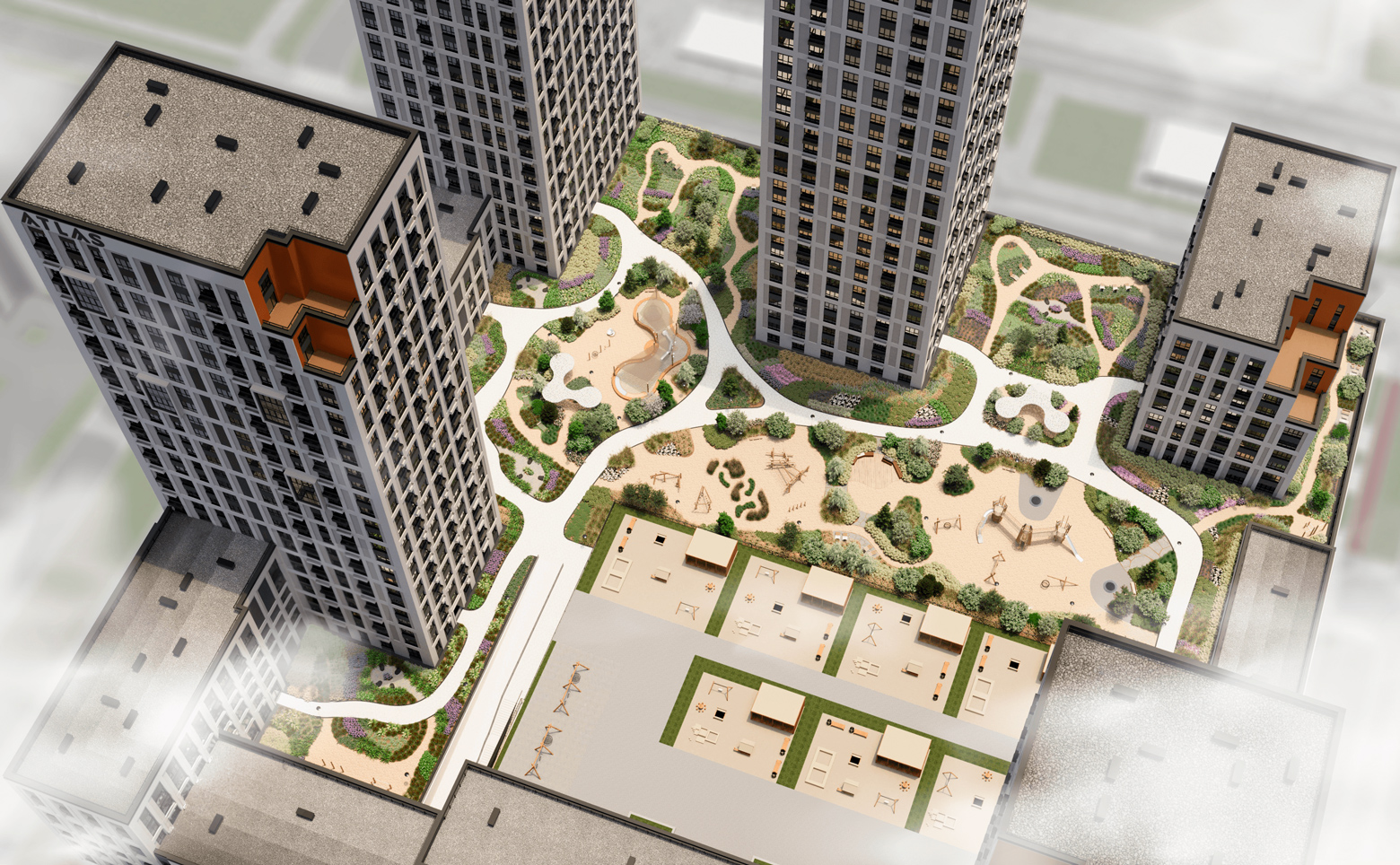 В комплексе реализована инфраструктура с акцентом на комфорт, безопасность и семейный образ жизни. Секции соединены крытым пешеходным маршрутом с внутренней галереей сервисов и коммерческих помещений. Двор поднят на уровень 8 этажа и оборудован игровыми площадками, спортивными зонами и сенсорной песочницей. Для владельцев авто предусмотрен 2-уровневый паркинг с кладовыми. Входные группы оснащены системой грязезащиты, местами для мойки лап и хранения детского транспорта. На территории действует круглосуточная охрана и видеонаблюдение.