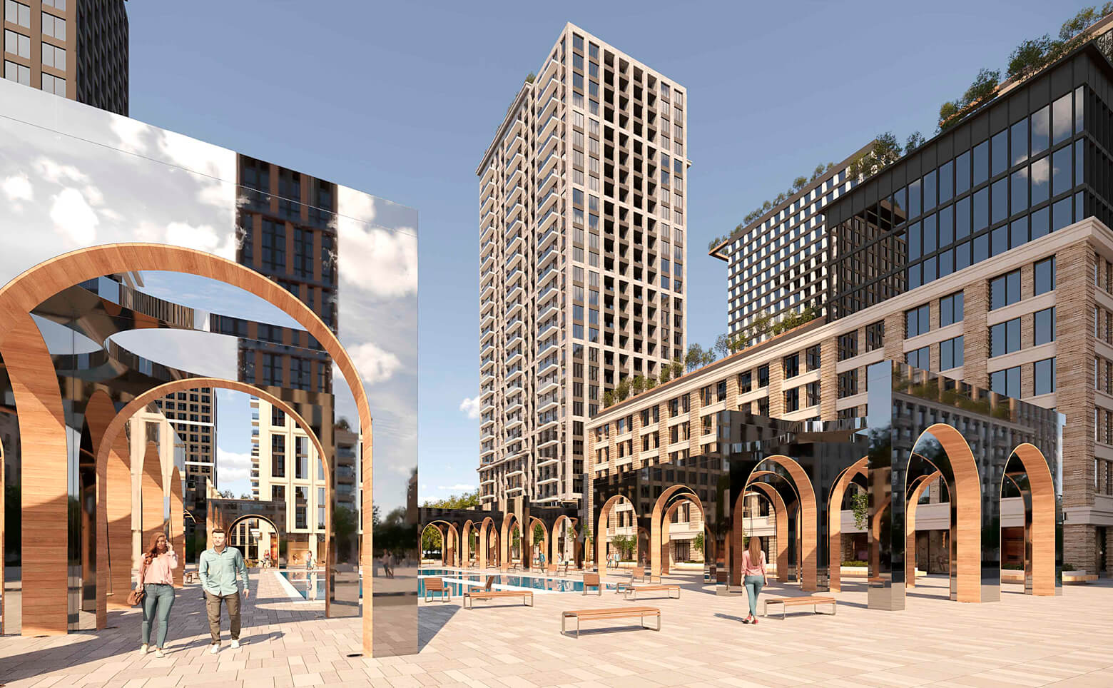 Жилой комплекс состоит из 3 корпусов высотой 27 и 28 этажей. Возведены по кирпично-монолитной технологии строительства с фасадами из комбинированных материалов. В лобби предусмотрено рабочее место для сотрудника консьерж-сервиса, мягкая зона ожидания с диванами и креслами, коворкинг и игровая зона для детей. Места общего пользования разделены на зоны, предусмотрен дополнительный вход со стороны парковочной зоны. В каждом доме продуманы колясочные для хранения детского инвентаря и специально оборудованные места для мойки лап домашних животных и велосипедов. В каждой секции установлены 4 скоростных бесшумных лифа — пассажирские и грузовые.